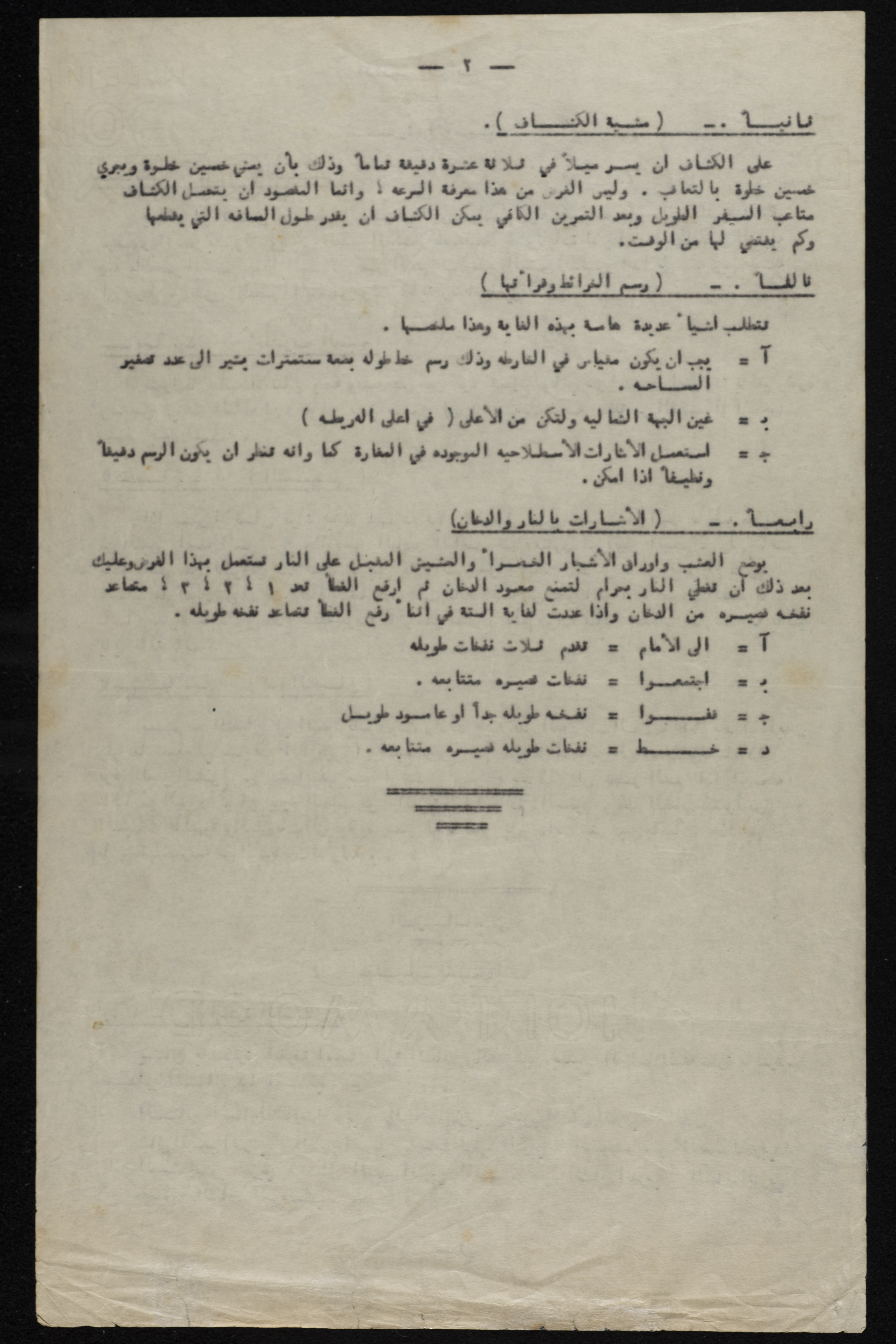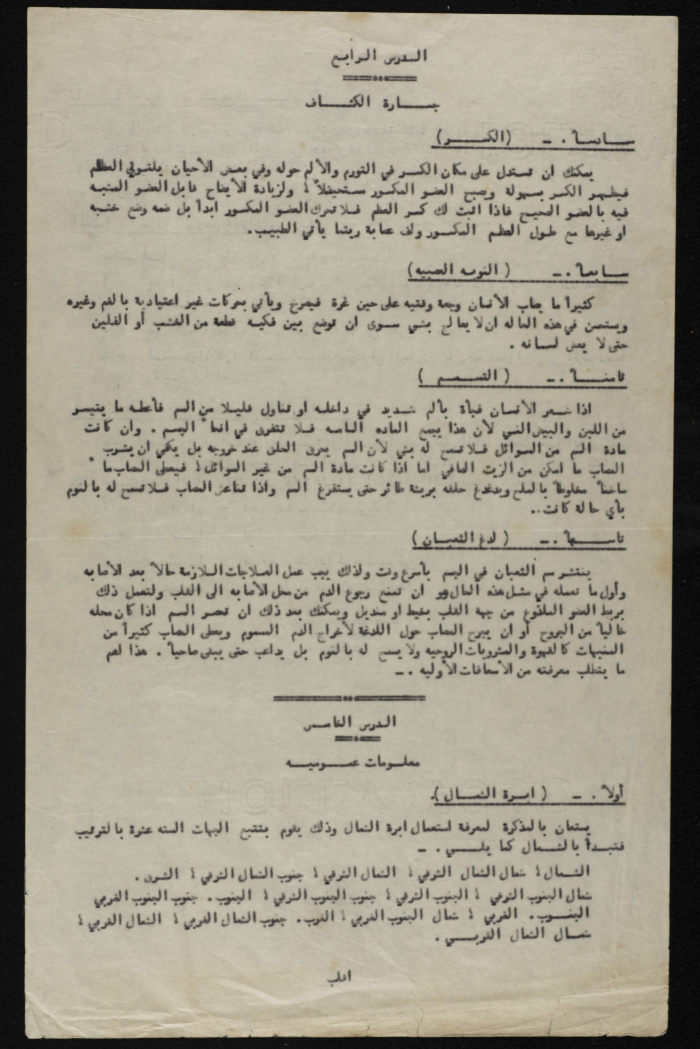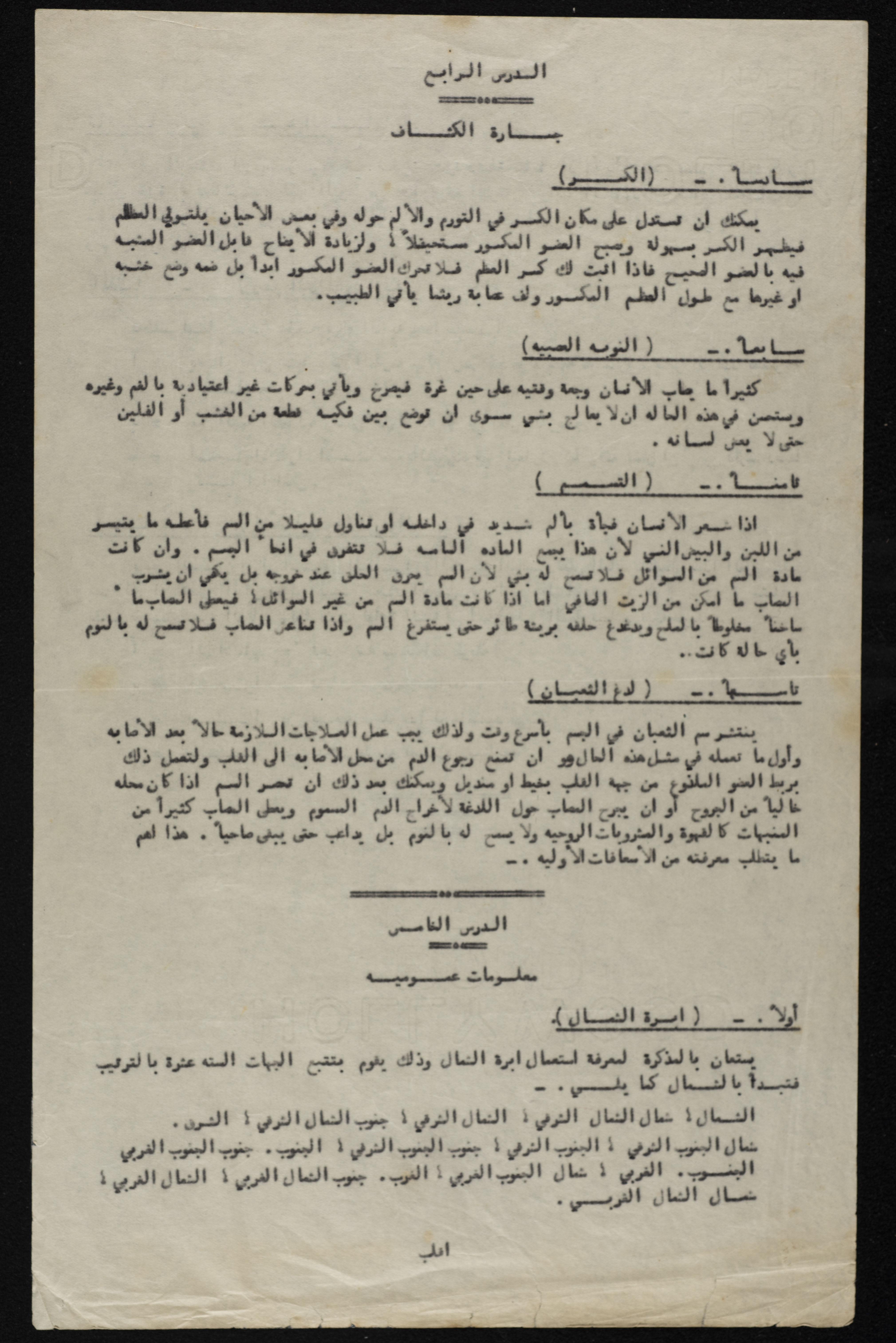 Printed in Arabic, this informative text distributed among the members of Sareyyet Ramallah is about broken bones, seizures, poisoning, snake bites, and other general information.