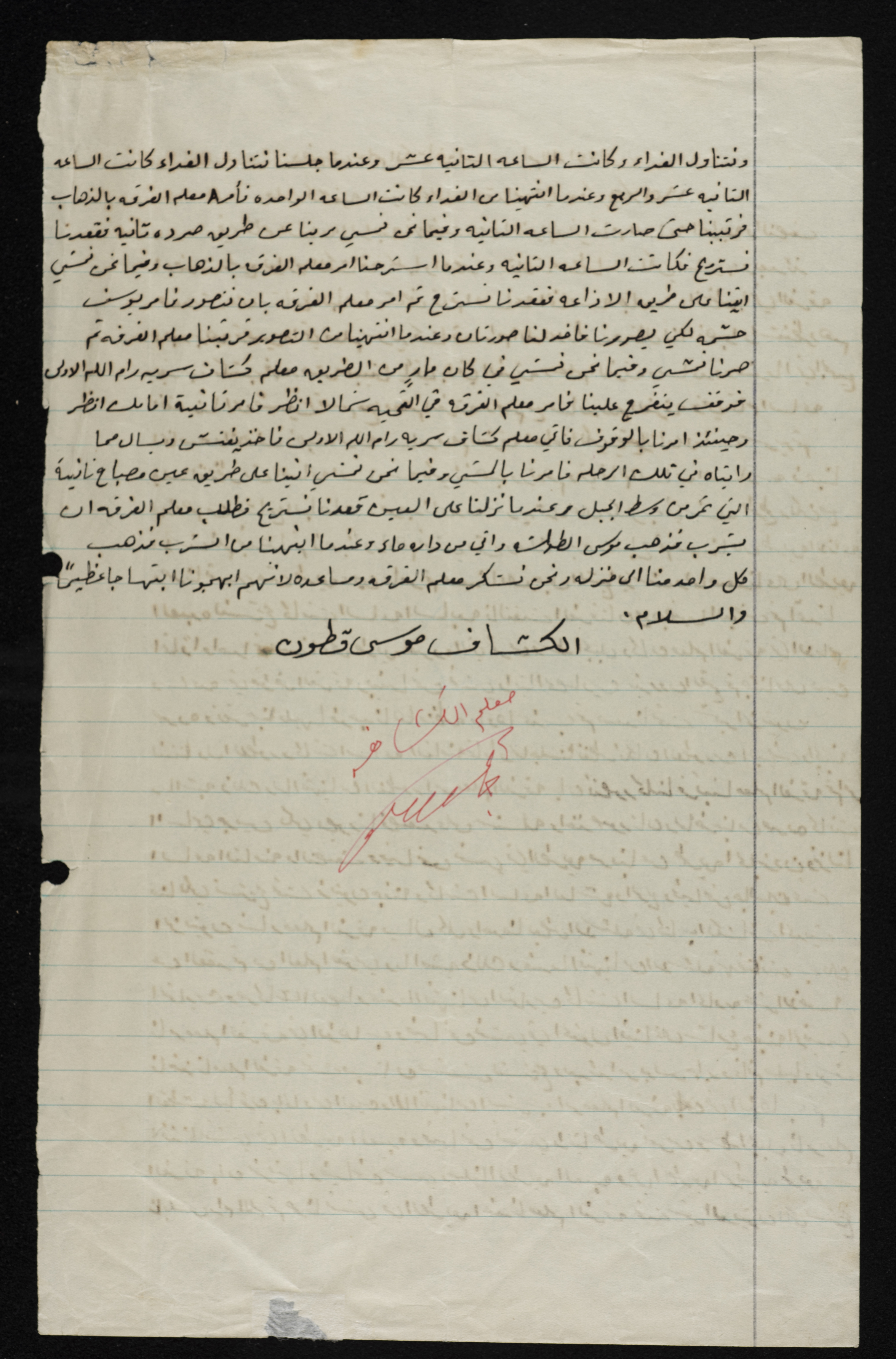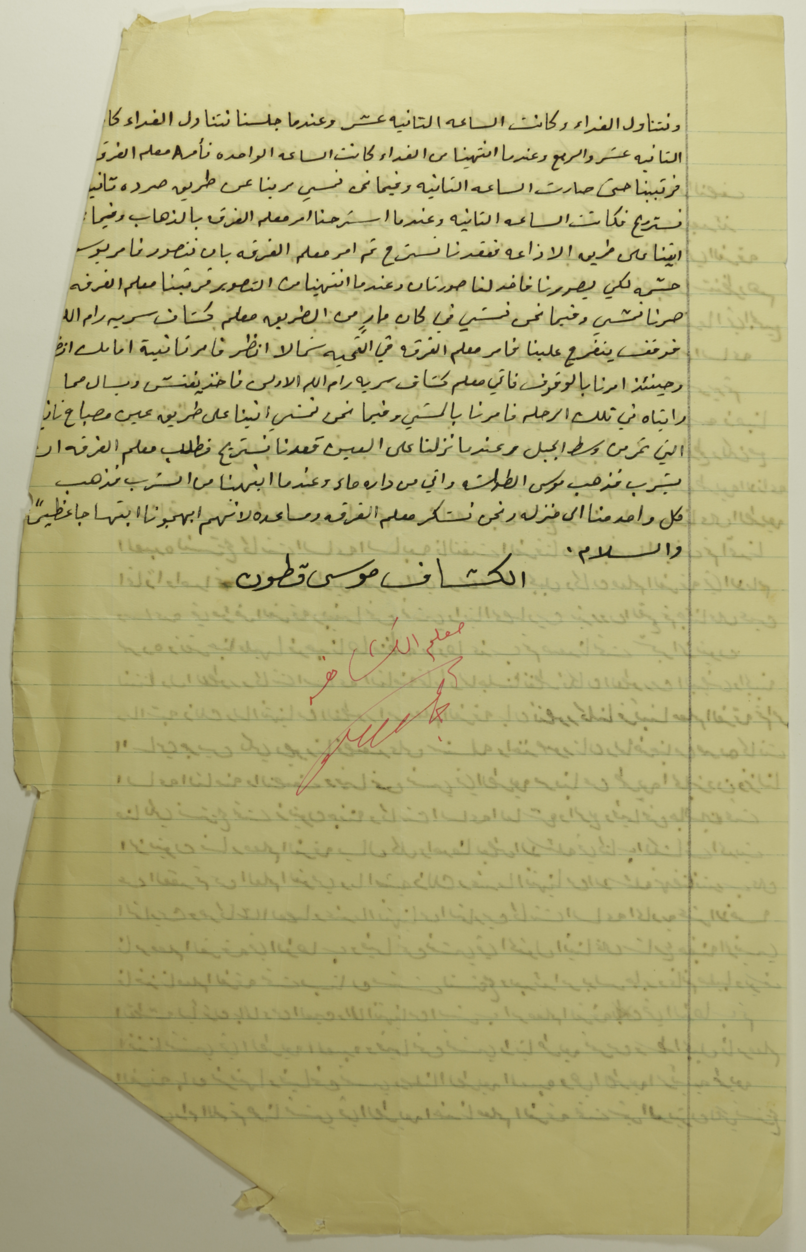 Handwritten in Arabic, this report is on Sareyyet Ramallah's scout trip by foot on June 17, 1951.
