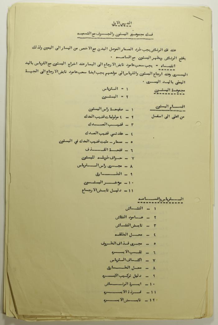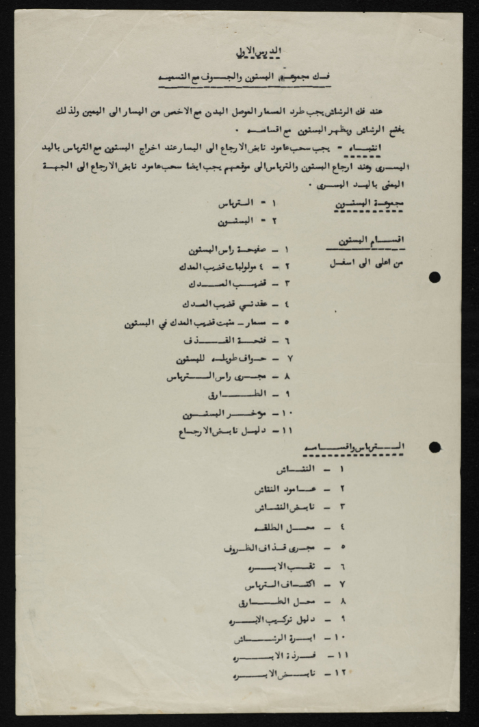 Printed in Arabic, this informative text distributed among the members of Sareyyet Ramallah provides basic knowledge on disassembling the piston group in machine guns and naming the various components.