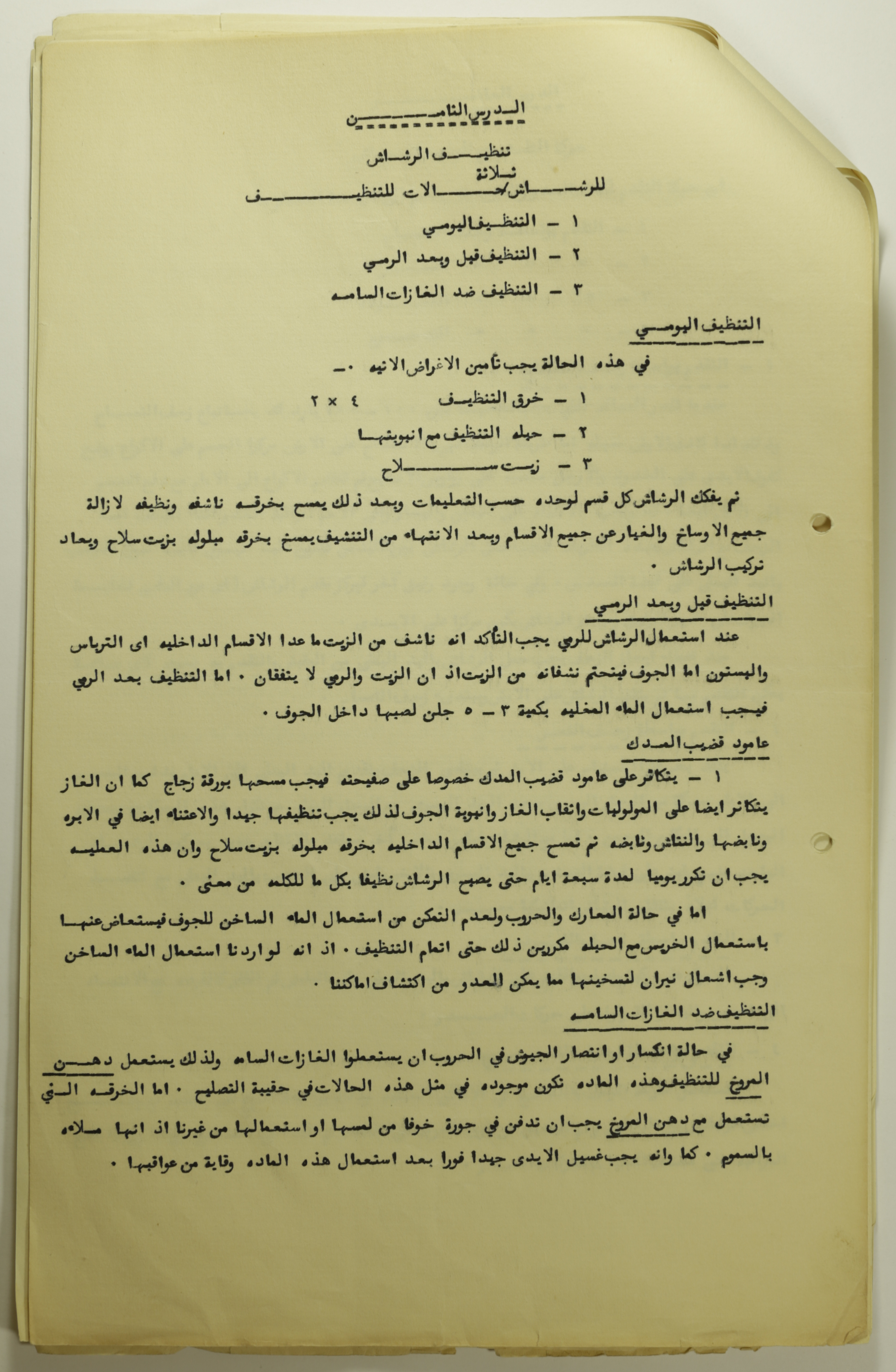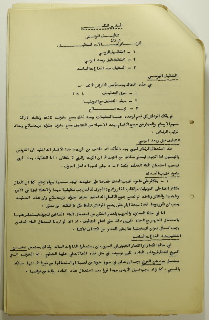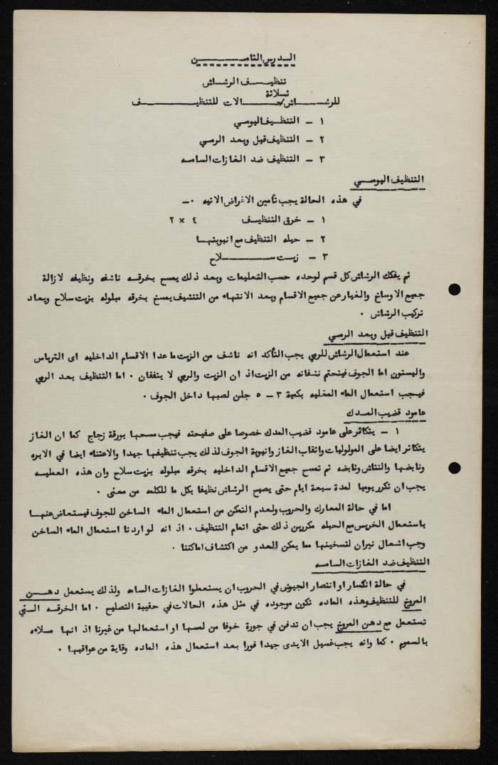 Printed in Arabic, this informative text distributed among the members of Sareyyet Ramallah provides information on how to safely clean a machine gun.
