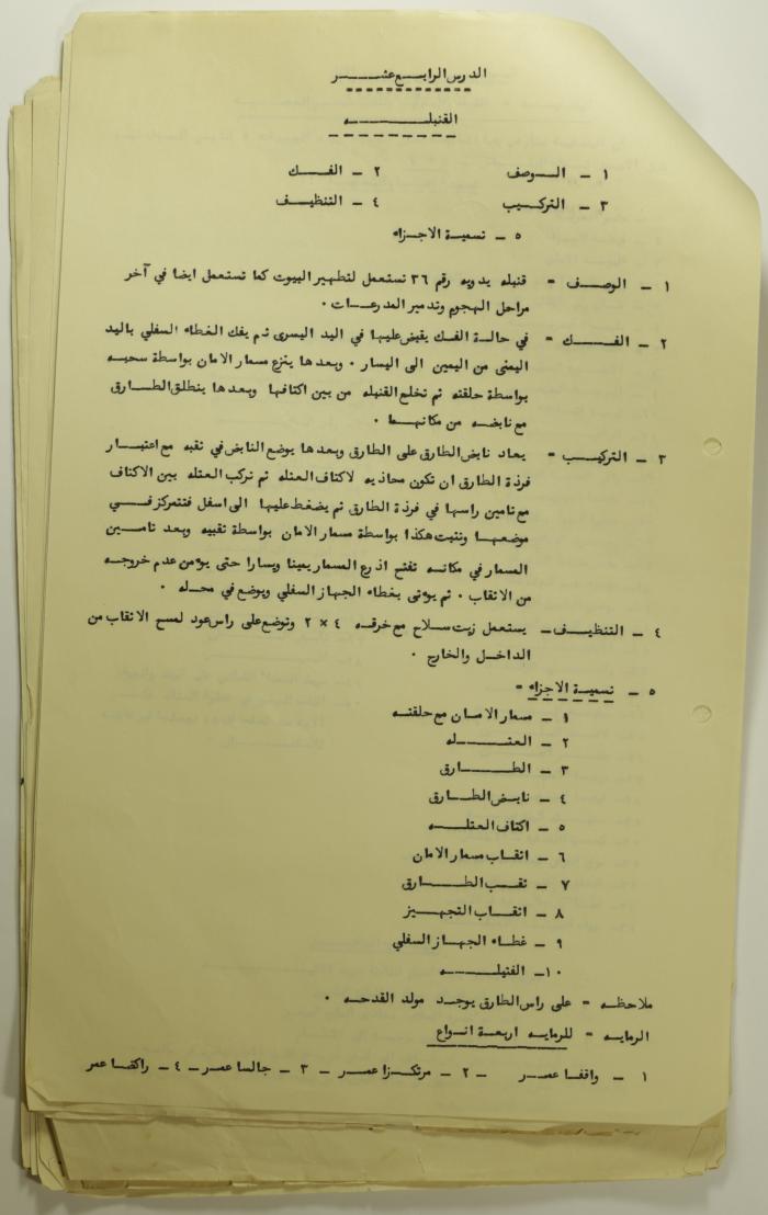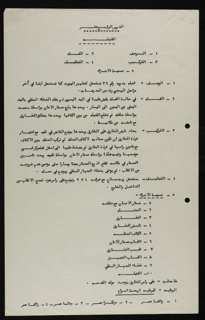 Printed in Arabic, this informative text distributed among the members of Sareyyet Ramallah is about the grenade—description, disassembly, assembly, cleaning, and components.