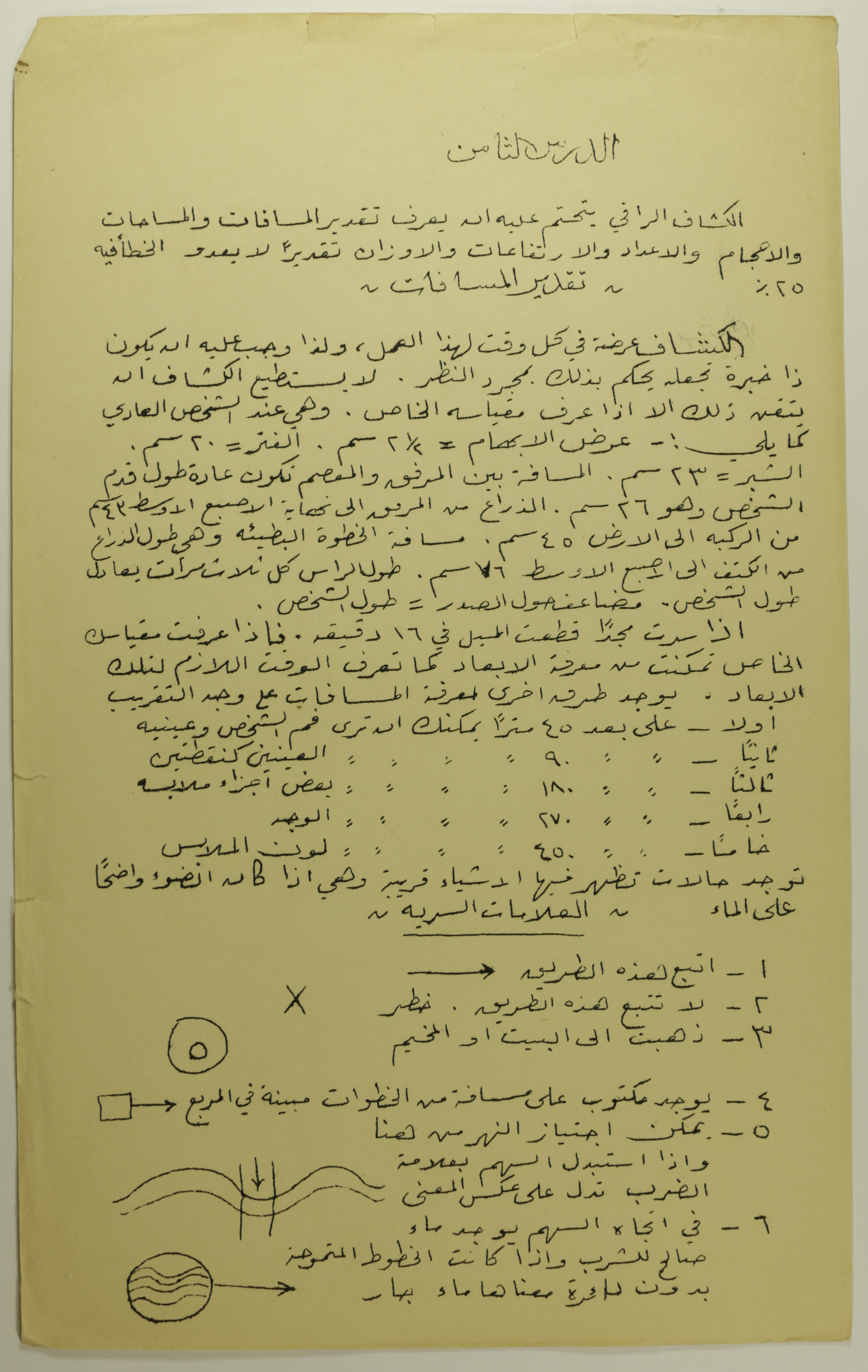 .وثيقة مطبوعة باللغة العربية، تتضمن درس تثقيفي لمشتركين في كشافة سرية رام الله الاولى حول تقدير المسافات والمساحات والاحجام والاعداد والارتفاعات والاوزان
