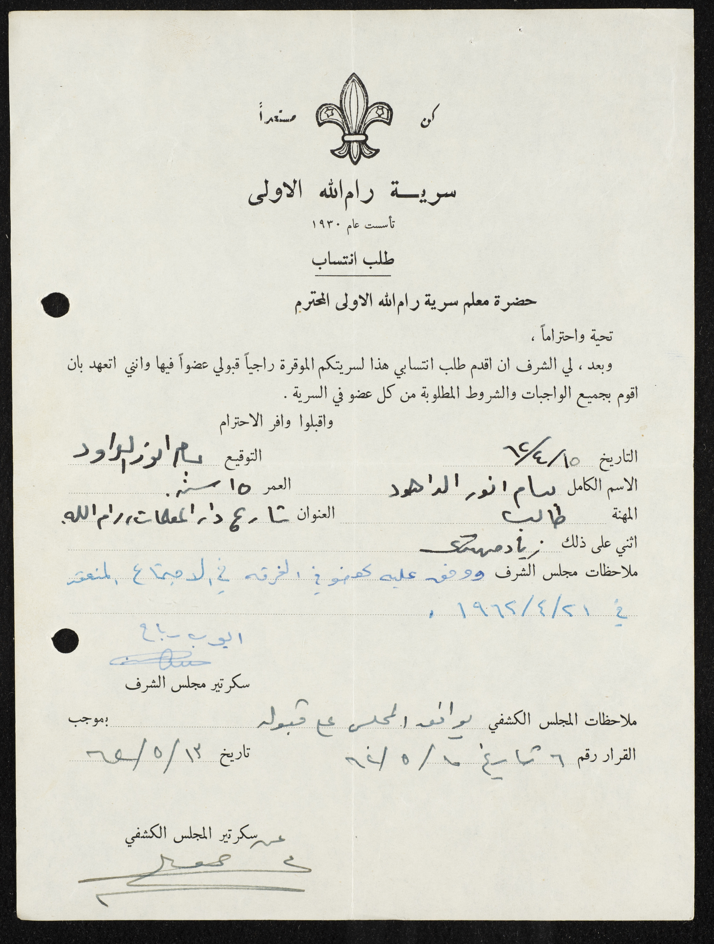 وثيقة مطبوعة باللغة العربية، تتضمن طلب انتساب مقدم من بام انور الداهود الى سرية رام الله ليصبح عضوا فيها ويتعهد في قيام جميع الاعمال والواجبات والشروط المطلوبة عام 1962