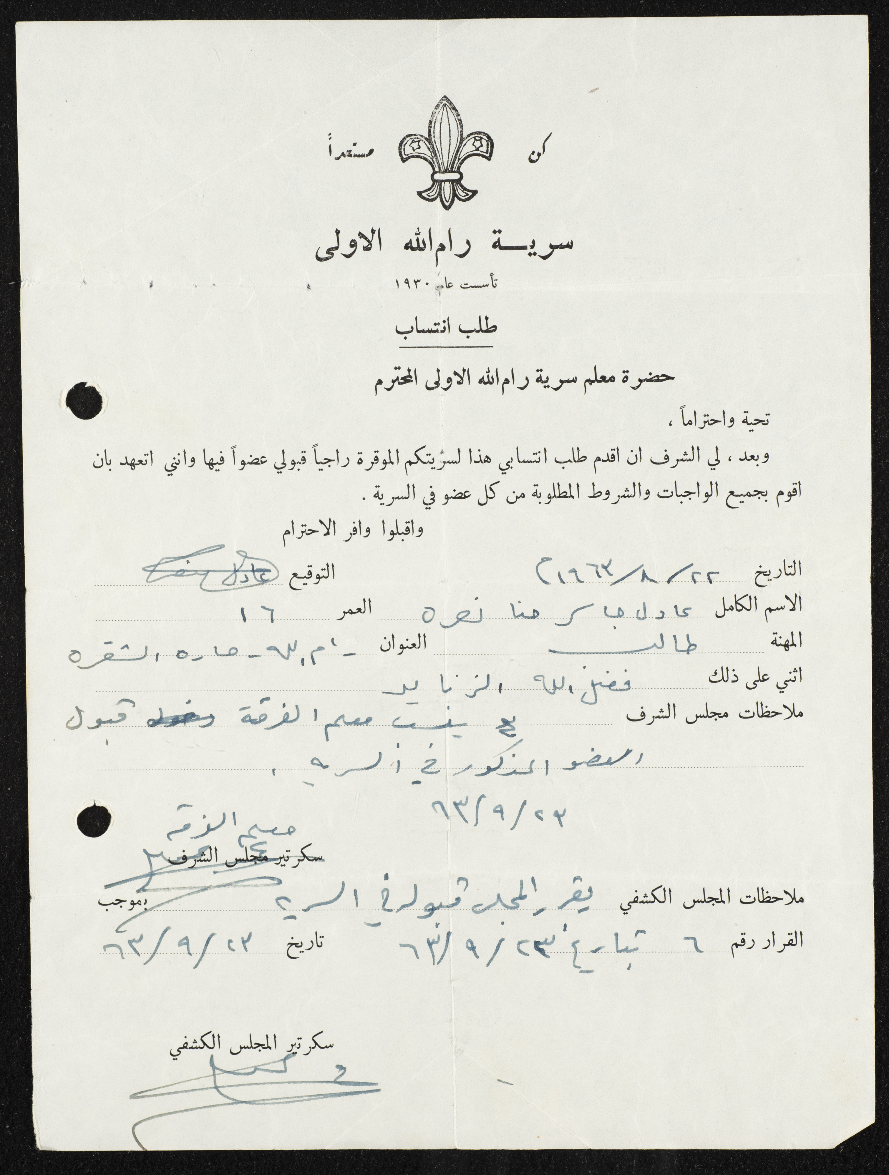 وثيقة مطبوعة باللغة العربية، تتضمن طلب انتساب مقدم من عادل حنا الى سرية رام الله ليصبح عضوا فيها ويتعهد في قيام جميع الاعمال والواجبات والشروط المطلوبة عام 1963