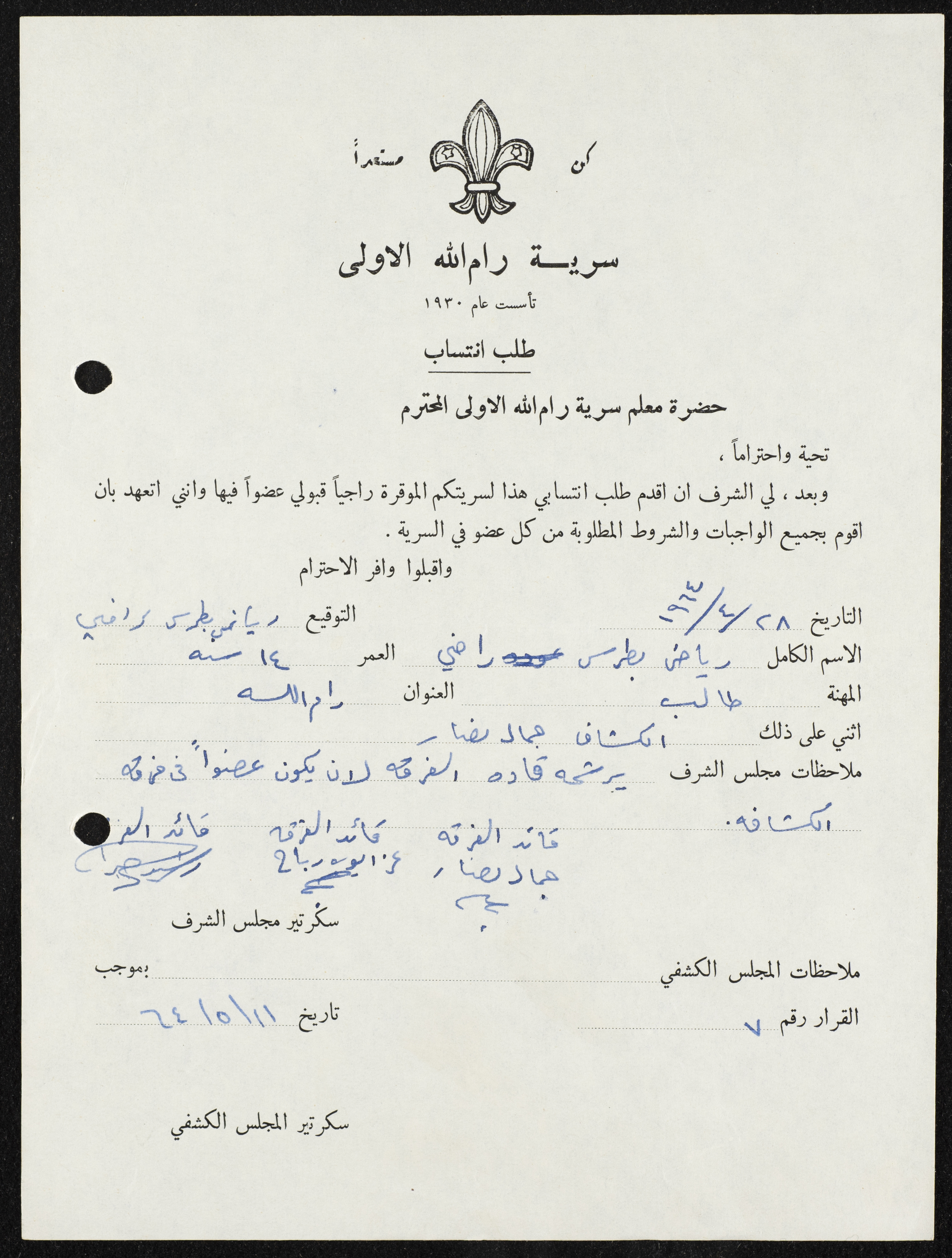 وثيقة مطبوعة باللغة العربية، تتضمن طلب انتساب مقدم من رياض راضي الى سرية رام الله ليصبح عضوا فيها ويتعهد في قيام جميع الاعمال والواجبات والشروط المطلوبة عام 1964