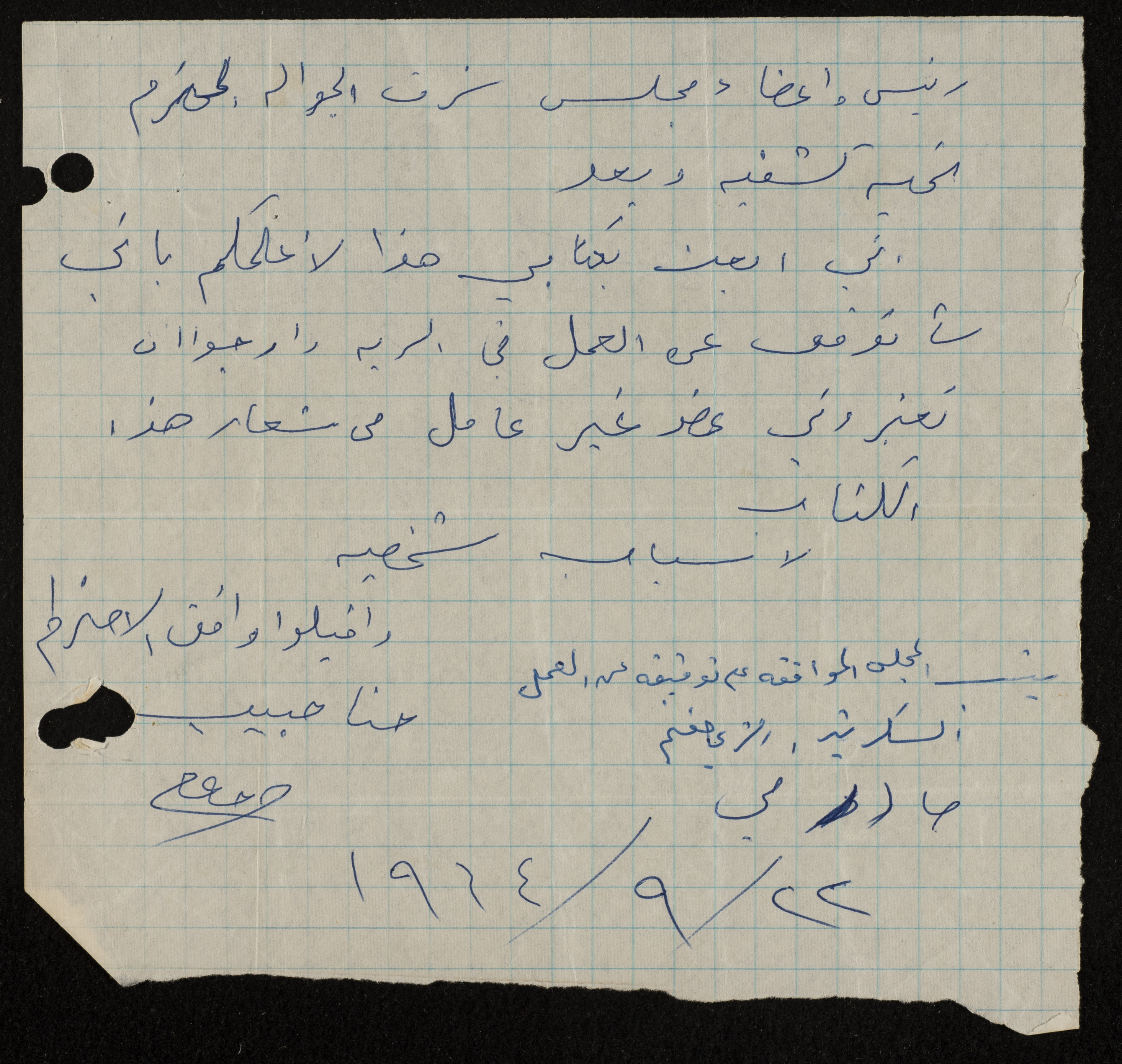 وثيقة مكتوبة باللغة العربية، تتضمن طلب انتساب مقدم من حنا حبيب الى سرية رام الله ليصبح عضوا فيها ويتعهد في قيام جميع الاعمال والواجبات والشروط المطلوبة عام 1964