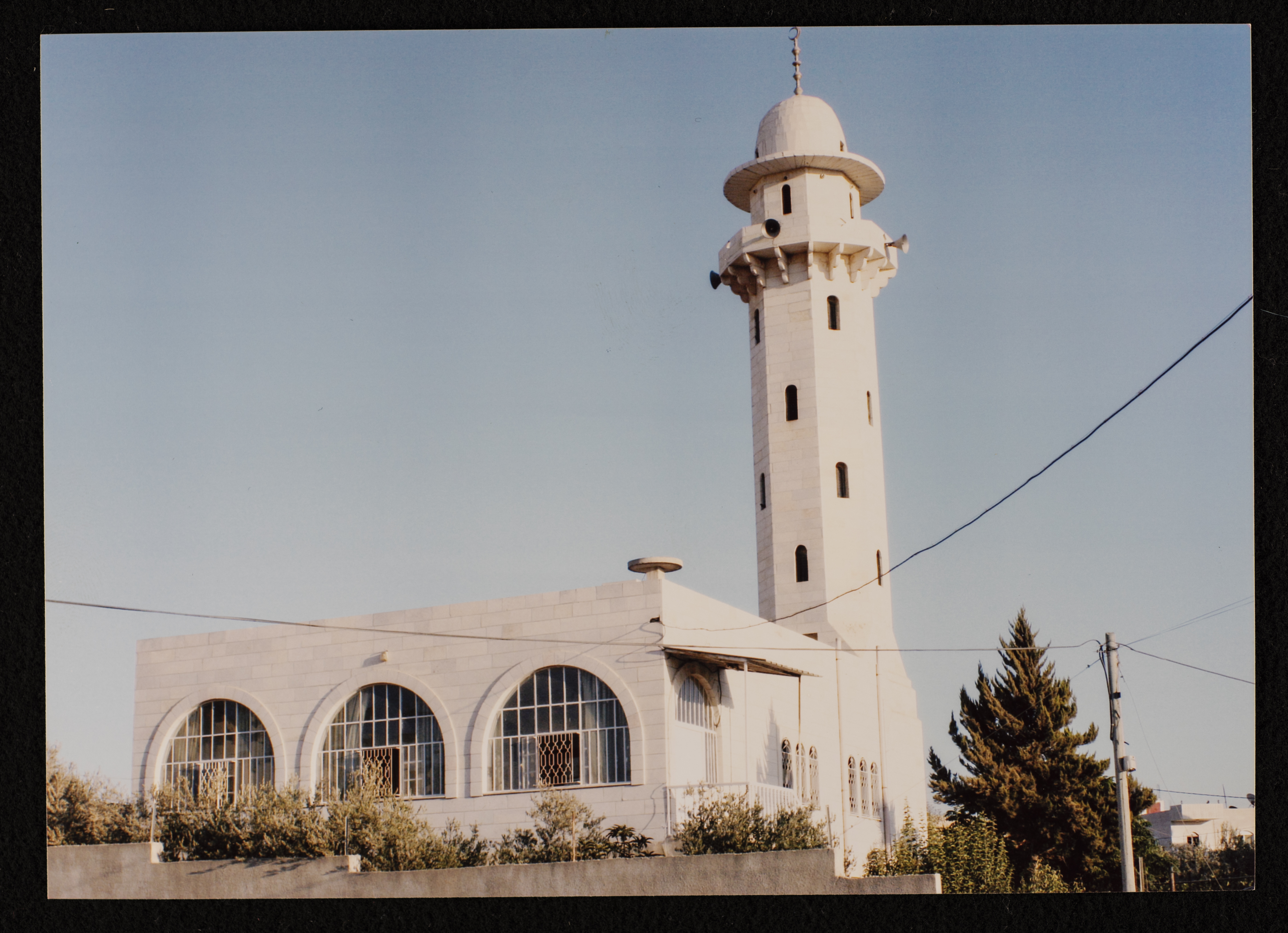 Found in Al Sanabel Center for the Study of the Palestinian Popular Heritage Collection, this is a colour photograph of Saʿd bin Muʿadh Mosque in Bayt 'Anun northeast of Hebron. The mosque, which is managed by the Ministry of Awqaf and Religious Affairs, was built in 1997.