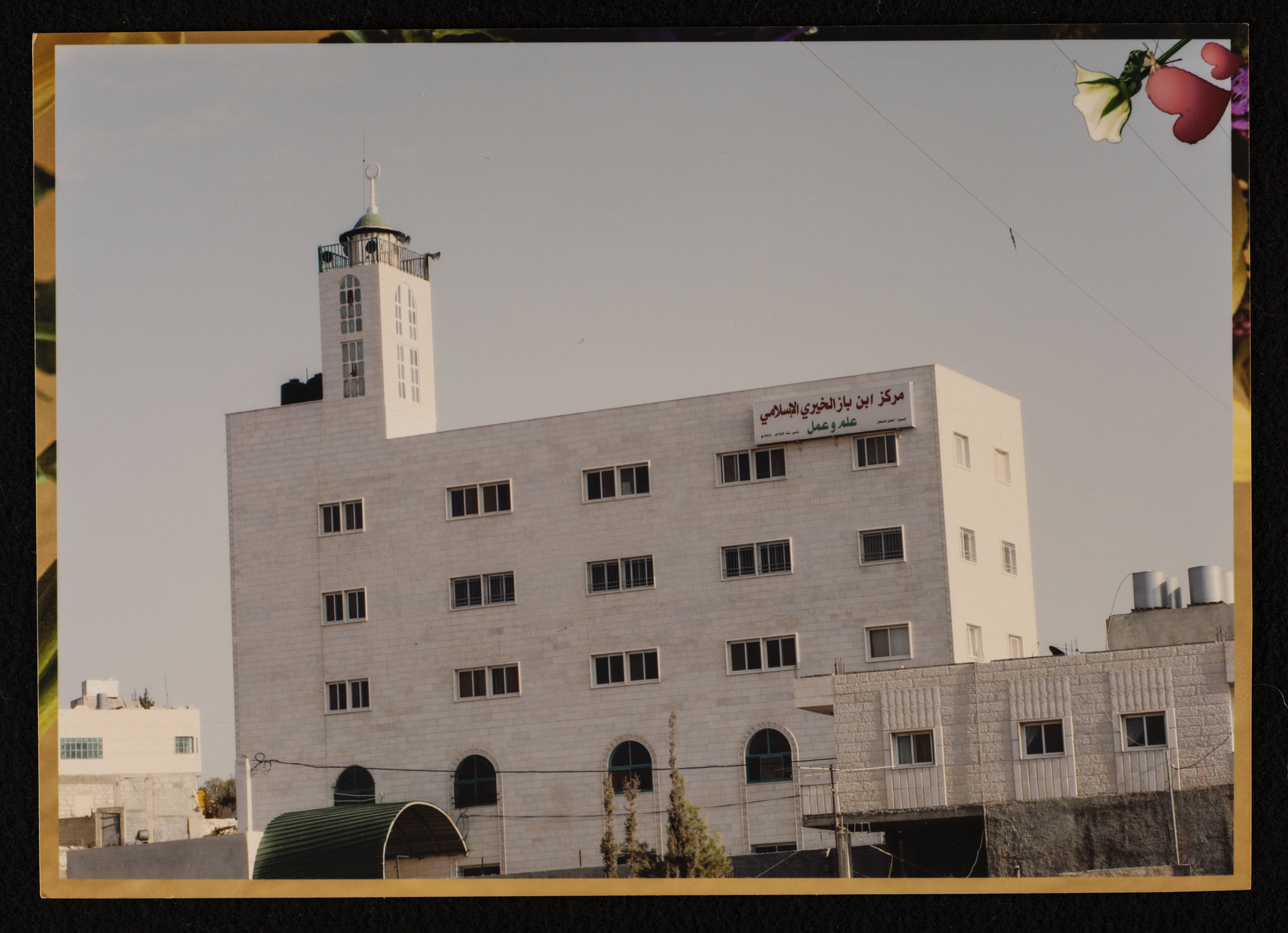 Found in Al Sanabel Center for the Study of the Palestinian Popular Heritage Collection, this is a colour photograph of Ibn Baz Charitable Islamic Center in as-Samu' south of Hebron. Built in 2003, the Centre has five floors that are occupied by al-Haramayn School, Ibn Baz Mosque, the administrative offices, al-YanabiʿClub, ar-Rayhan Quran Memorisation Centre, and a public library with audio, visual, and written resources.