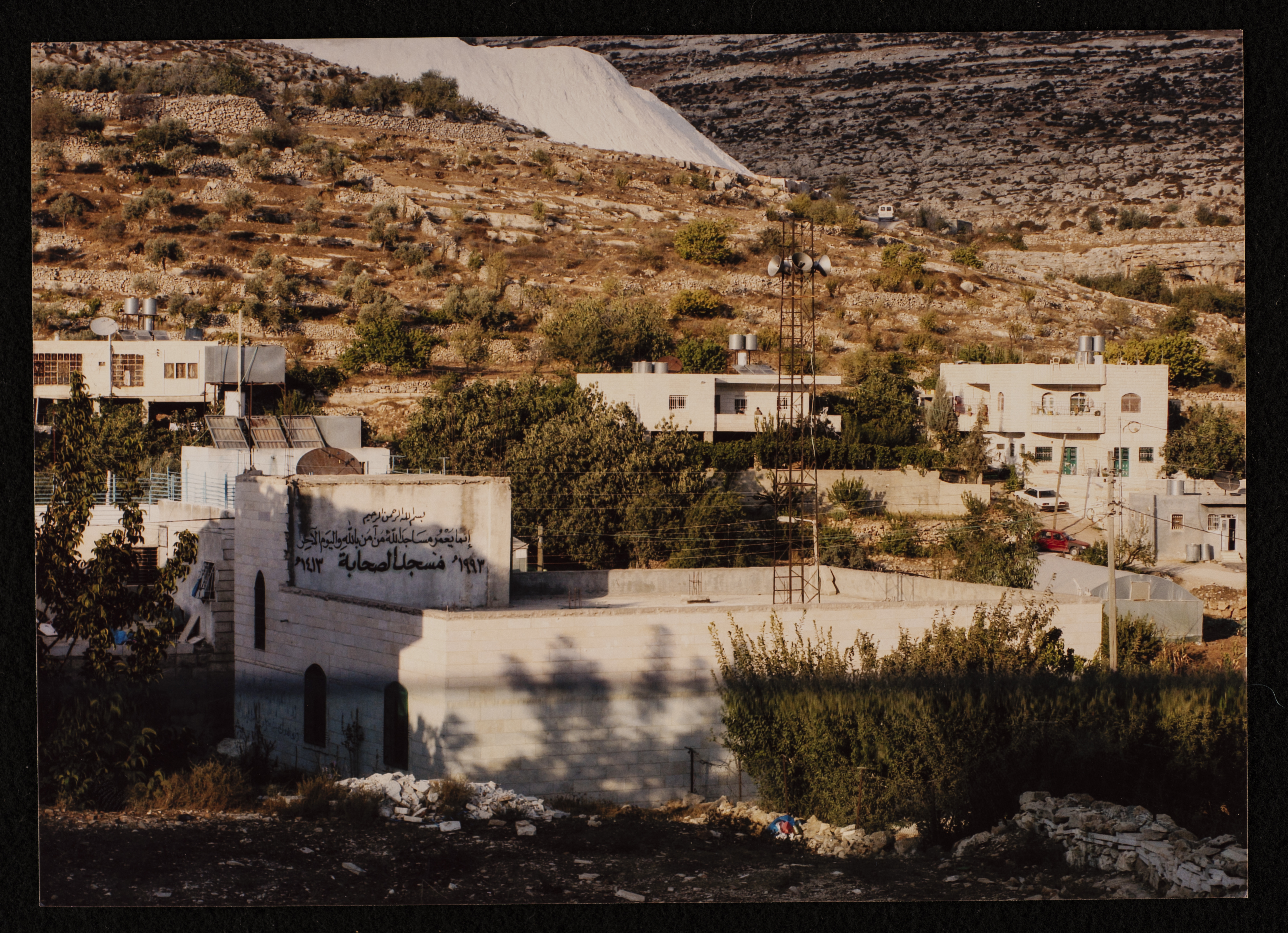 Found in Al Sanabel Center for the Study of the Palestinian Popular Heritage Collection, this is a colour photograph of Aṣ-Ṣahaba Mosque in Shuyukh al-Arrub northeast of Hebron. The mosque, which is managed by the Ministry of Awqaf and Religious Affairs, was built in 1993.