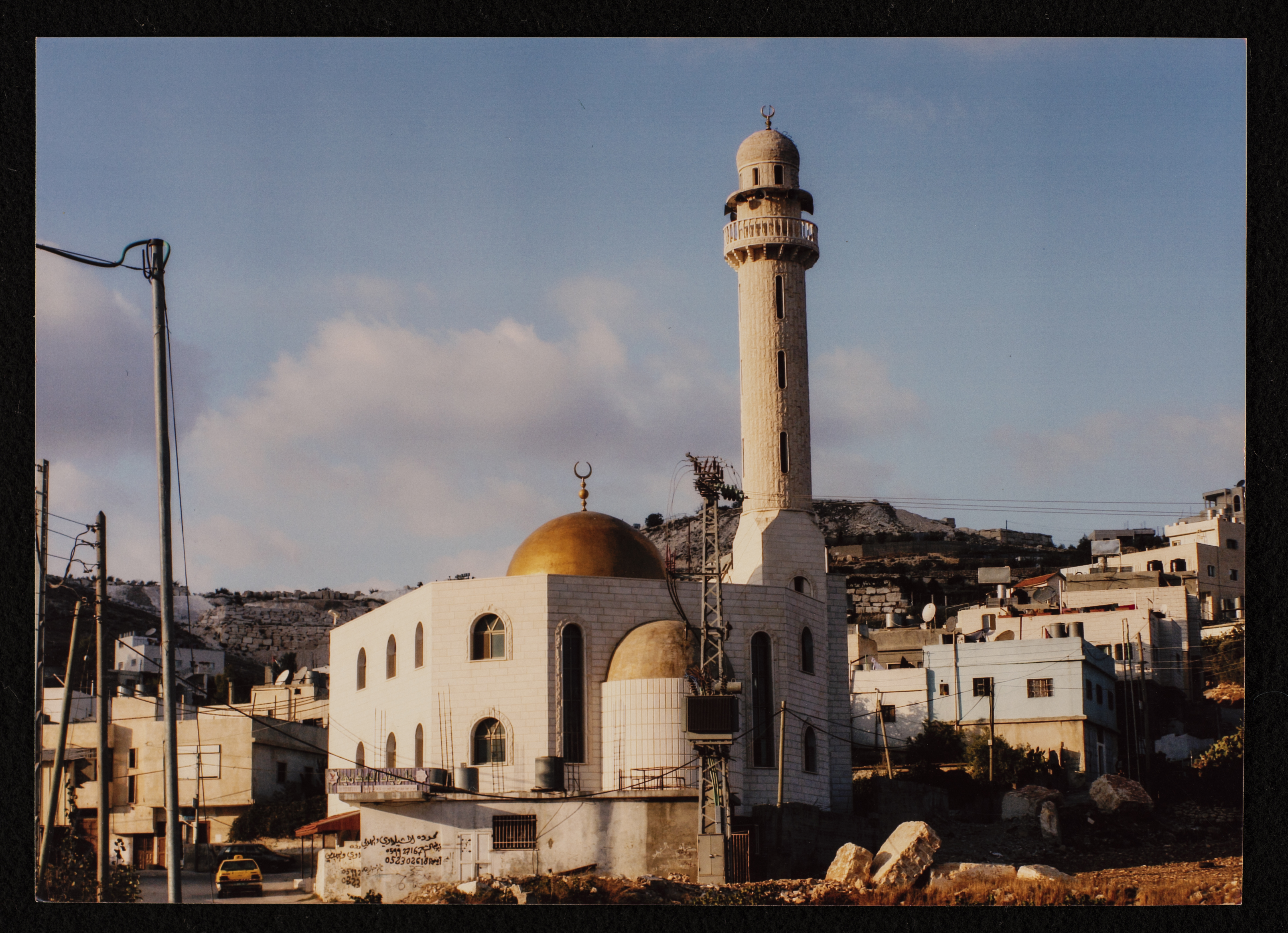 Found in Al Sanabel Center for the Study of the Palestinian Popular Heritage Collection, this is a colour photograph of al-Arroub Eastern Mosque in Arroub Palestinian Refugee Camp outside of Hebron. The mosque, which is managed by the Ministry of Awqaf and Religious Affairs, was built in 1986.