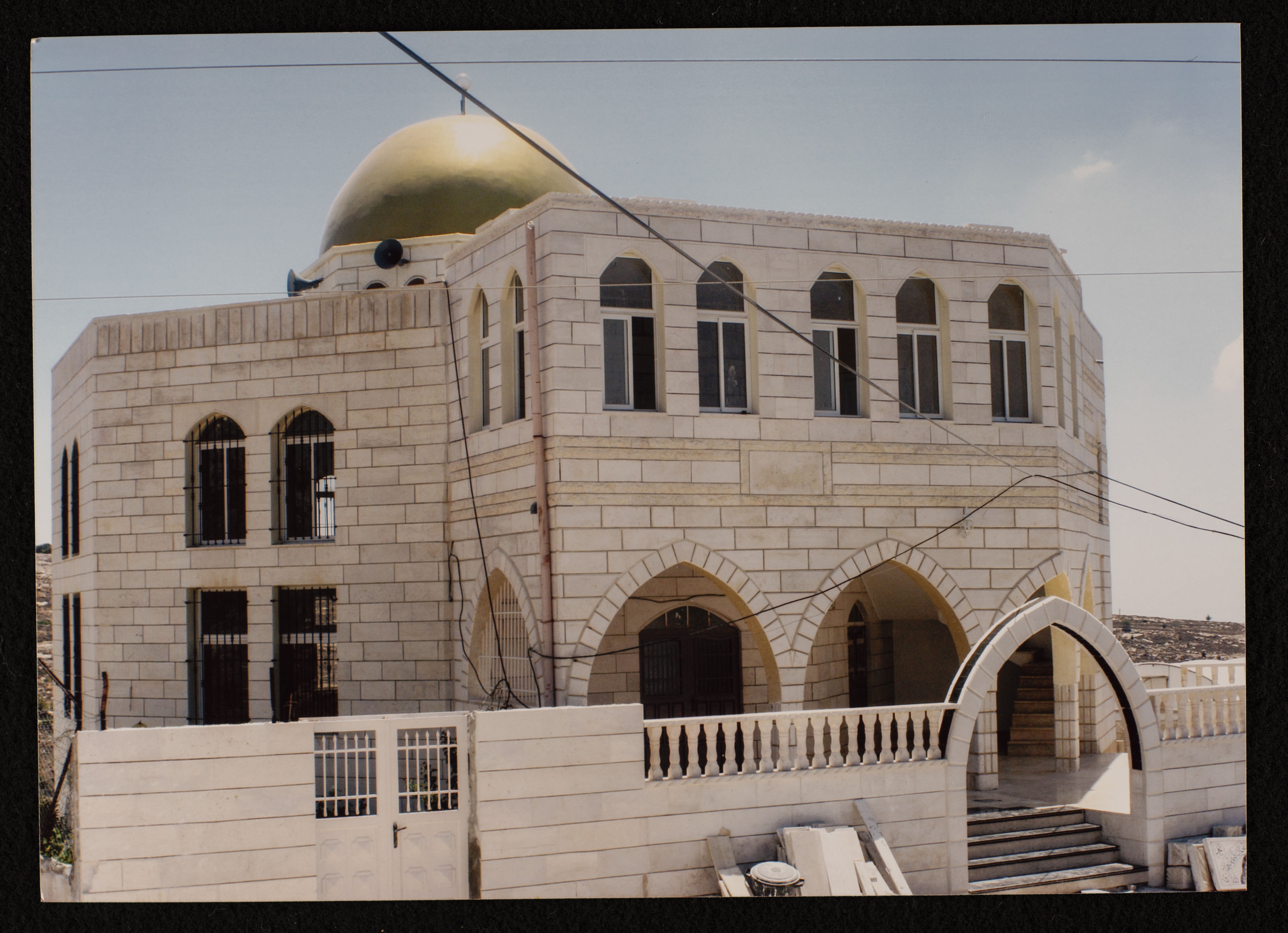 Found in Al Sanabel Center for the Study of the Palestinian Popular Heritage Collection, this is a colour photograph of the Shuhada' Mosque in Beit Kahil northwest of Hebron. The mosque, which is managed by the Ministry of Awqaf and Religious Affairs, was built in 1995.