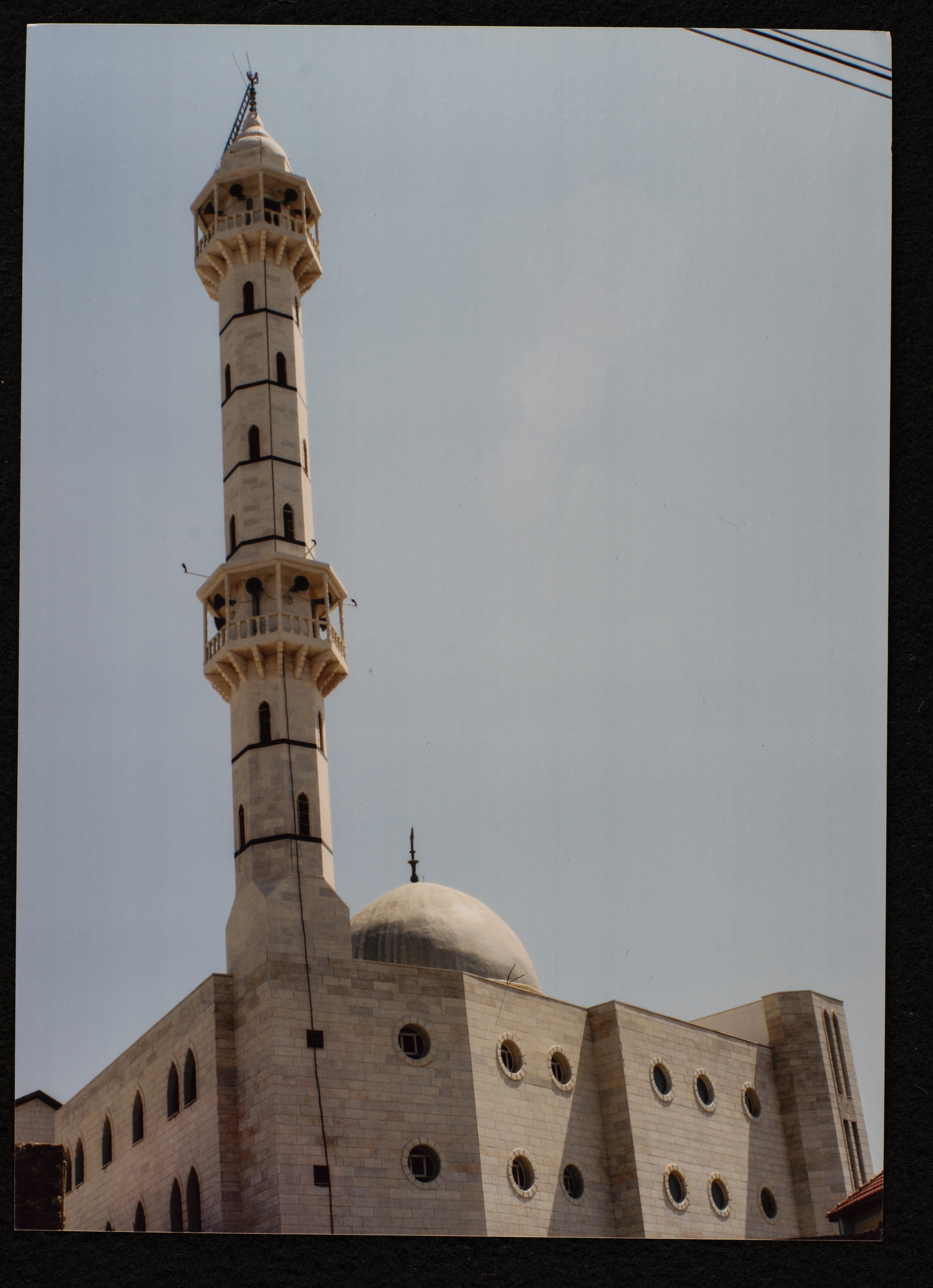 Found in Al Sanabel Center for the Study of the Palestinian Popular Heritage Collection, this is a colour photograph of al-Umary Mosque (Beit Ula Grand Mosque) in Beit Ula northwest of Hebron. The mosque, which is managed by the Ministry of Awqaf and Religious Affairs, was built in 1988.