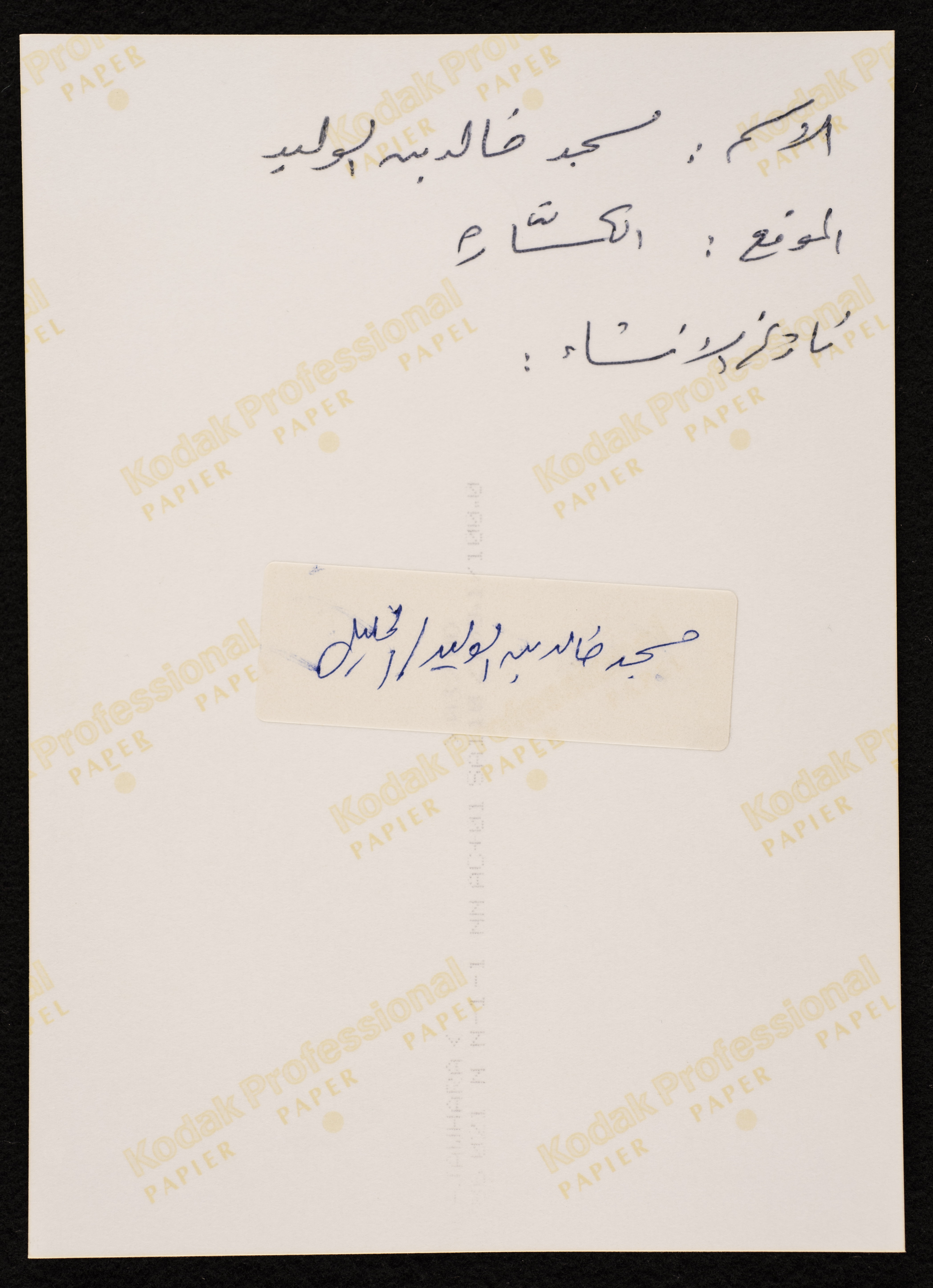 صورة ملونة لمسجد خالد بن الوليد في منطقة الكسّارة في الخليل، بُني المسجدة سنة 1983 وهو تابع لوزارة الأوقاف والشؤون الدينية. وُجدت الصورة ضمن مجموعة مركز السنابل للدراسات والتراث الشعبي.
