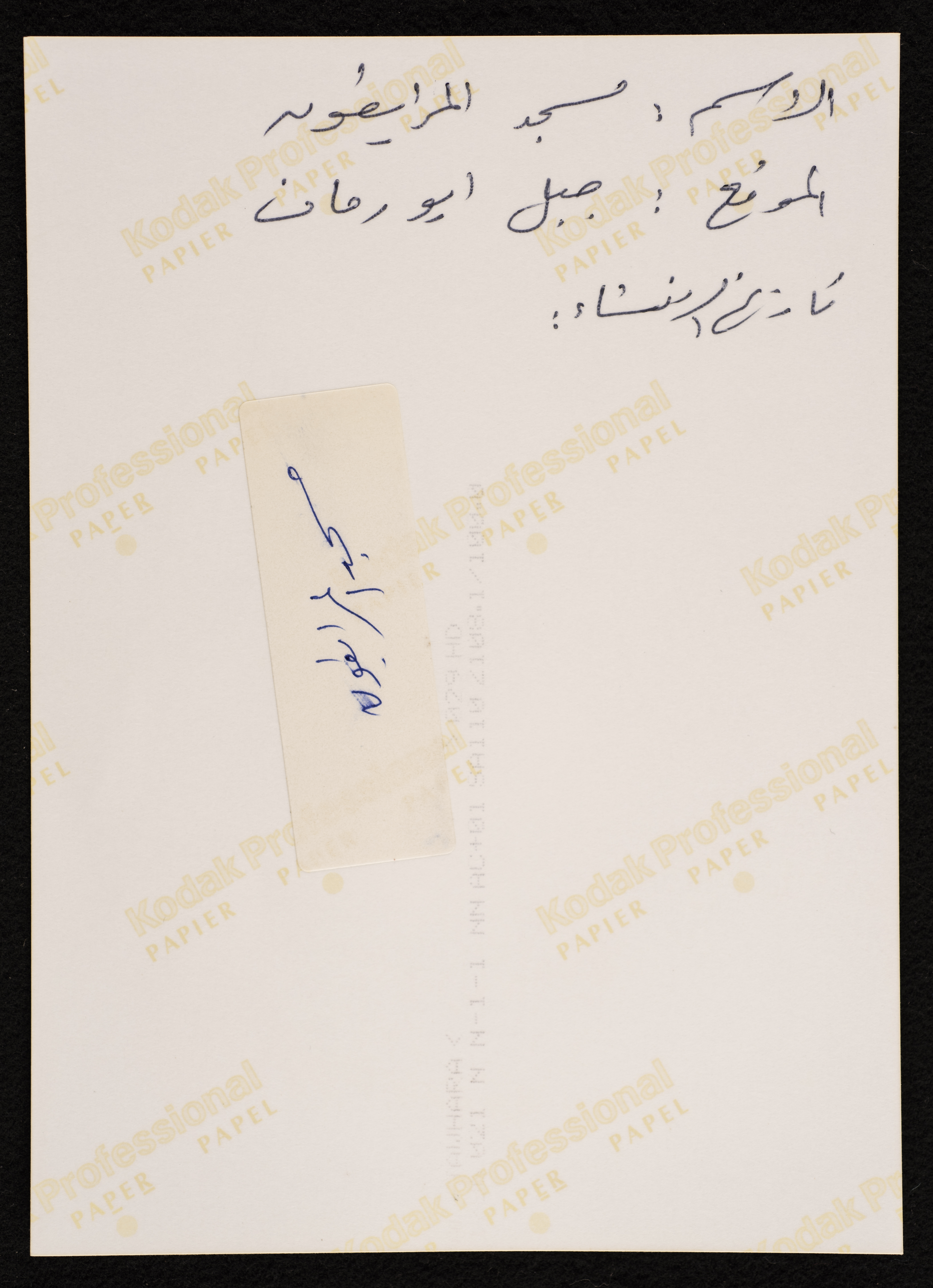 Found in Al Sanabel Center for the Study of the Palestinian Popular Heritage Collection, this is a colour photograph of al-Murabitun Mosque in Jabal Abu Rumman in Hebron. The mosque, which is managed by the Ministry of Awqaf and Religious Affairs, was built in 1986.