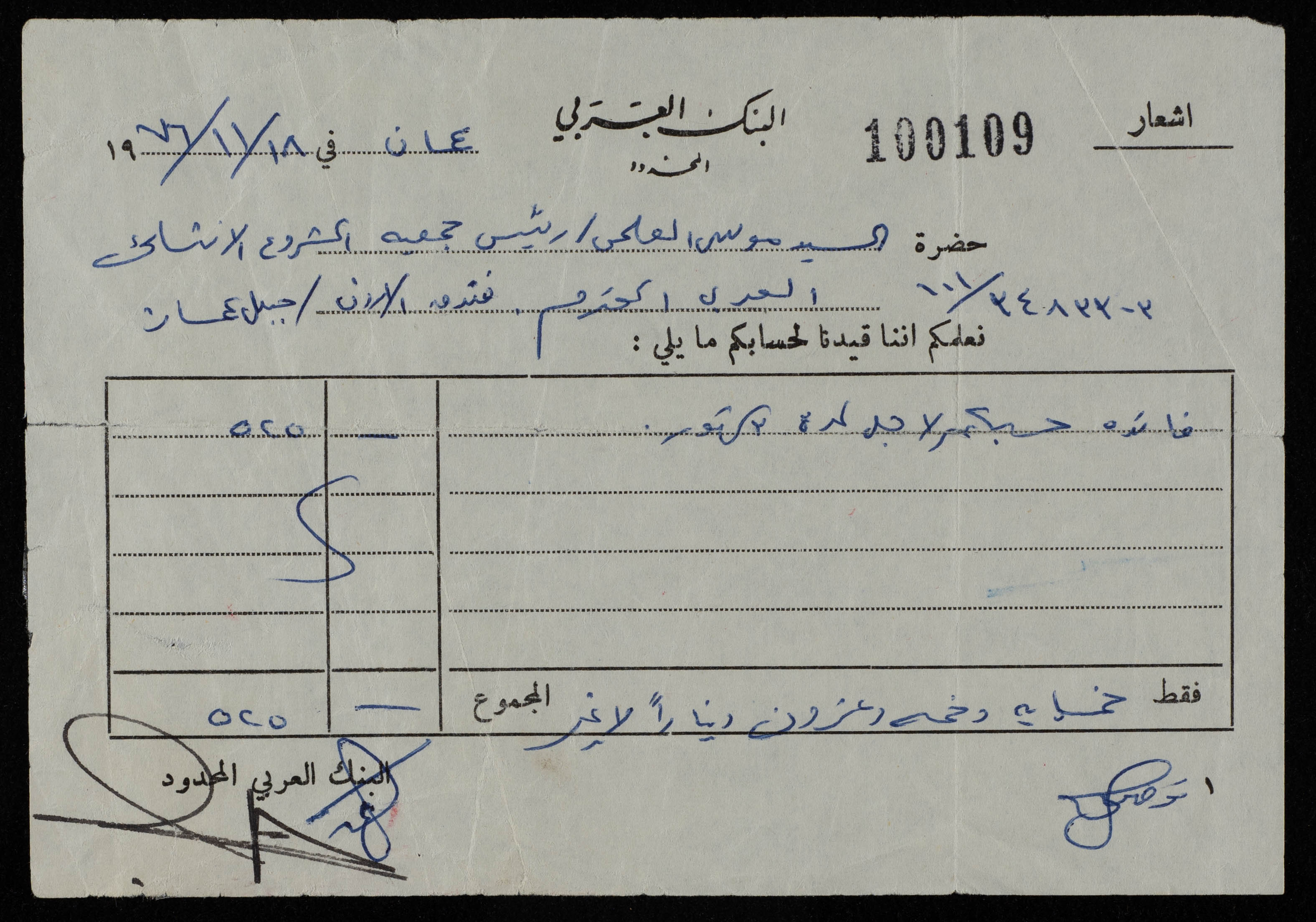 وثيقة مطبوعة باللغة العربية، تتضمن وصل مالي من البنك العربي المحدود عمان الى موسى العلمي بتاريخ 18/11/1976. وجدت في مجموعة مشروع الانشائي العربي