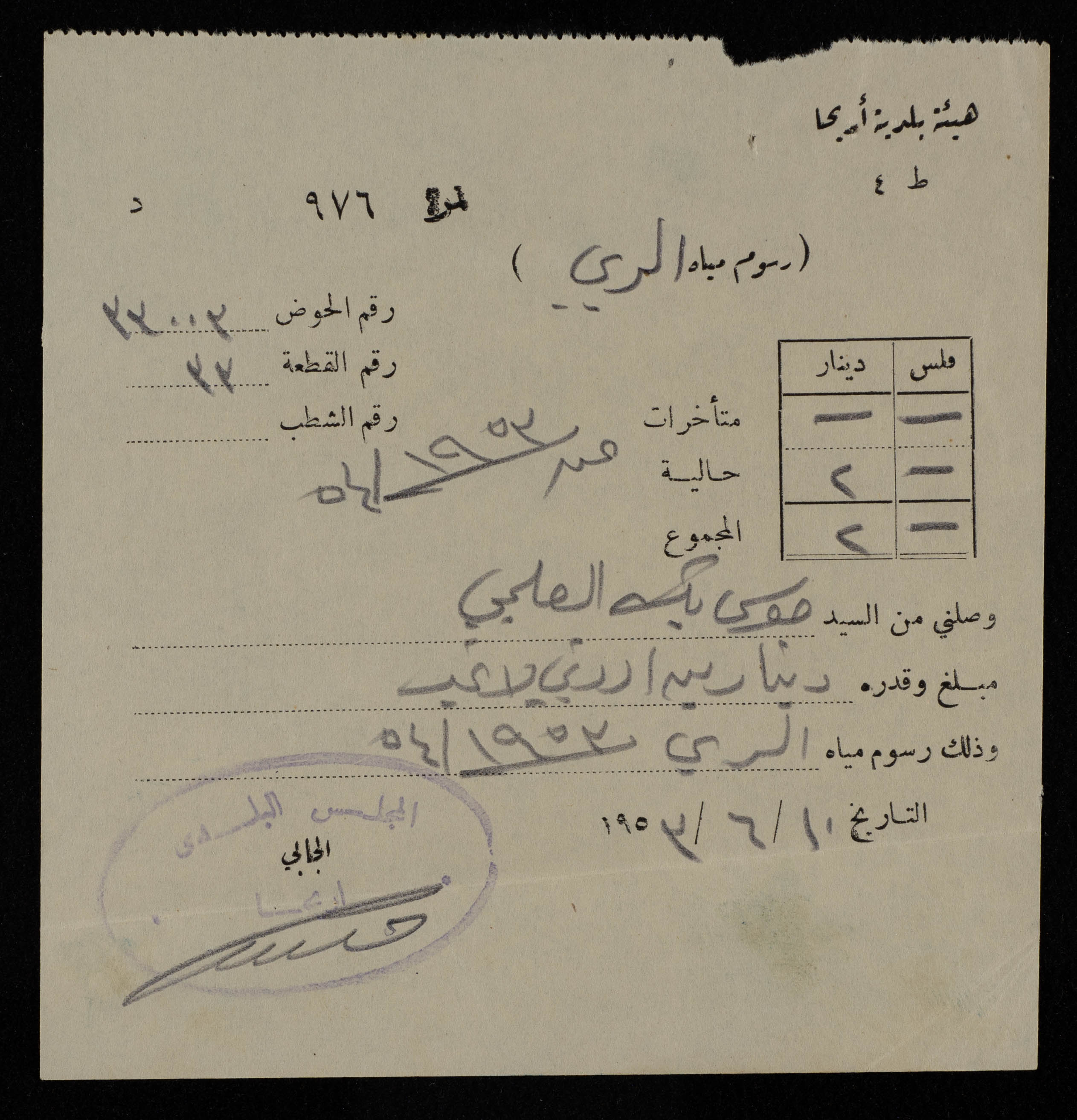 وثيقة مطبوعة باللغة العربية، تتضمن وصلل مالي من موسى العلمي بمبلغ دينارين اردني وذلك رسوم مياه الري الى هيئة بلدية اريحا بتاريخ 10/6/1953. وجدت في مجموعة مشروع الانشائي العربي
