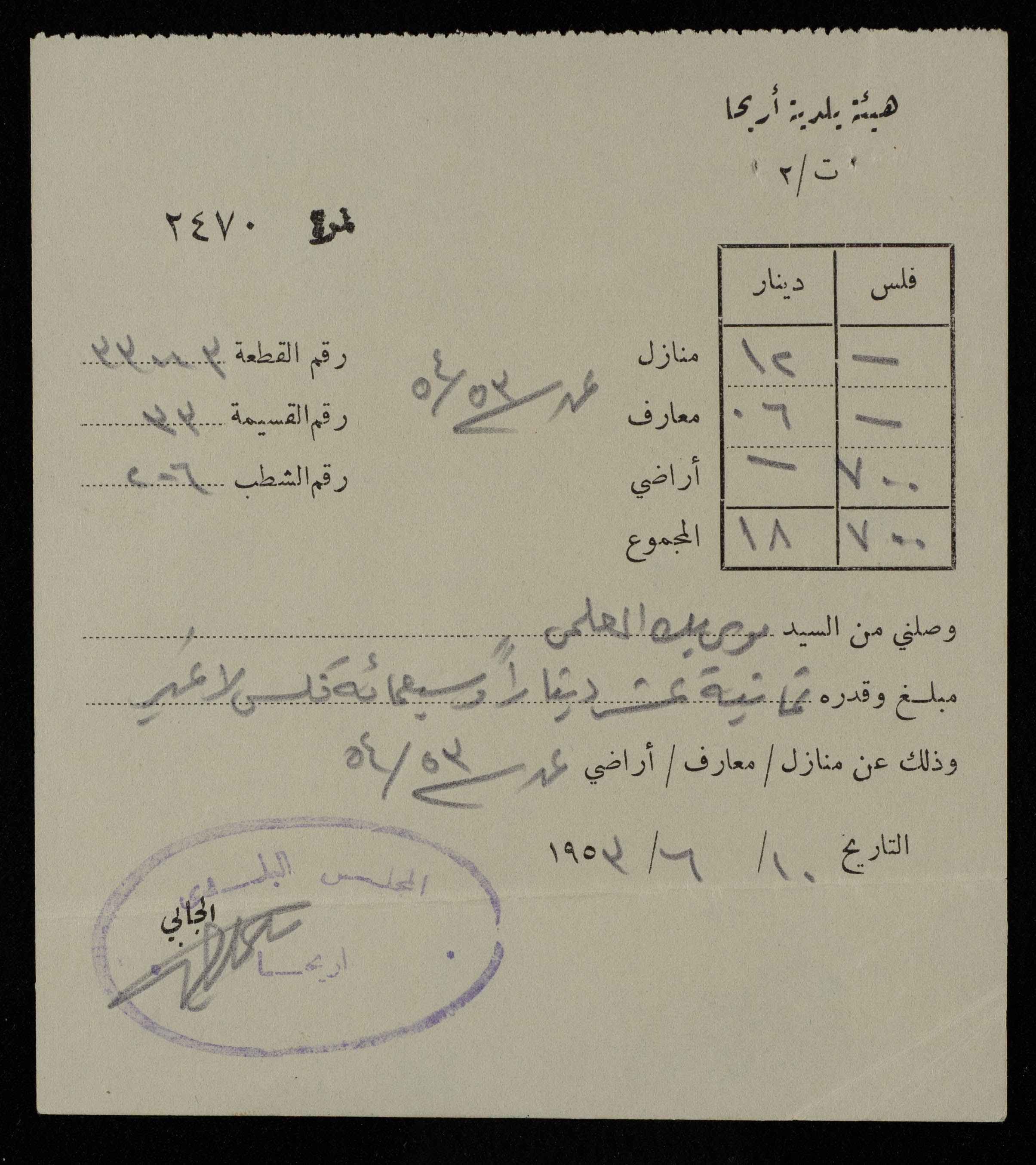 وثيقة مطبوعة باللغة العربية، تتضمن وصل مالي من موسى العلمي بمبلغ ثمانية عشر دينارا وسبعمائة فلس وذلك عن منازل معارف الاراضي الى هيئة بلدية اريحا بتاريخ 10/6/1953. وجدت في مجموعة مشروع الانشائي العربي