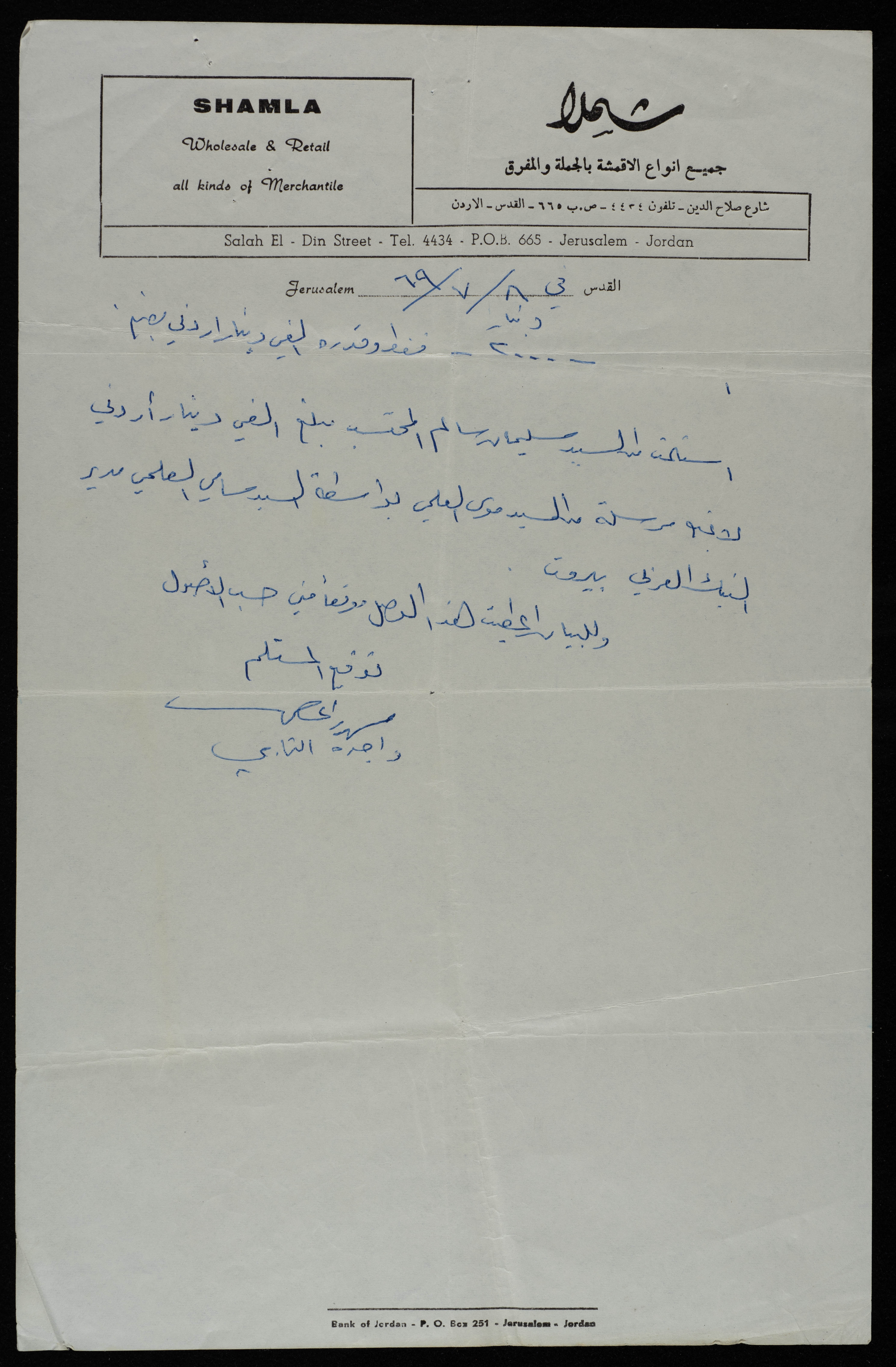وثيقة مكتوبة باللغة العربية، تتضمن سند قبص حيث استلمت واجده الثابي من سليمان سالم مبلغ مالي الفي دينار أردني مرسل من موسى العلمي بواسطة سلمي العلمي بتاريخ 8/7/1969