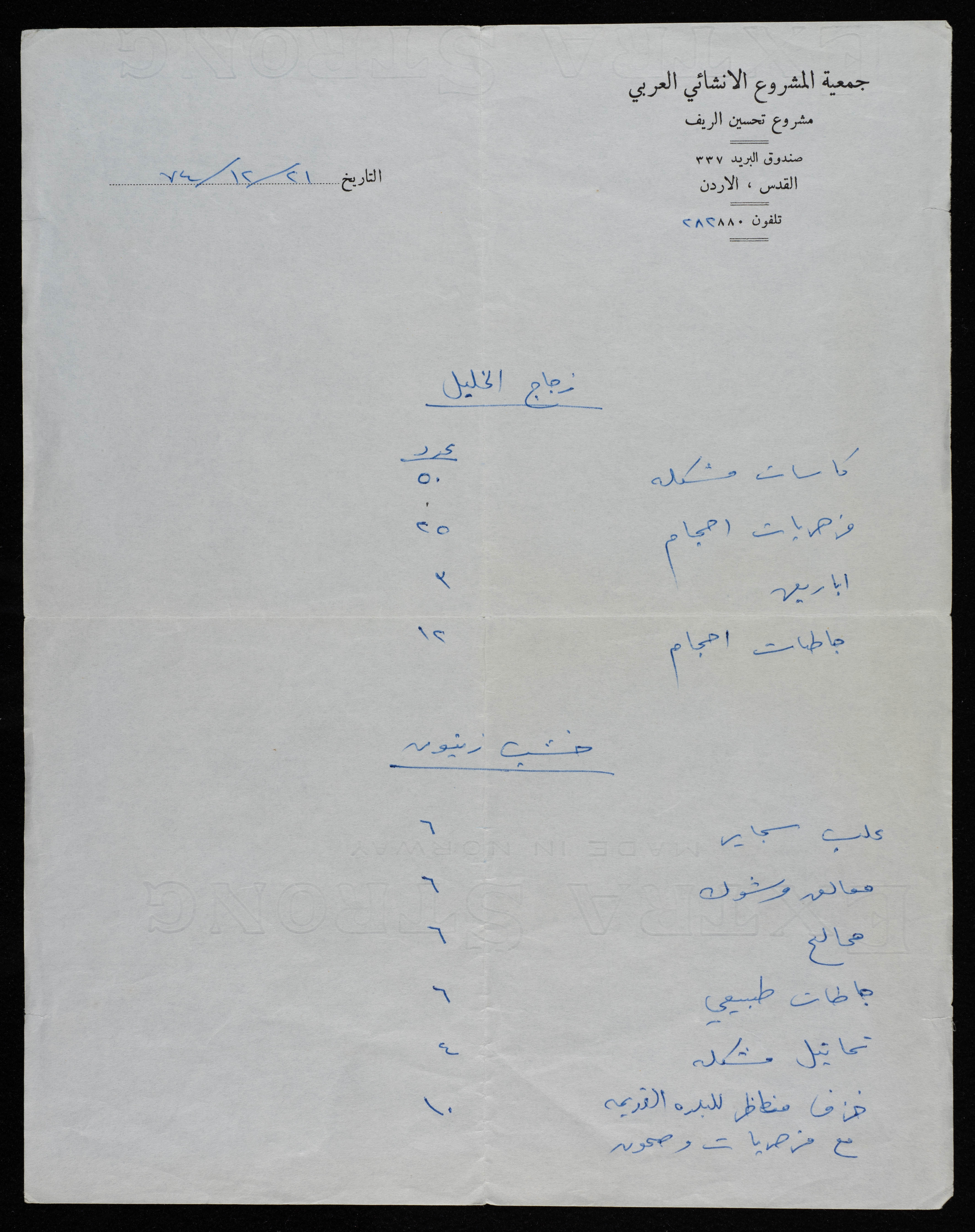 عزريل، سمر. "مجموعة جمعية المشروع الإنشائي العربي". جرد أرشيفي. 23 حزيران 2018. أرشيف المتحف الفلسطيني الرقمي.
