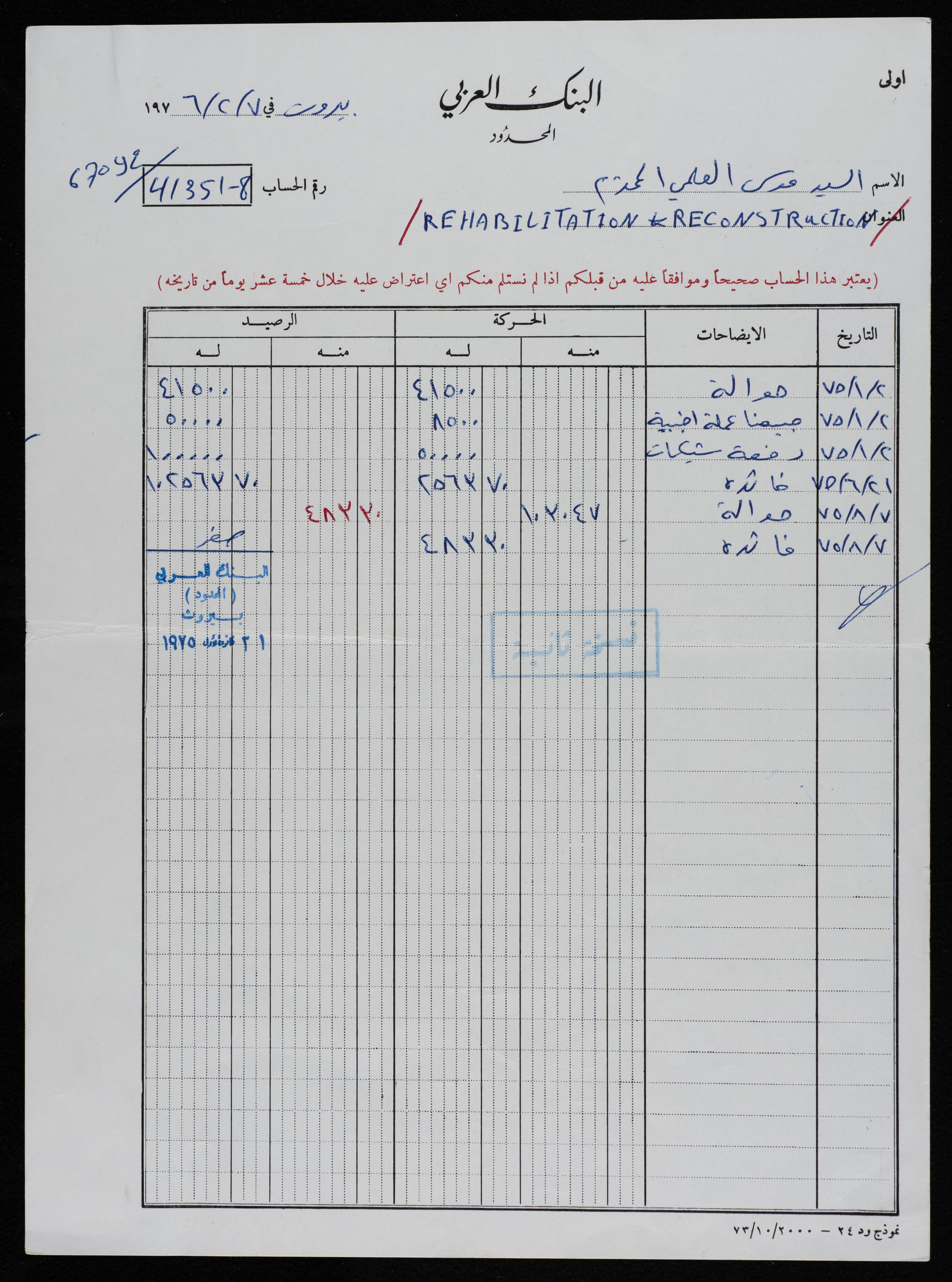 وثيقة مكتوبة باللغة العربية، تتضمن اوراق ماليه لموسى العلمي من بنك العربي بتاريخ 7/2/1976، وجدت في مجموعة مشروع الانشائي العربي اريحا
