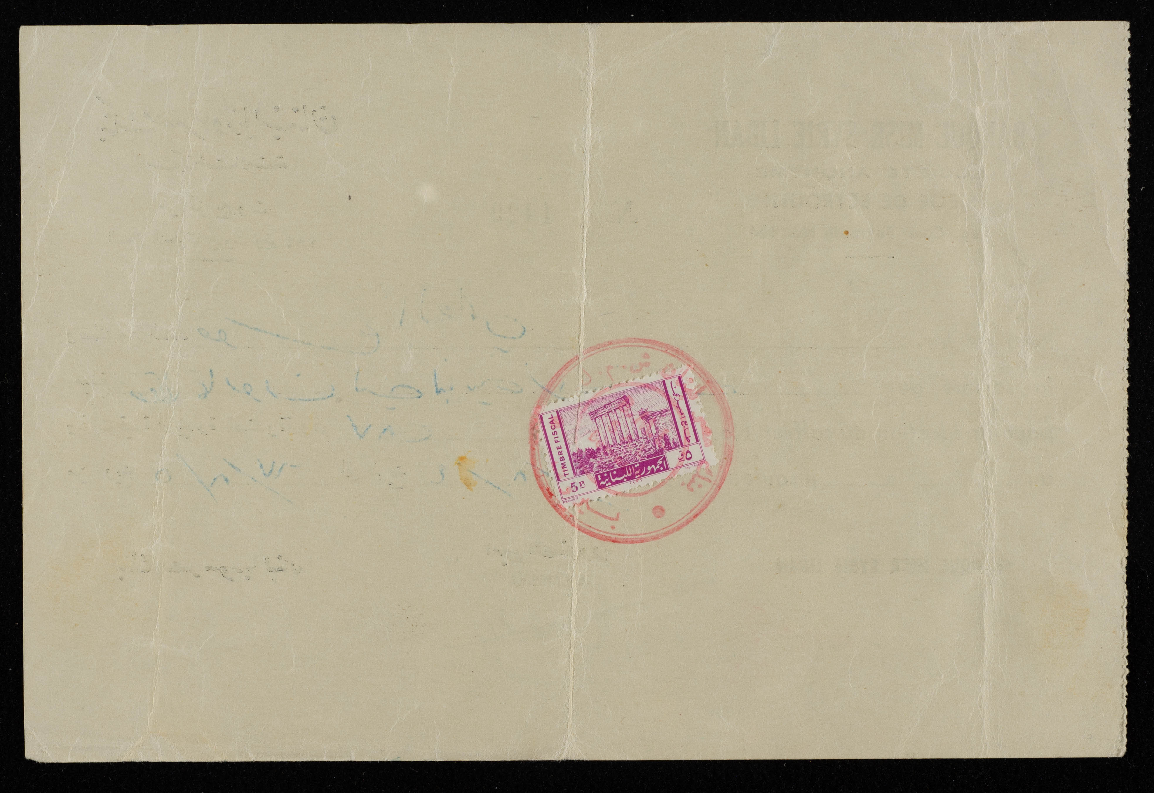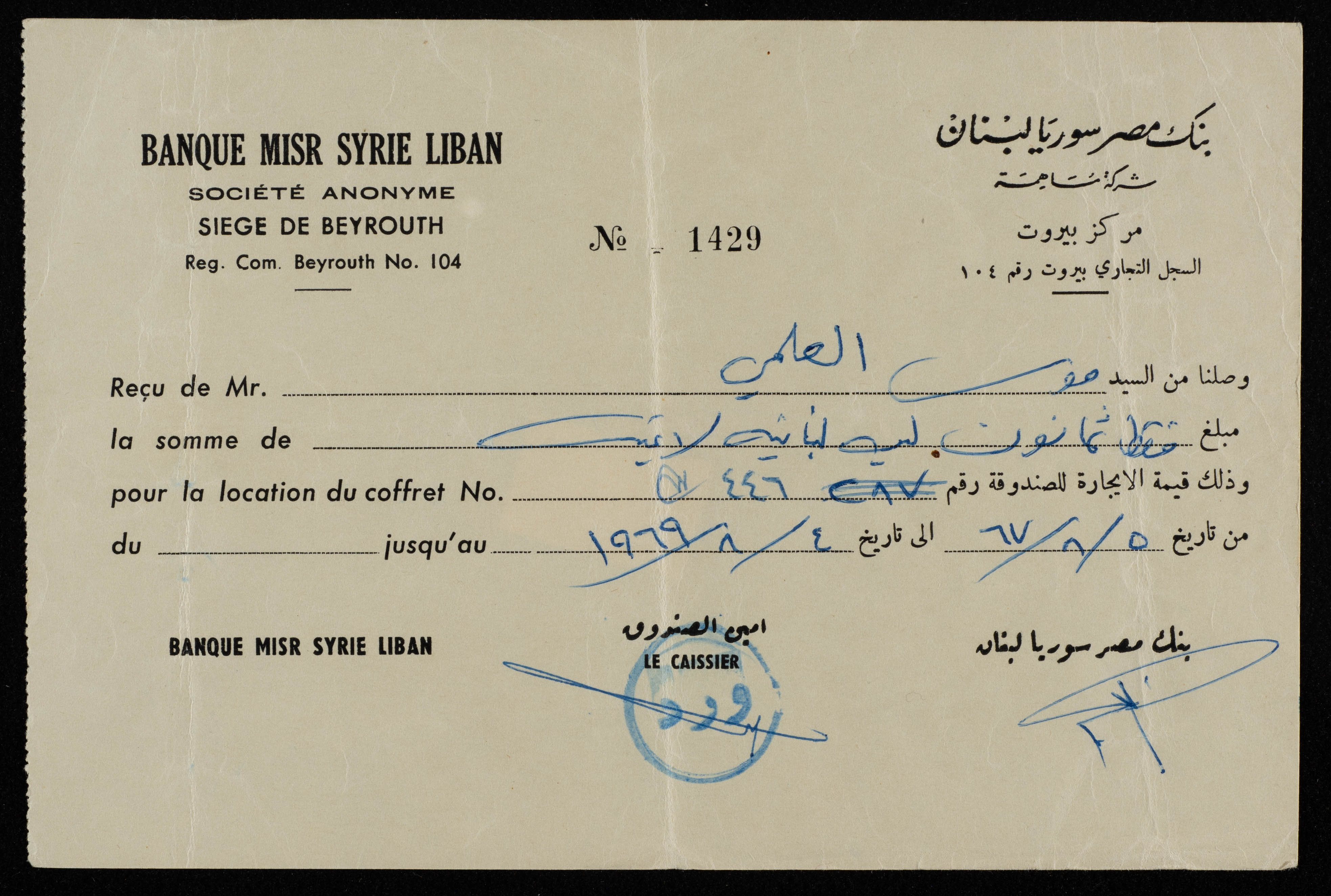 وثيقة مطبوعة باللغة العربية، تتضمن وصل مالي من موسى العلمي الى بنك مصر سوريا لبنان بمبلغ ثمانون ليرة لبنانية وذلك قيمة ايجار للصندوقة رقم 446 من تاريخ 5/8/1967 الى 4/8/1969. وجدت في مجموعة مشروع الانشائي العربي