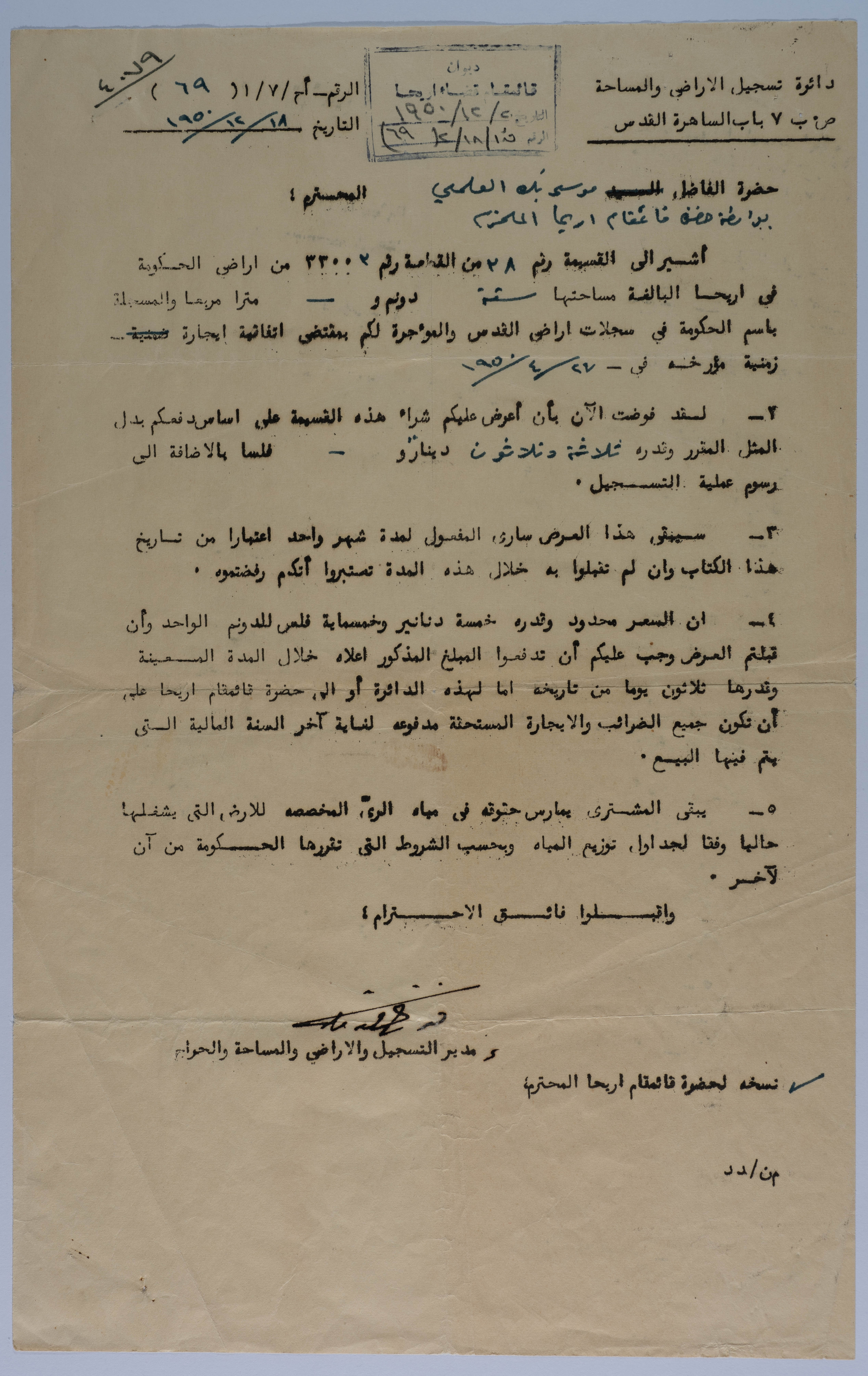 Found in the Arab Development Society Collection, this document shows a letter from the Department of Land and Survey to Musa al-ʿalamy on 18/12/1950.