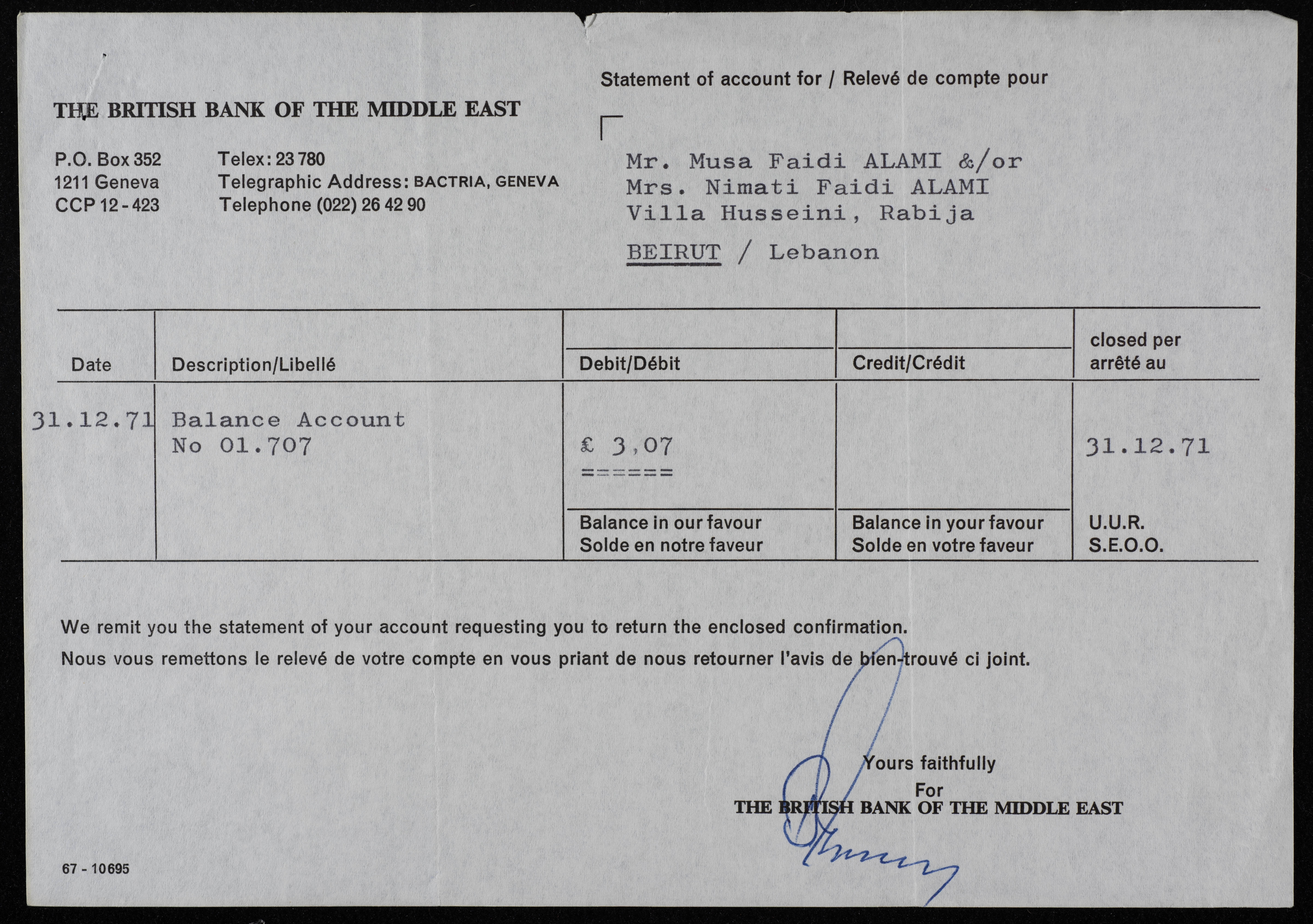 وثيقة مطبوعة باللغة الانجليزية، تتضمن كشف حساب موسى العلمي من البنك البريطاني بتاريخ 31/12/1971. وجدت في مجموعة المشروع الانشائي العربي