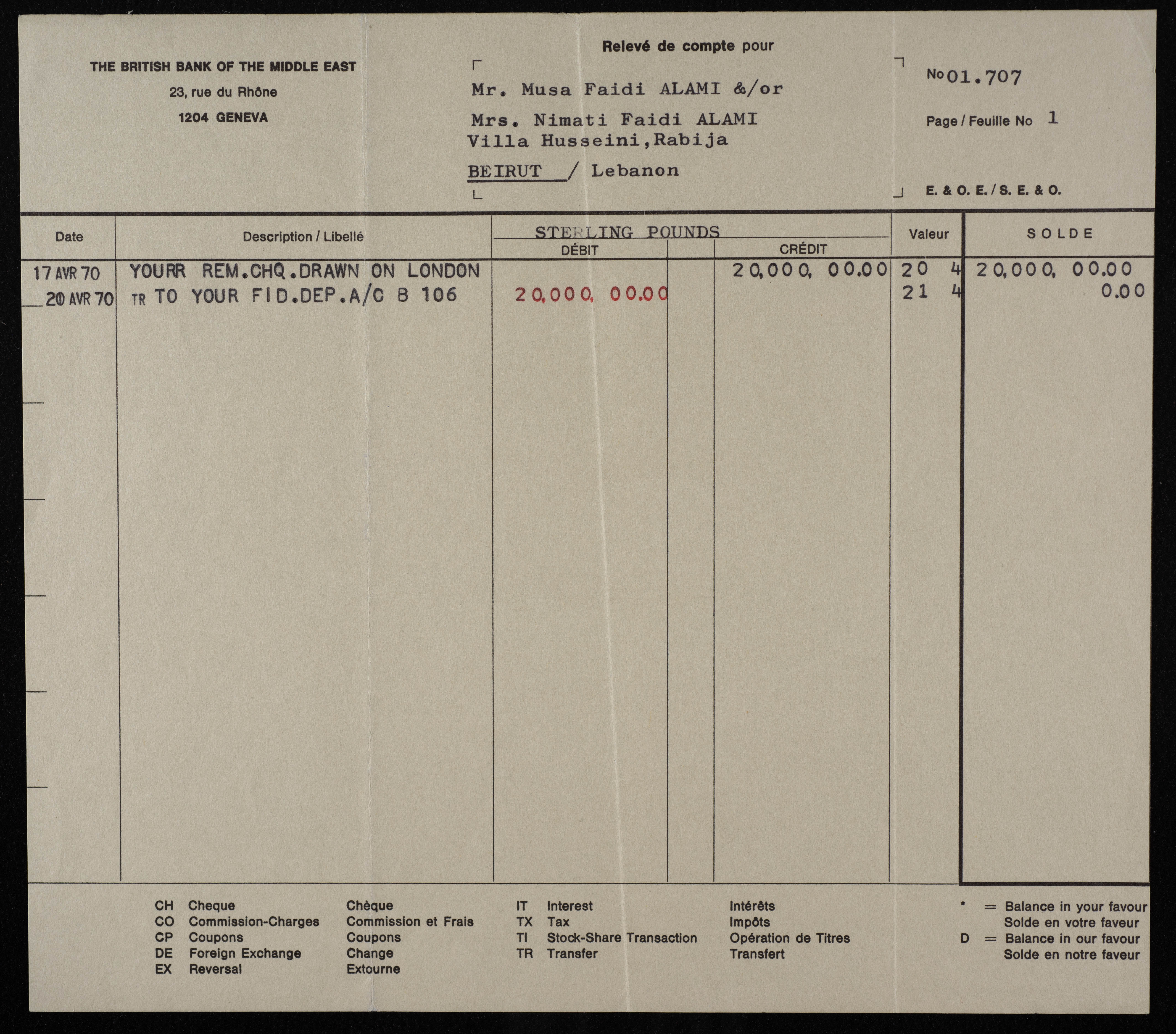وثيقة مطبوعة باللغة الانجليزية، تتضمن كشف حساب موسى العلمي من البنك البريطاني بتاريخ 17/4/1970. وجدت في مجموعة المشروع الانشائي العربي