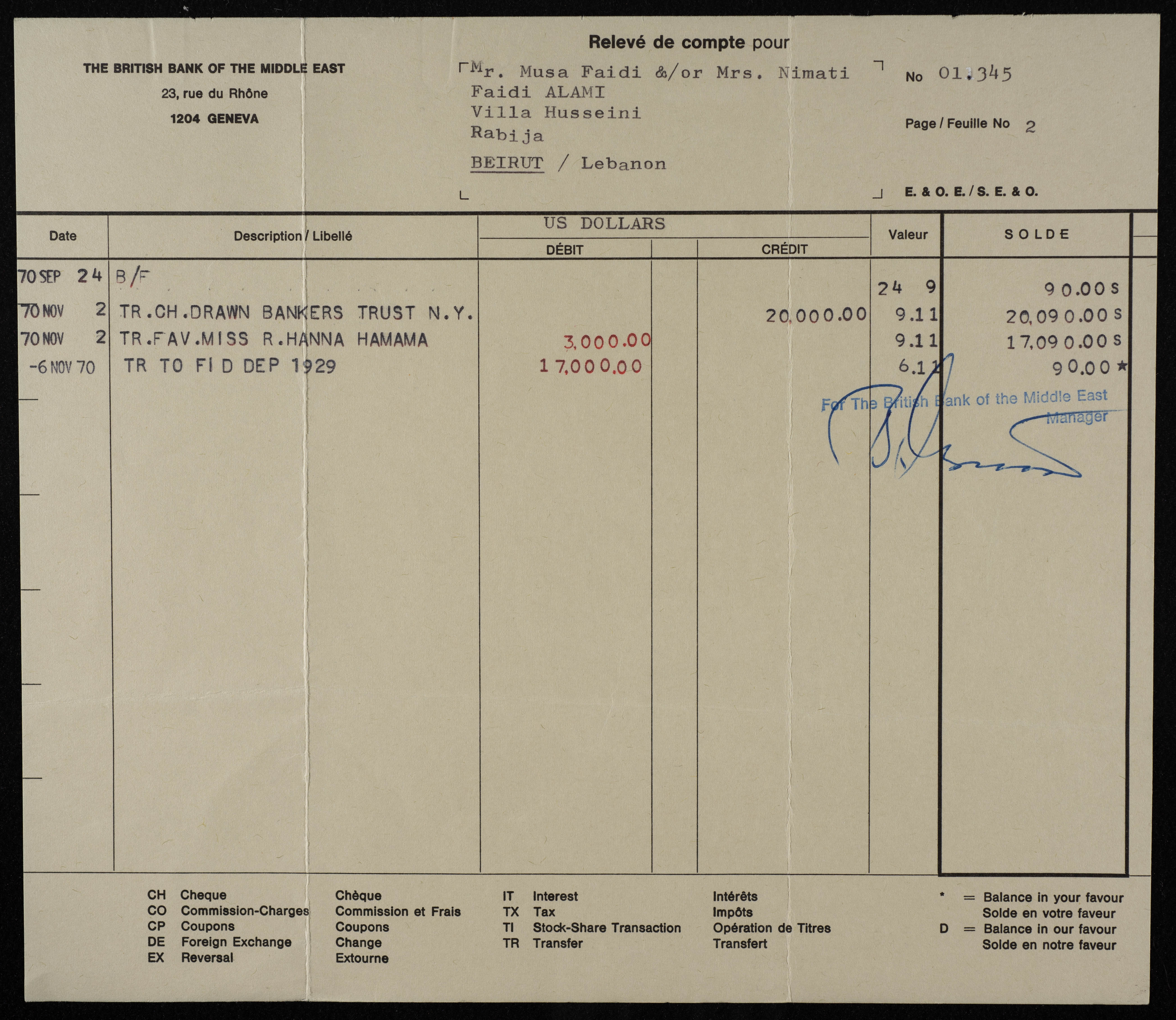 وثيقة مطبوعة باللغة الانجليزية، تتضمن كشف حساب موسى العلمي من البنك البريطاني بتاريخ 24/9/1970. وجدت في مجموعة المشروع الانشائي العربي