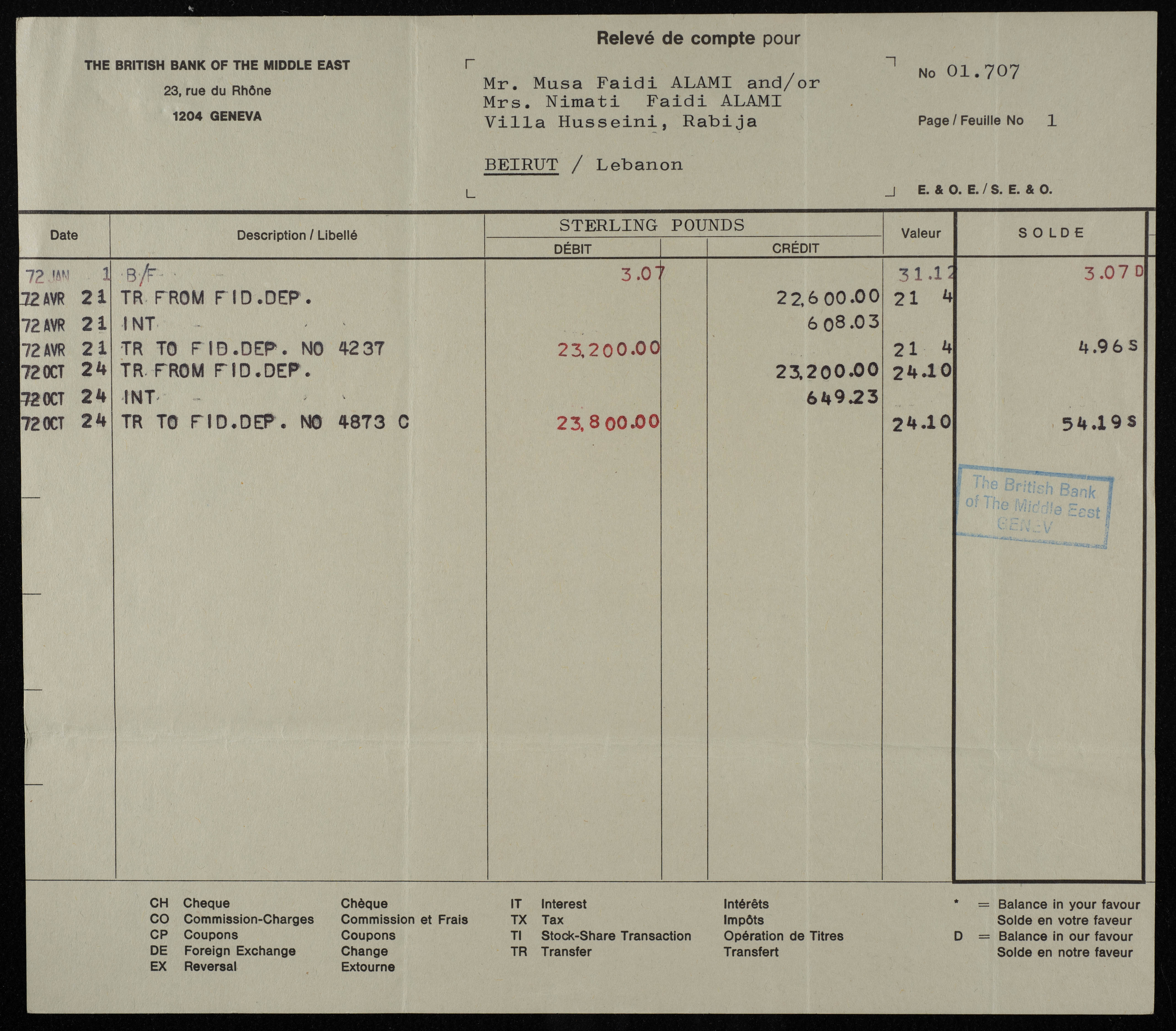 وثيقة مطبوعة باللغة الانجليزية، تتضمن كشف حساب موسى العلمي من البنك البريطاني بتاريخ 21/4/1972. وجدت في مجموعة المشروع الانشائي العربي