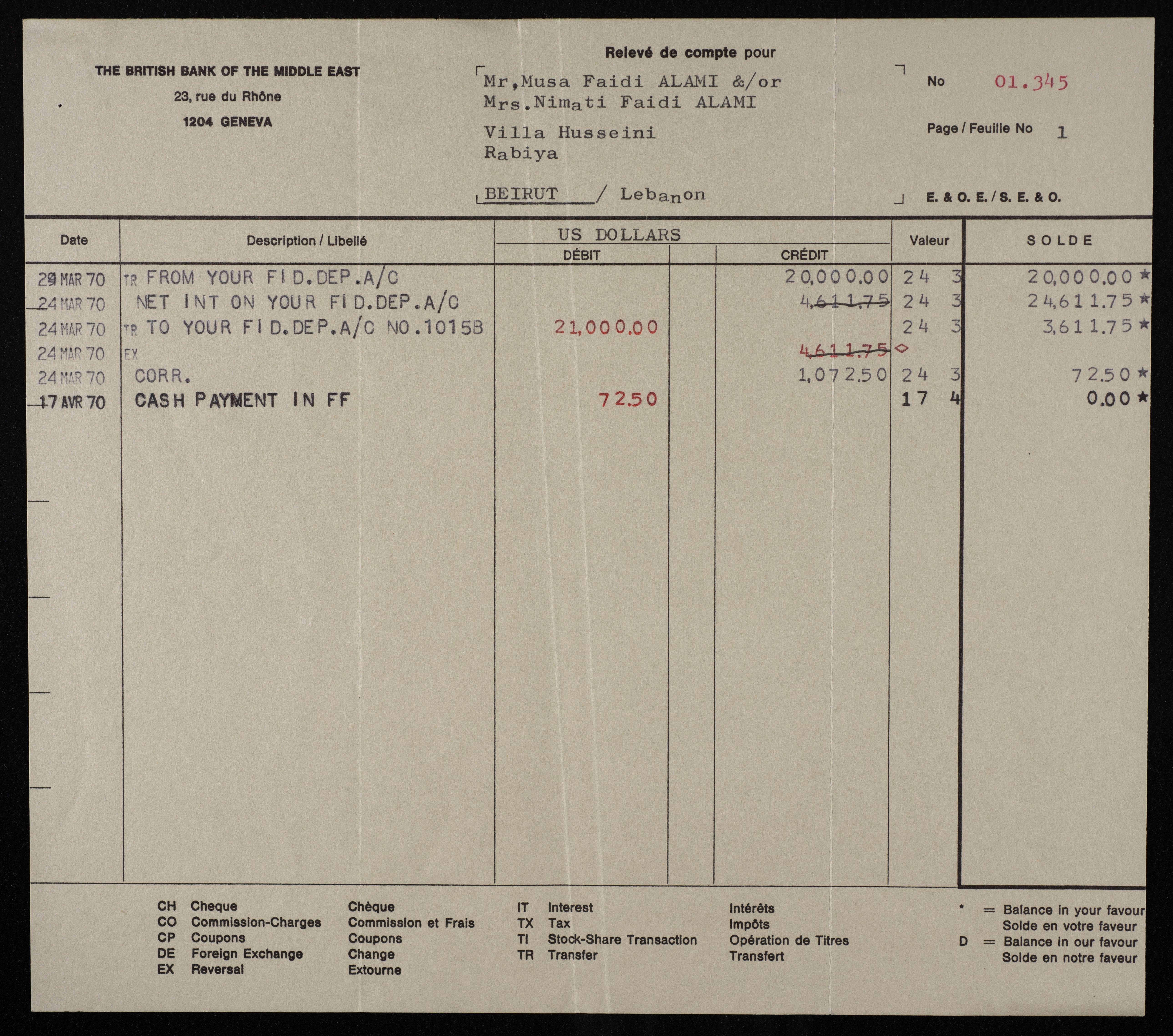 وثيقة مطبوعة باللغة الانجليزية، تتضمن كشف حساب موسى العلمي من البنك البريطاني بتاريخ 17/4/1970. وجدت في مجموعة المشروع الانشائي العربي