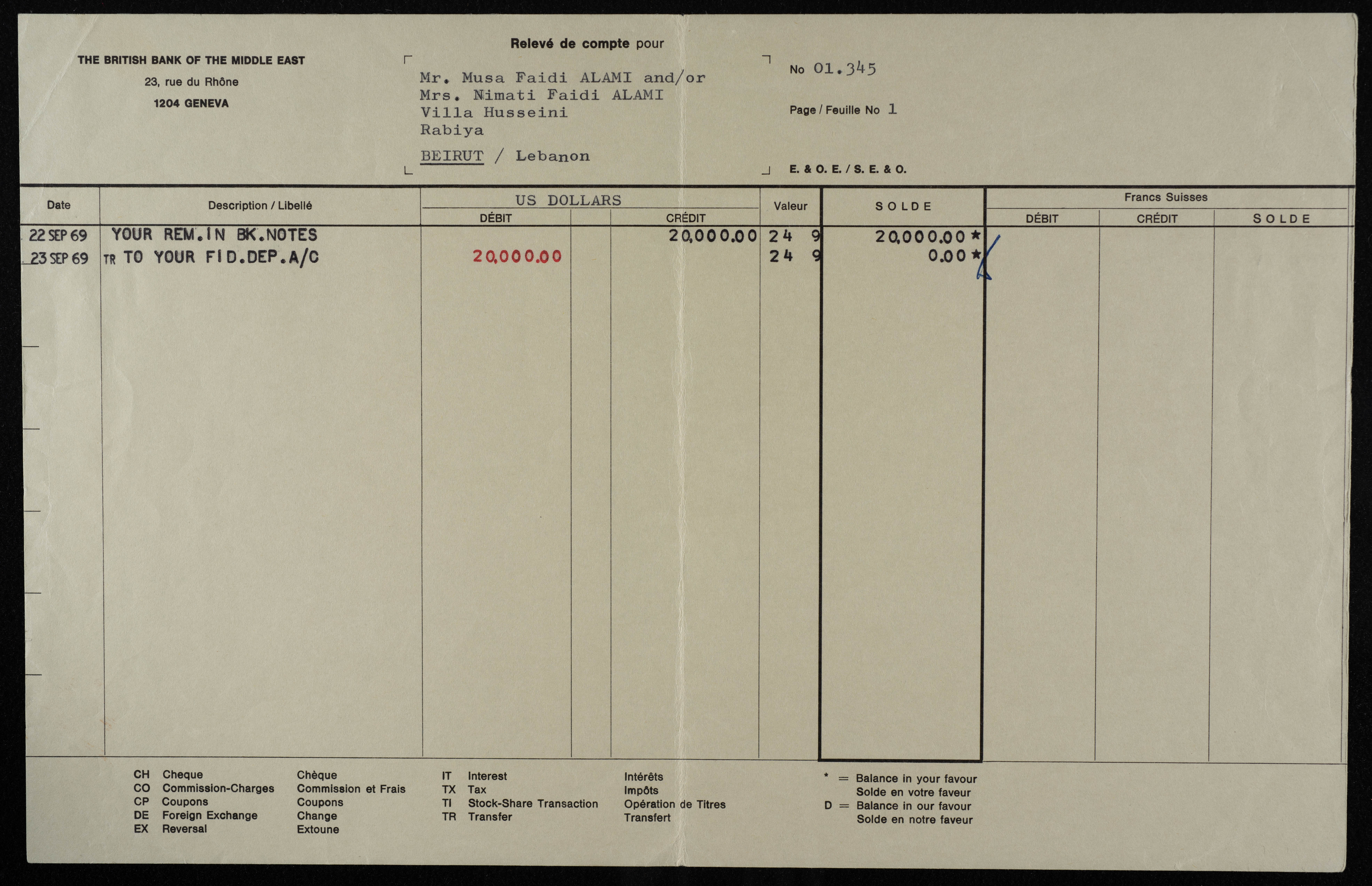 وثيقة مطبوعة باللغة الانجليزية، تتضمن كشف حساب موسى العلمي من البنك البريطاني بتاريخ 22/9/1969. وجدت في مجموعة المشروع الانشائي العربي
