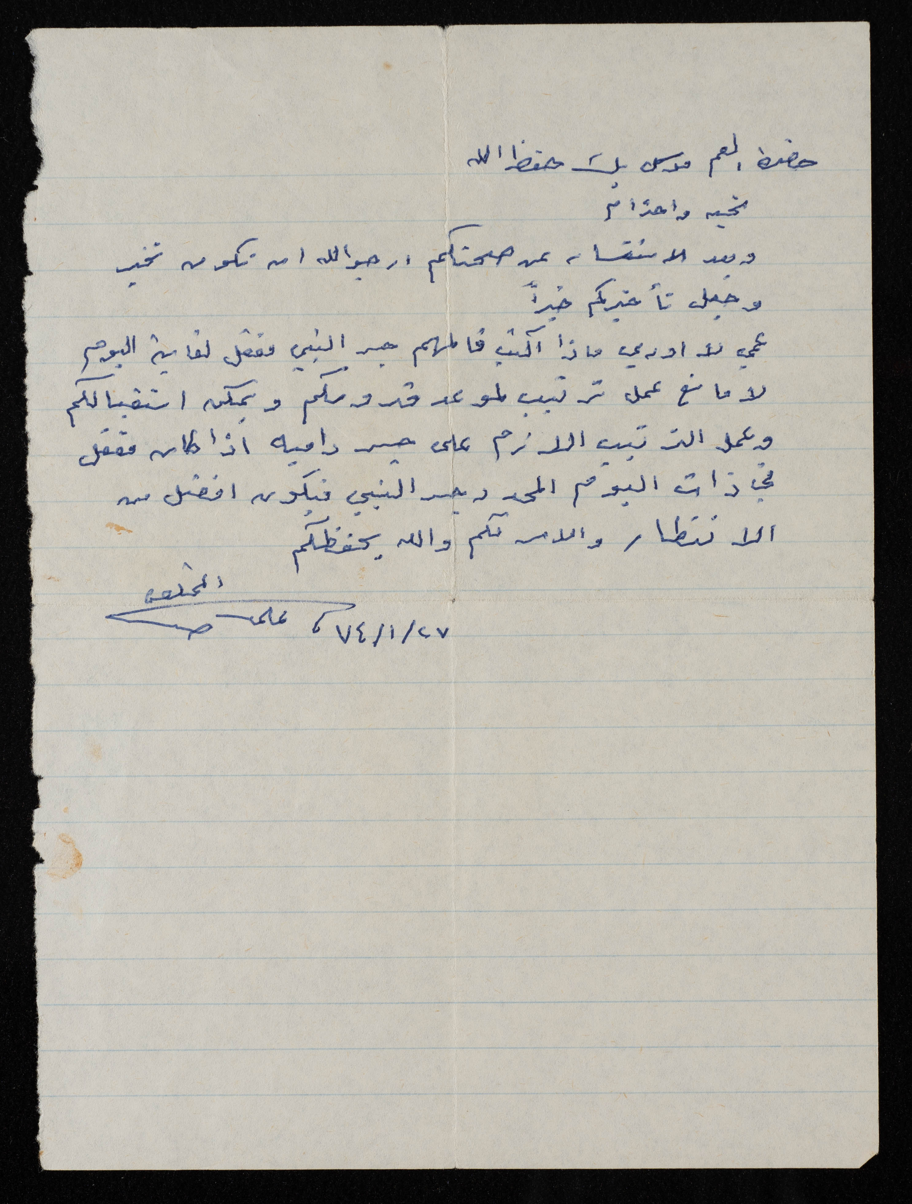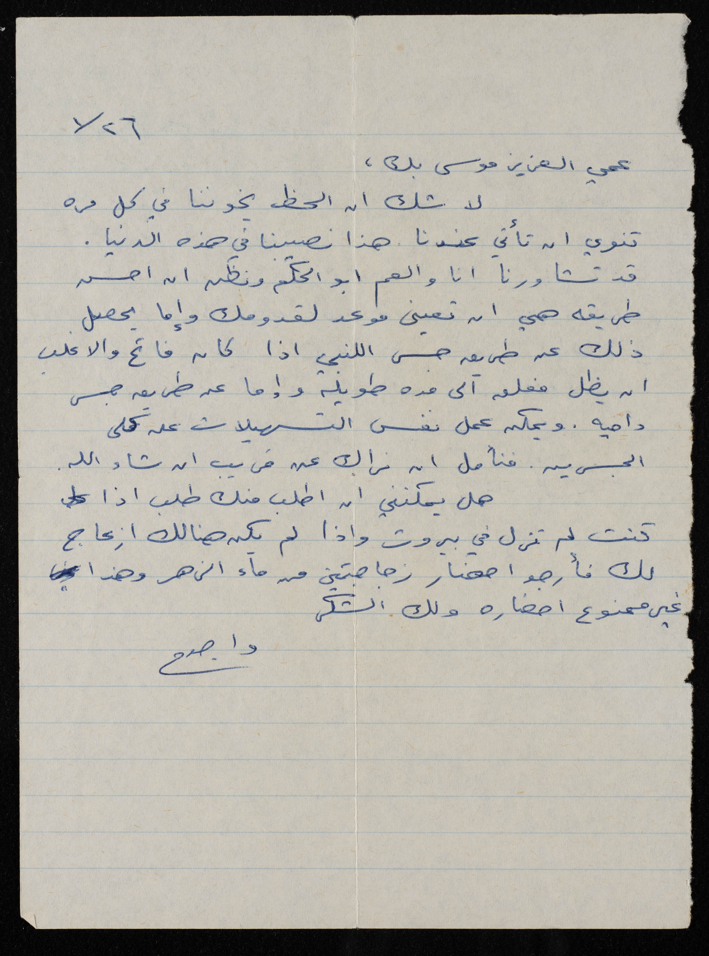 .وثيقة مكتوبة باللغة العربية، تتضمن رسالة شخصية الى موسى العلمي حول السفر الى بيروت، وجدت في مجموعة المشروع الانشائي العربي