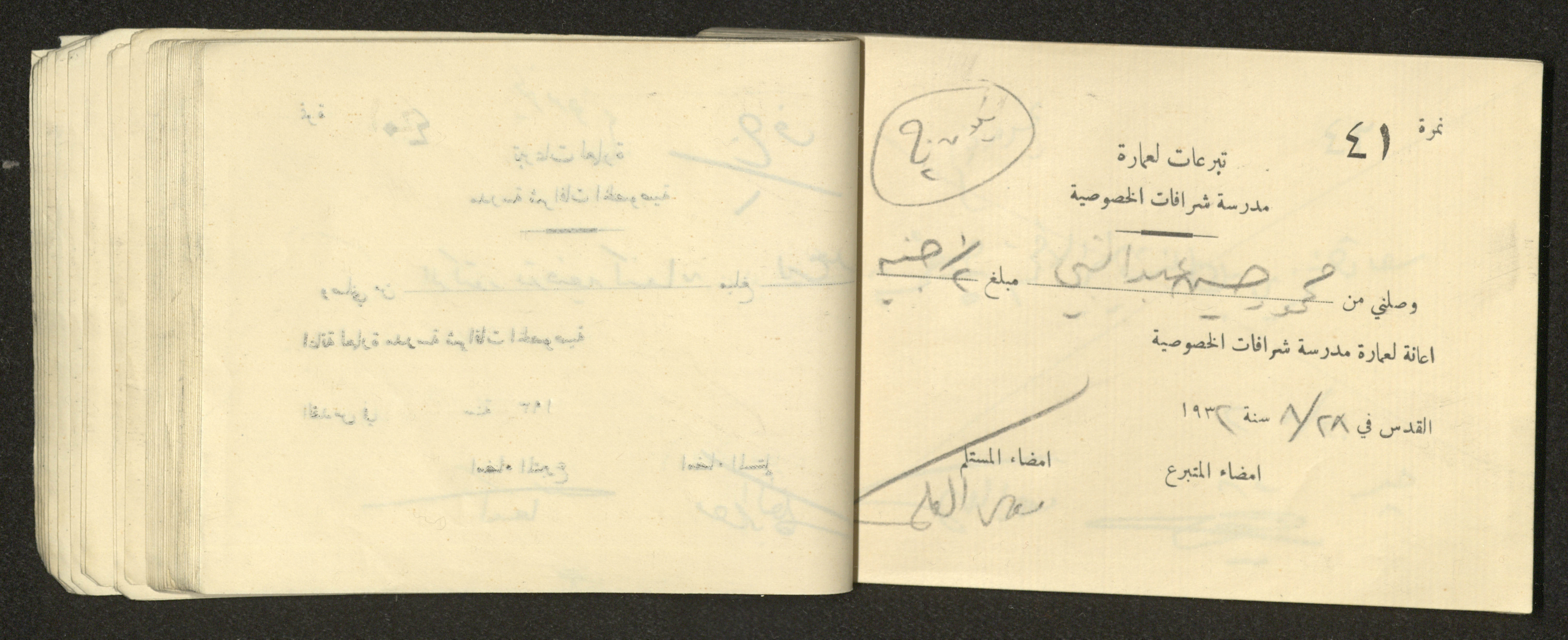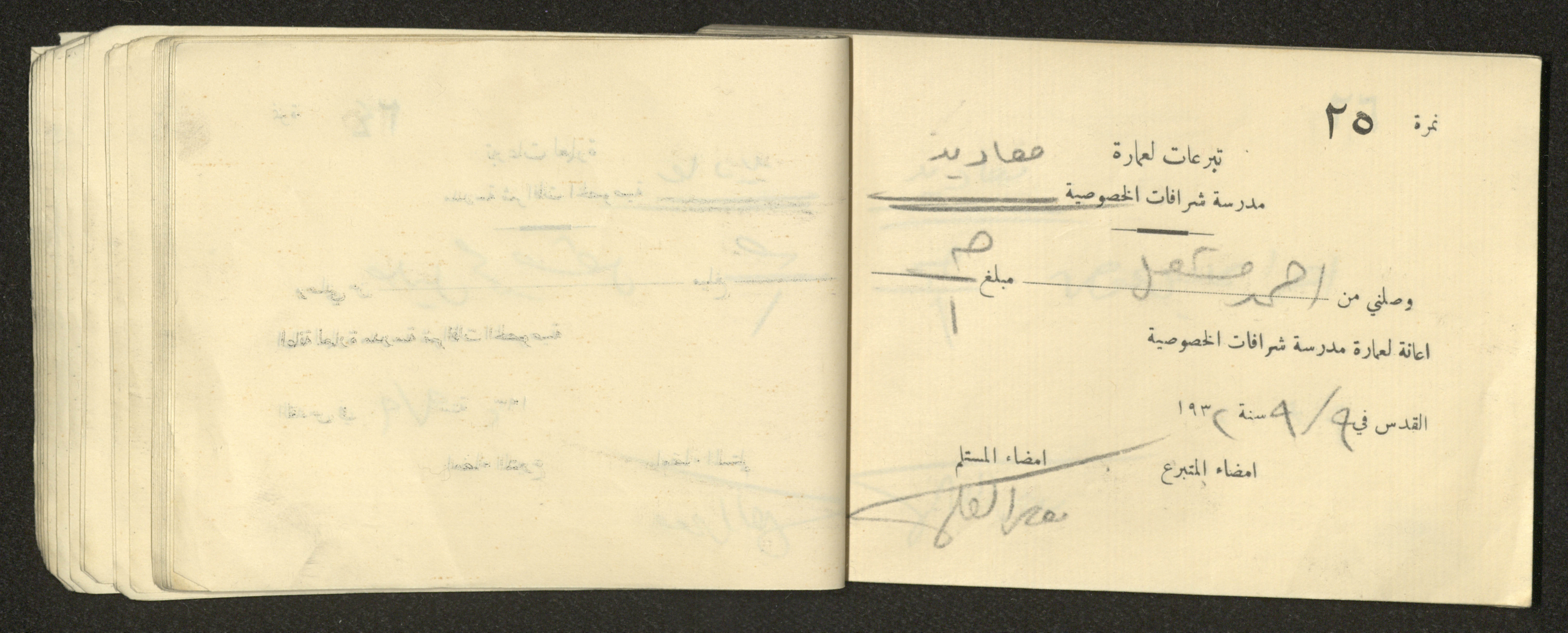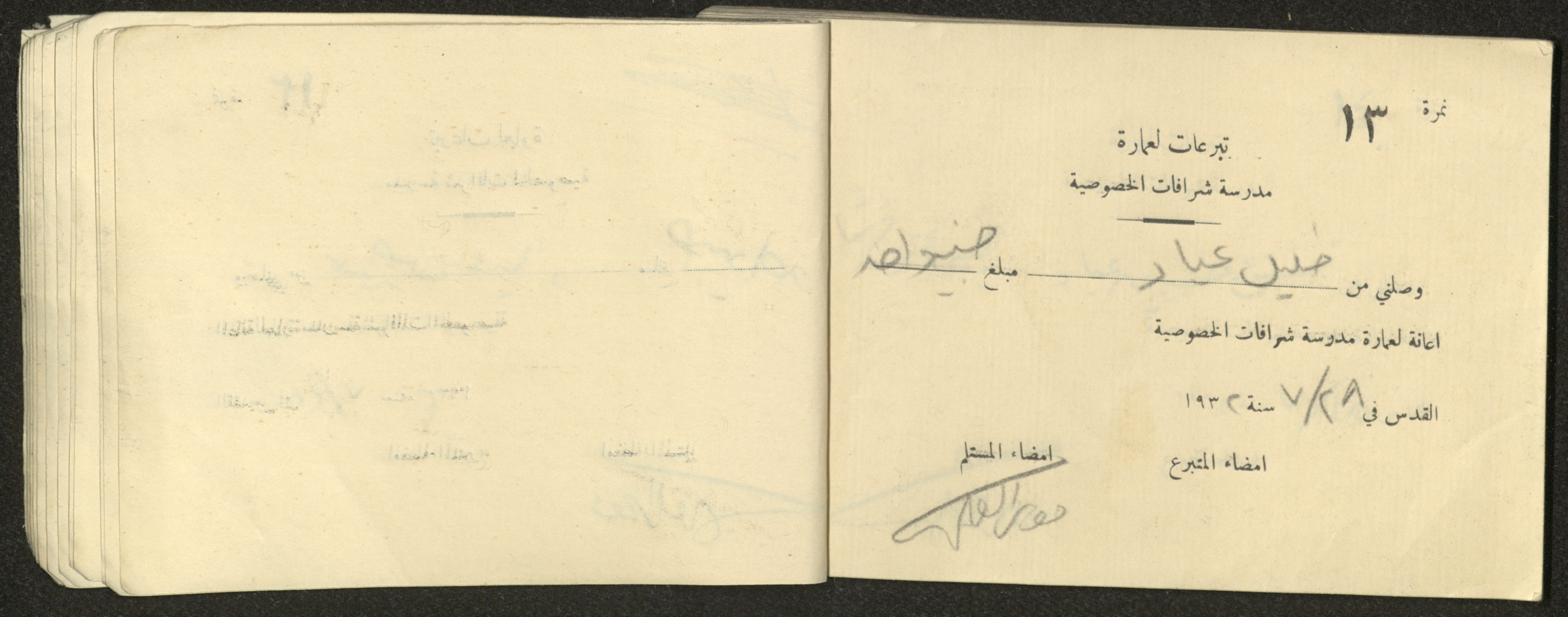 Found in the Arab Development Society Collection, this document shows a receipt book filled with receipts for donations for building Sharafat Private School, 1932.