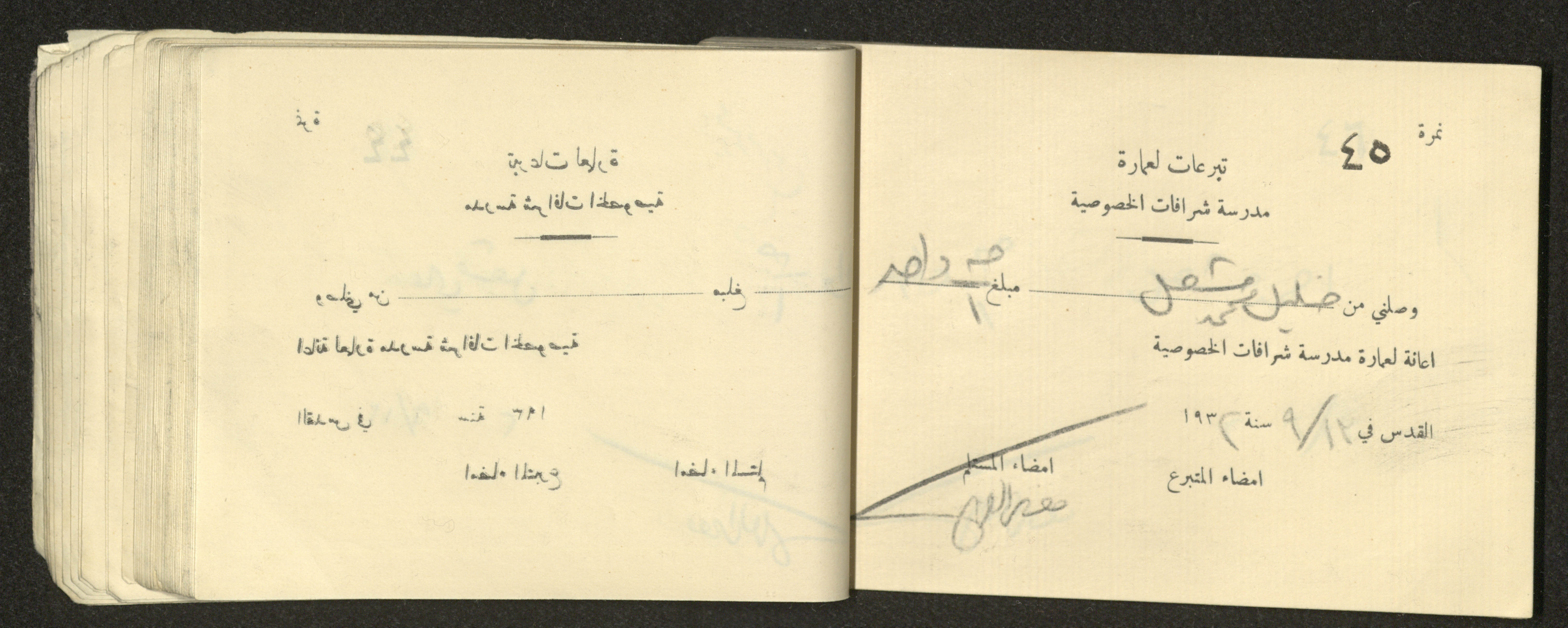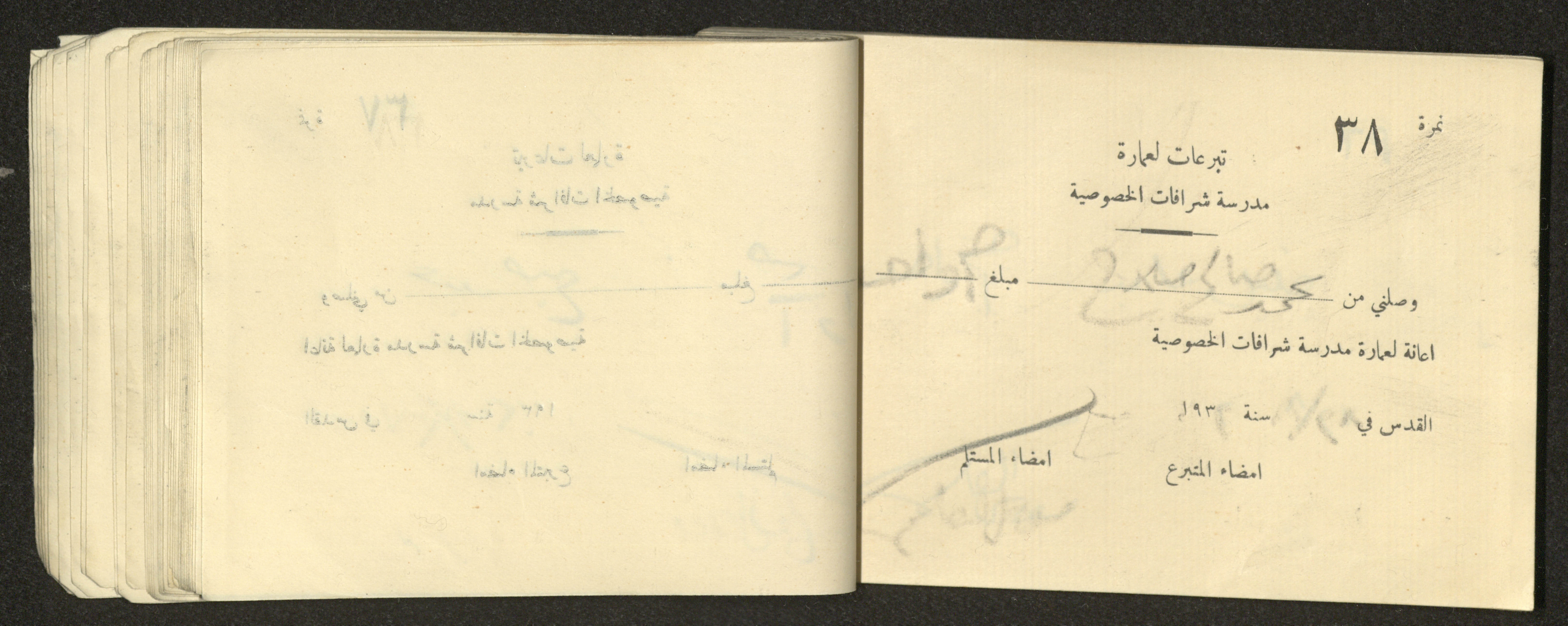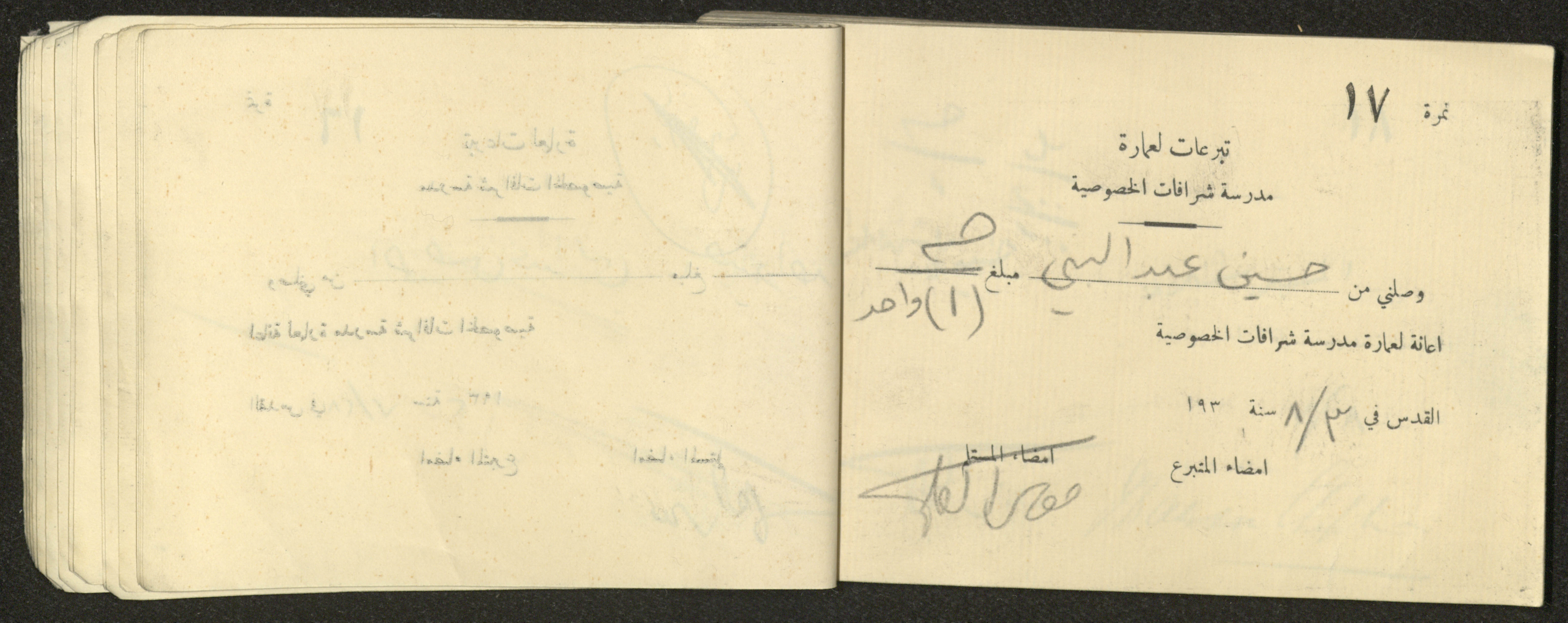 Found in the Arab Development Society Collection, this document shows a receipt book filled with receipts for donations for building Sharafat Private School, 1932.