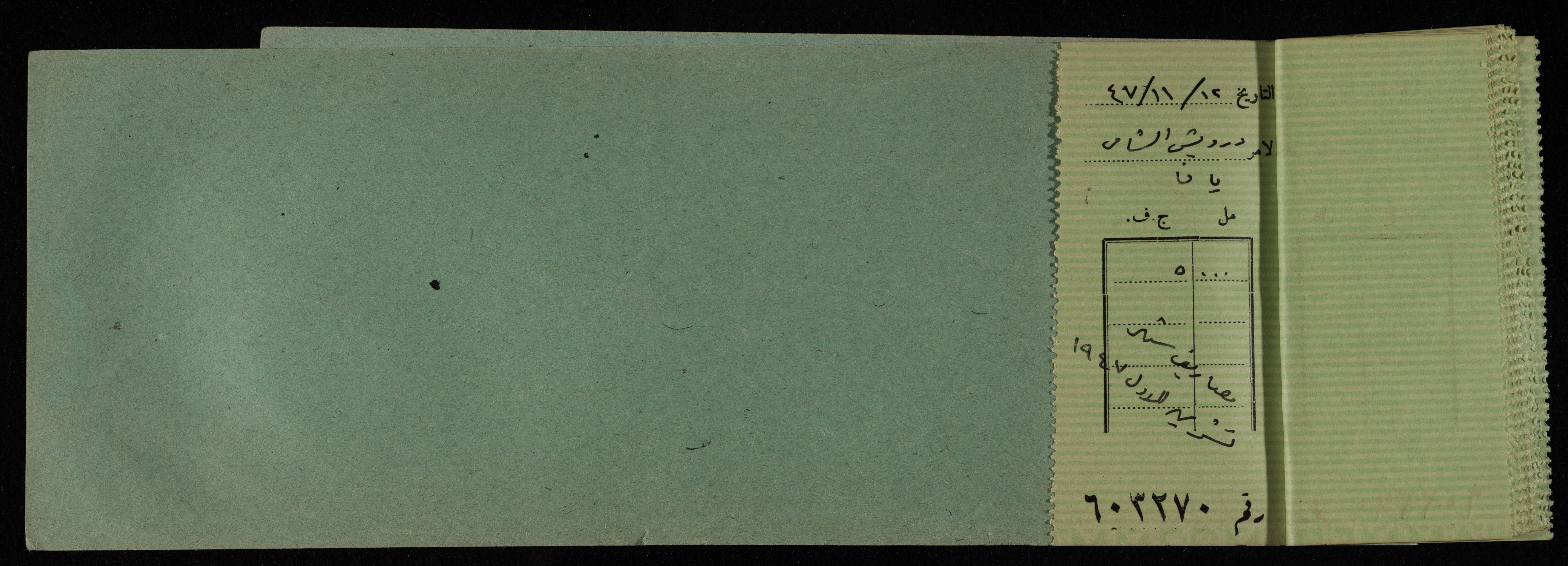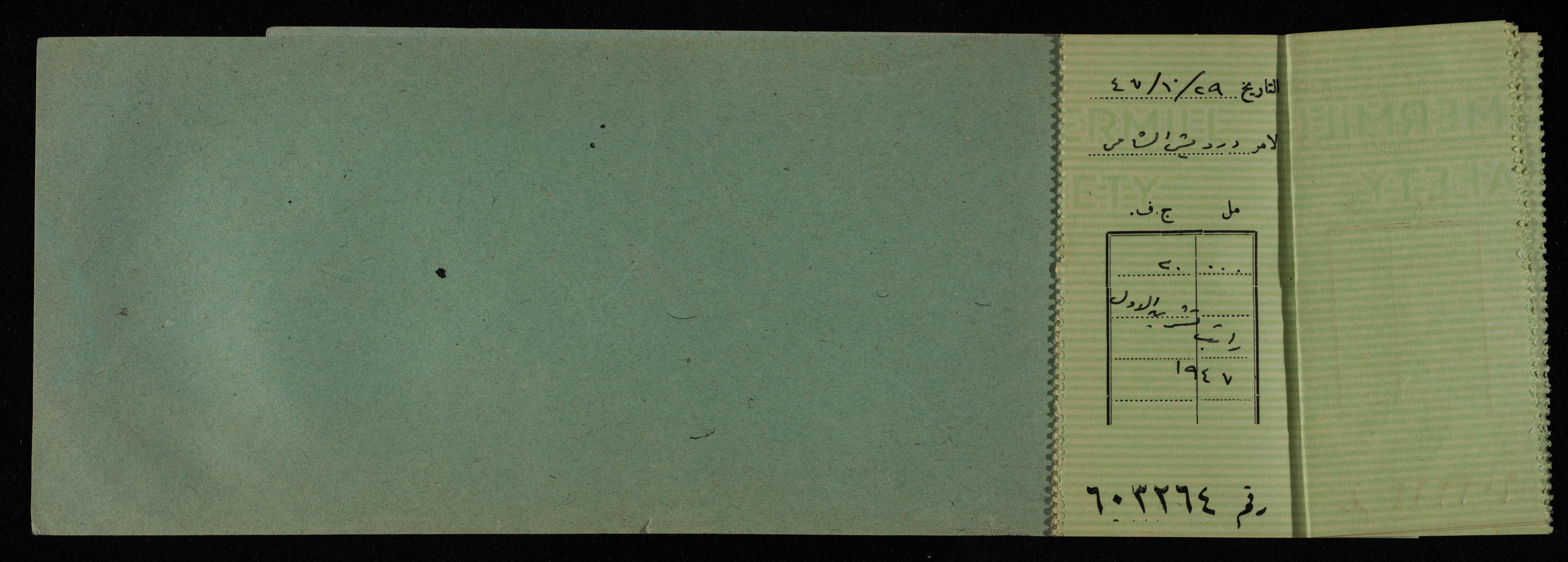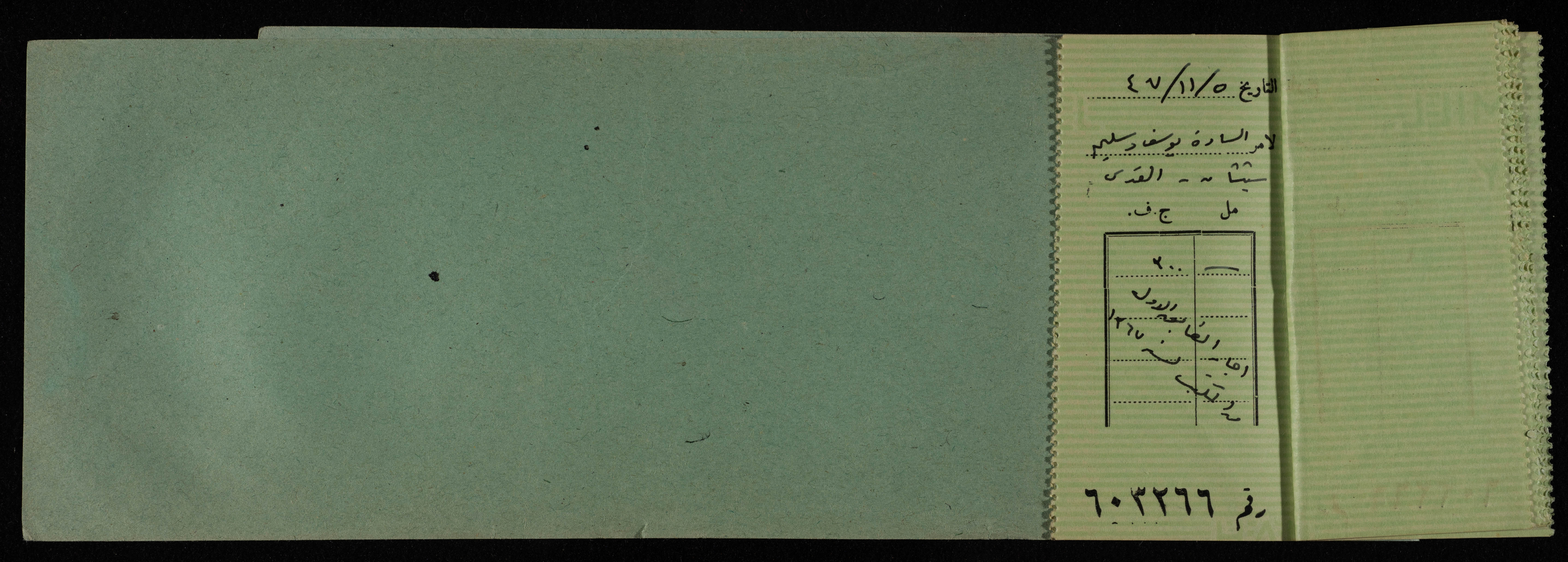 دفتر شيكات صادر عن البنك العربي في القدس بين عامي 1945-49 للمكتب العربي، ووجدت هذه الوثيقة ضمن مجموعة المشروع الإنشائي العربي.