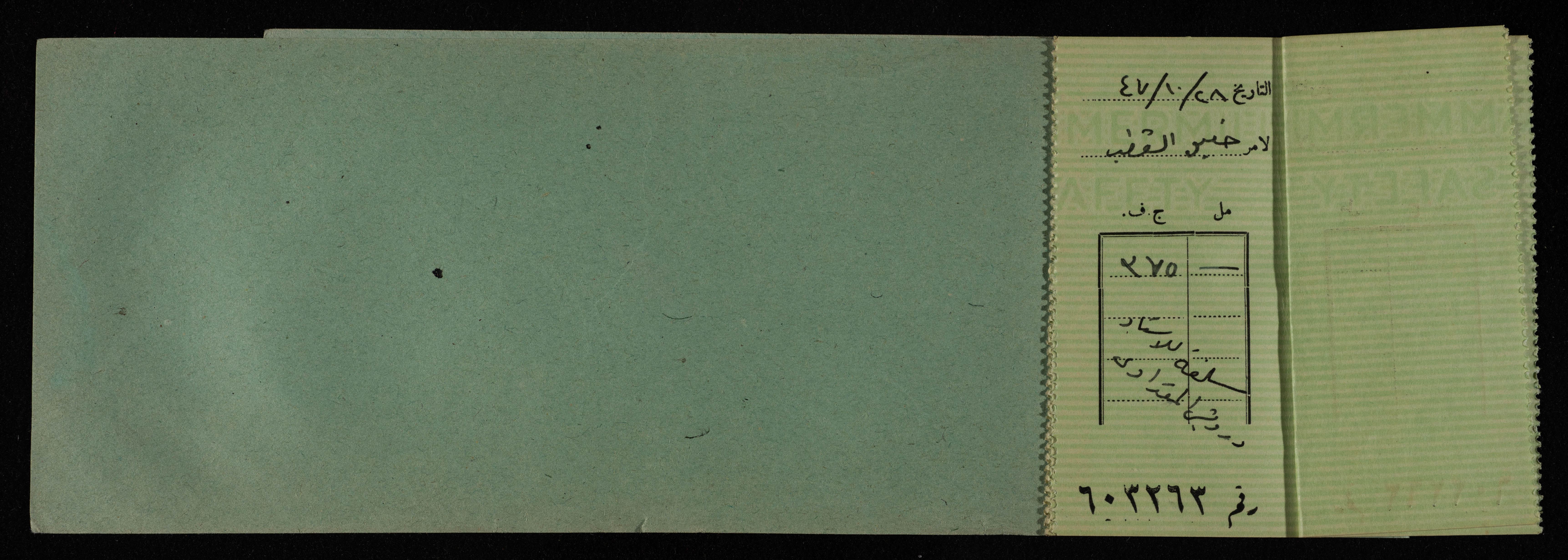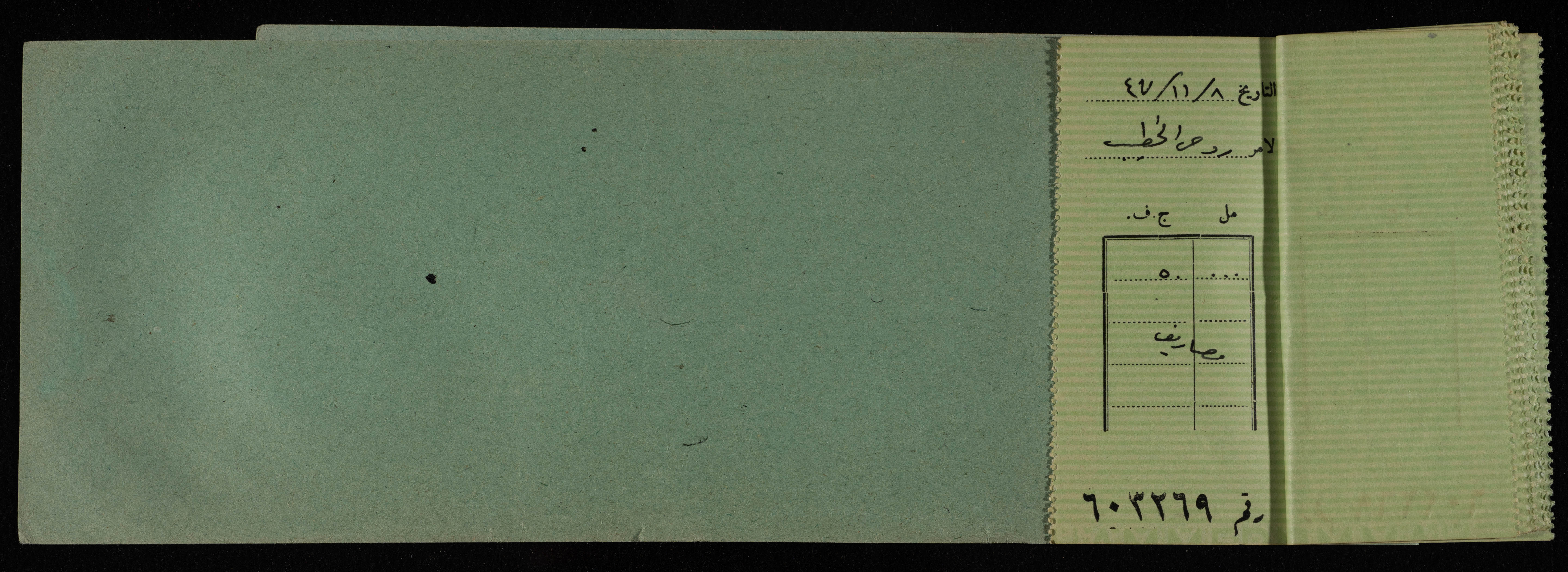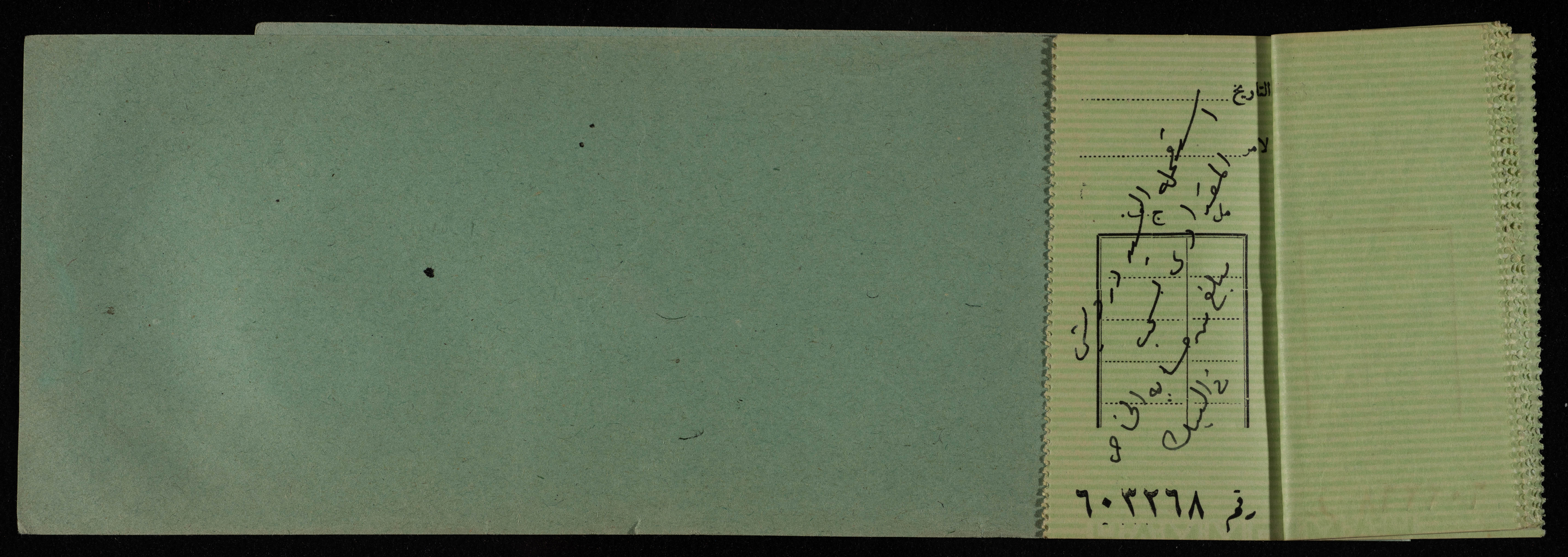 دفتر شيكات صادر عن البنك العربي في القدس بين عامي 1945-49 للمكتب العربي، ووجدت هذه الوثيقة ضمن مجموعة المشروع الإنشائي العربي.