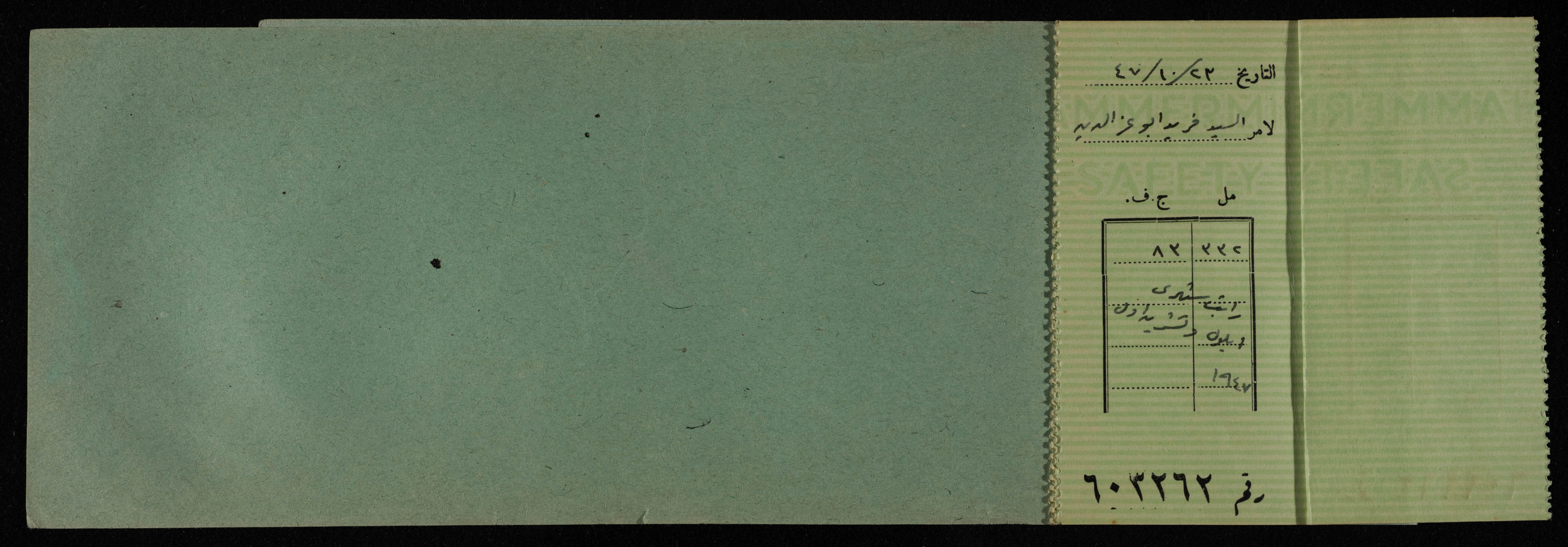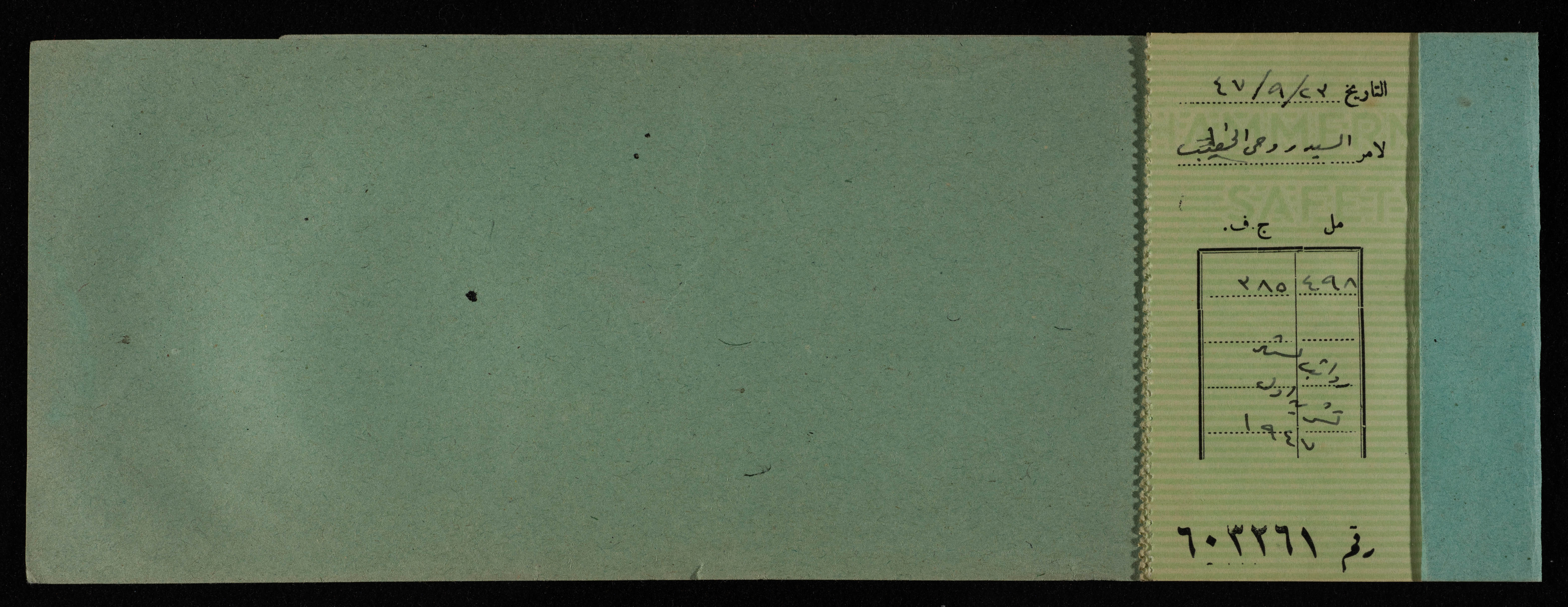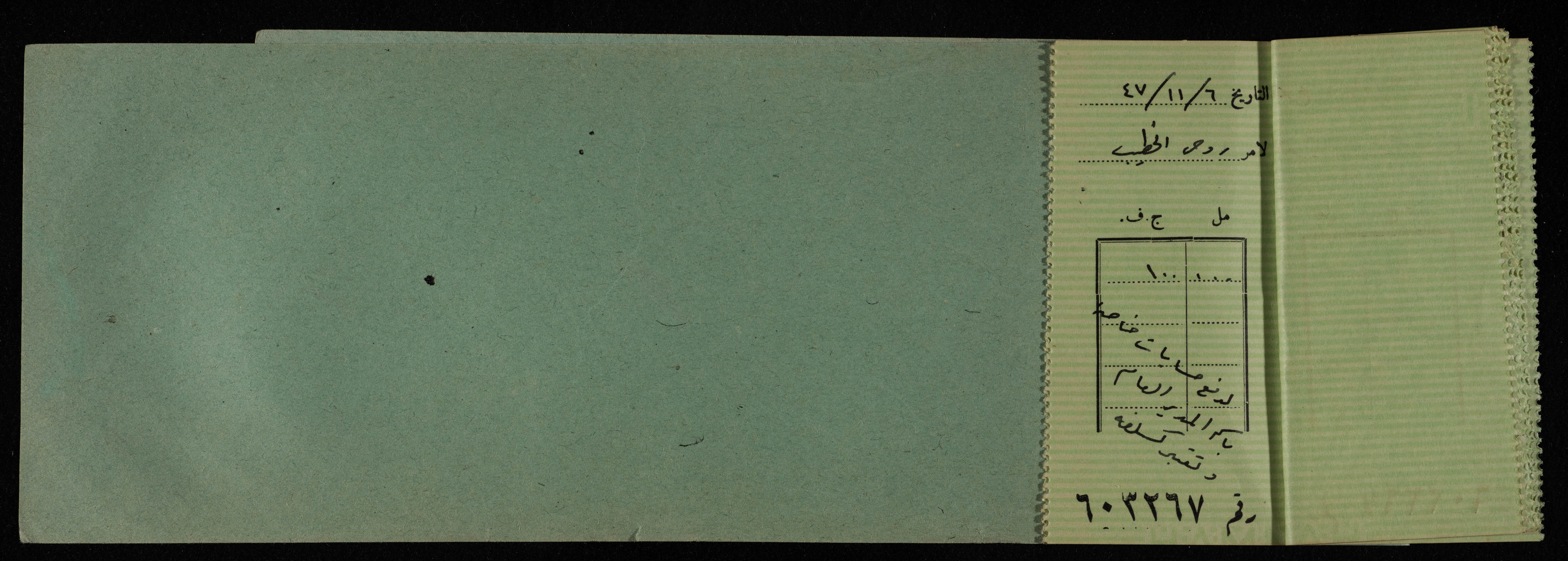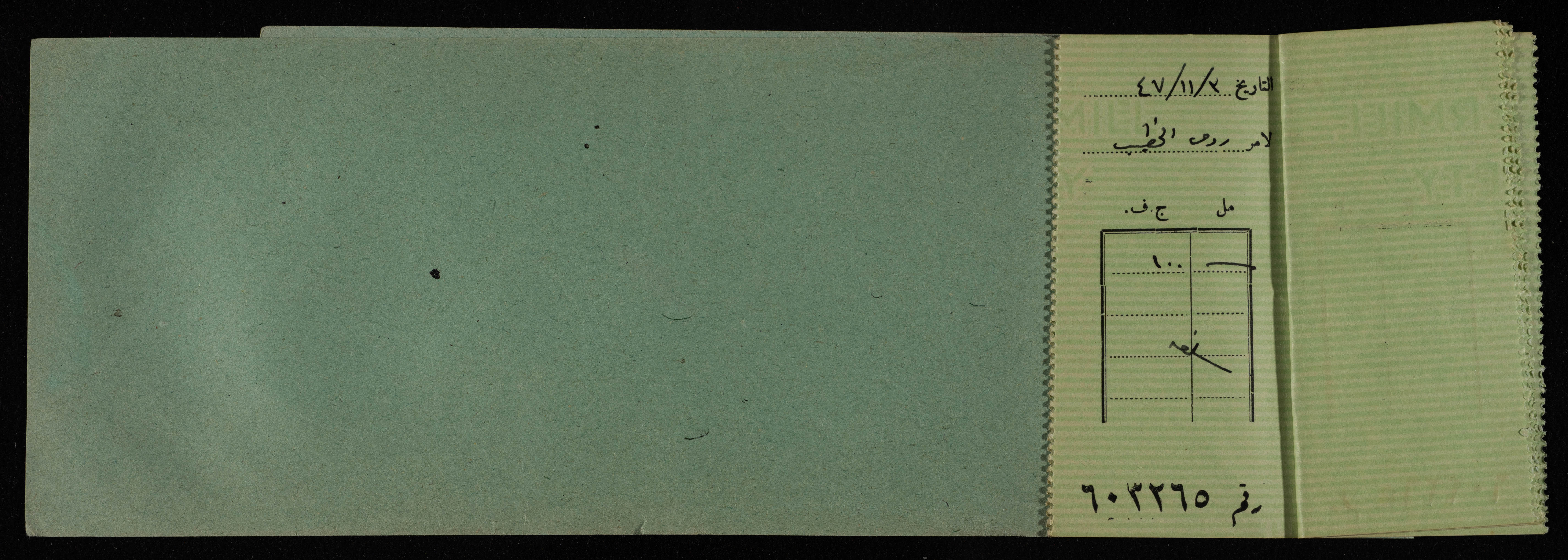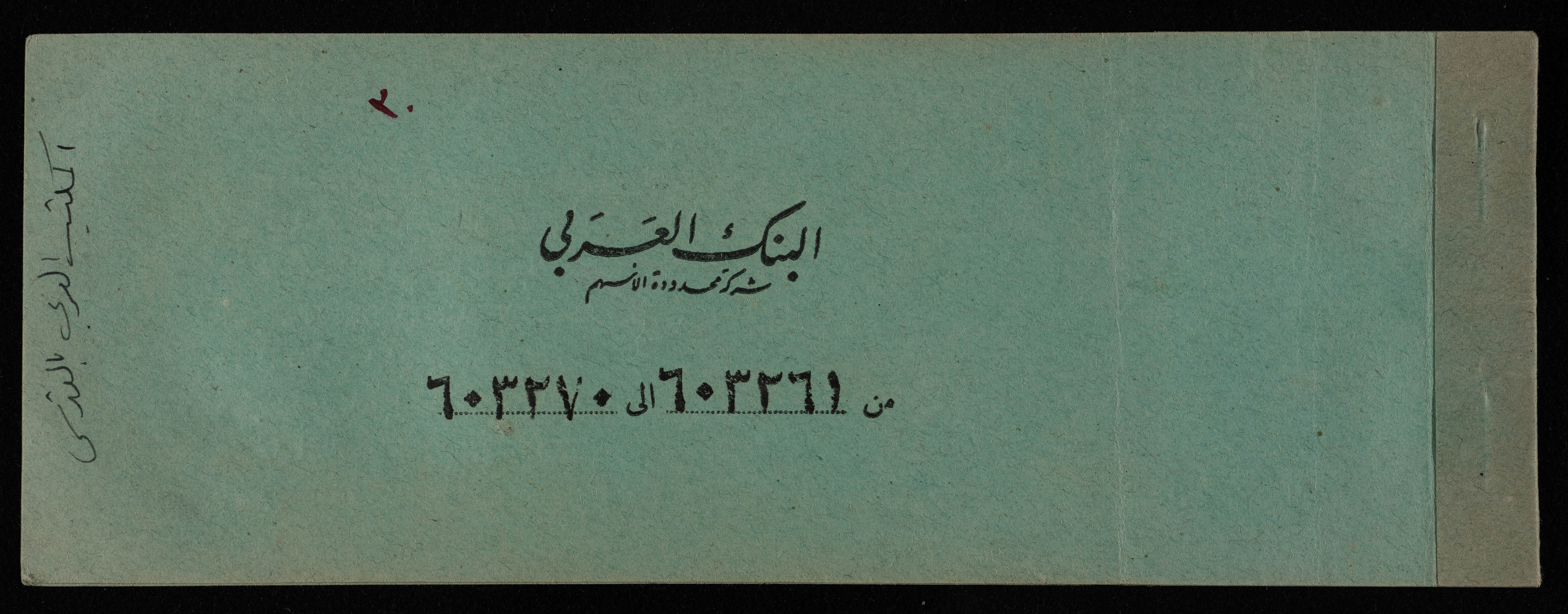 دفتر شيكات باسم المكتب العربي صادر عن البنك العربي، 1945-49