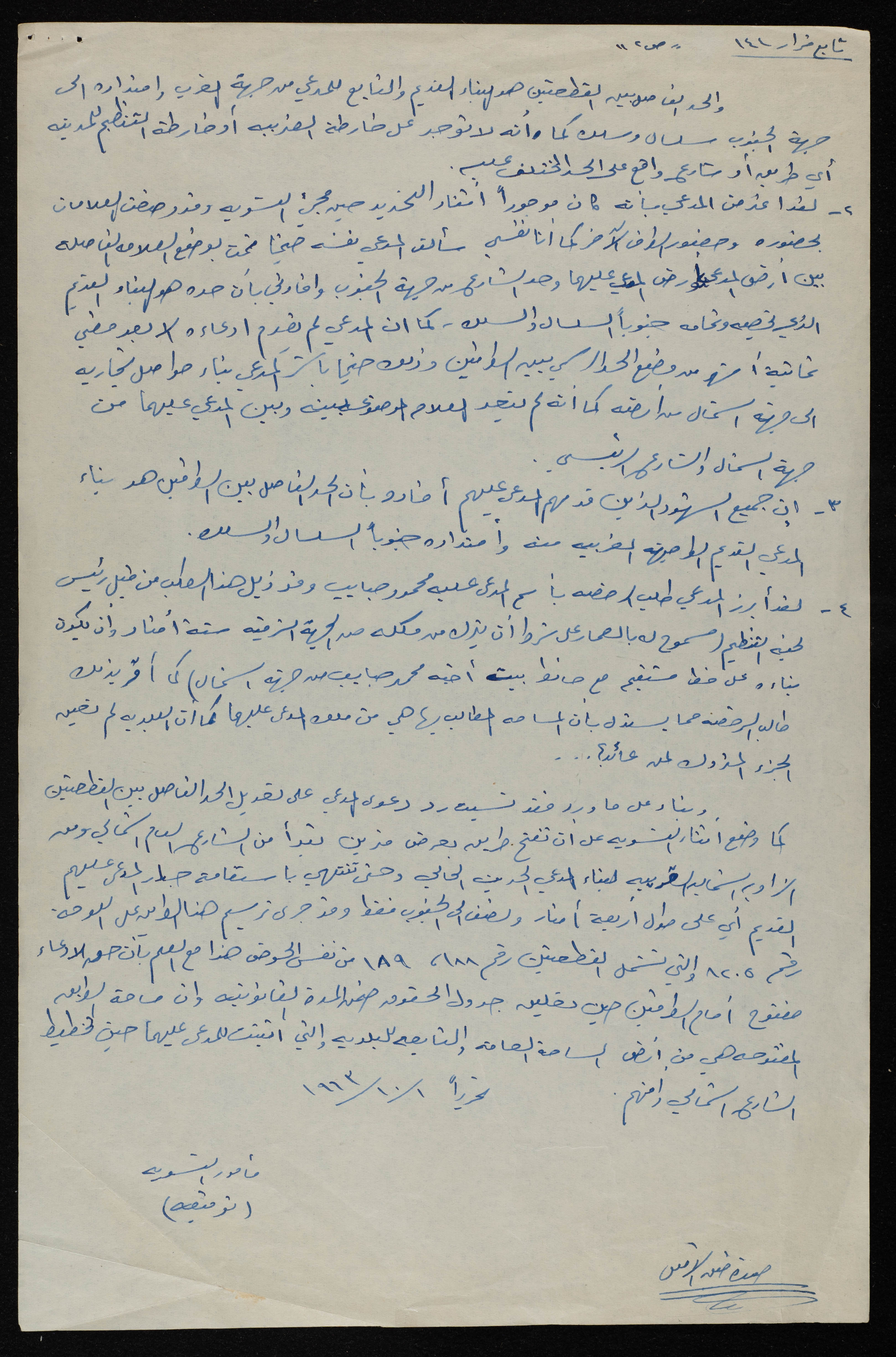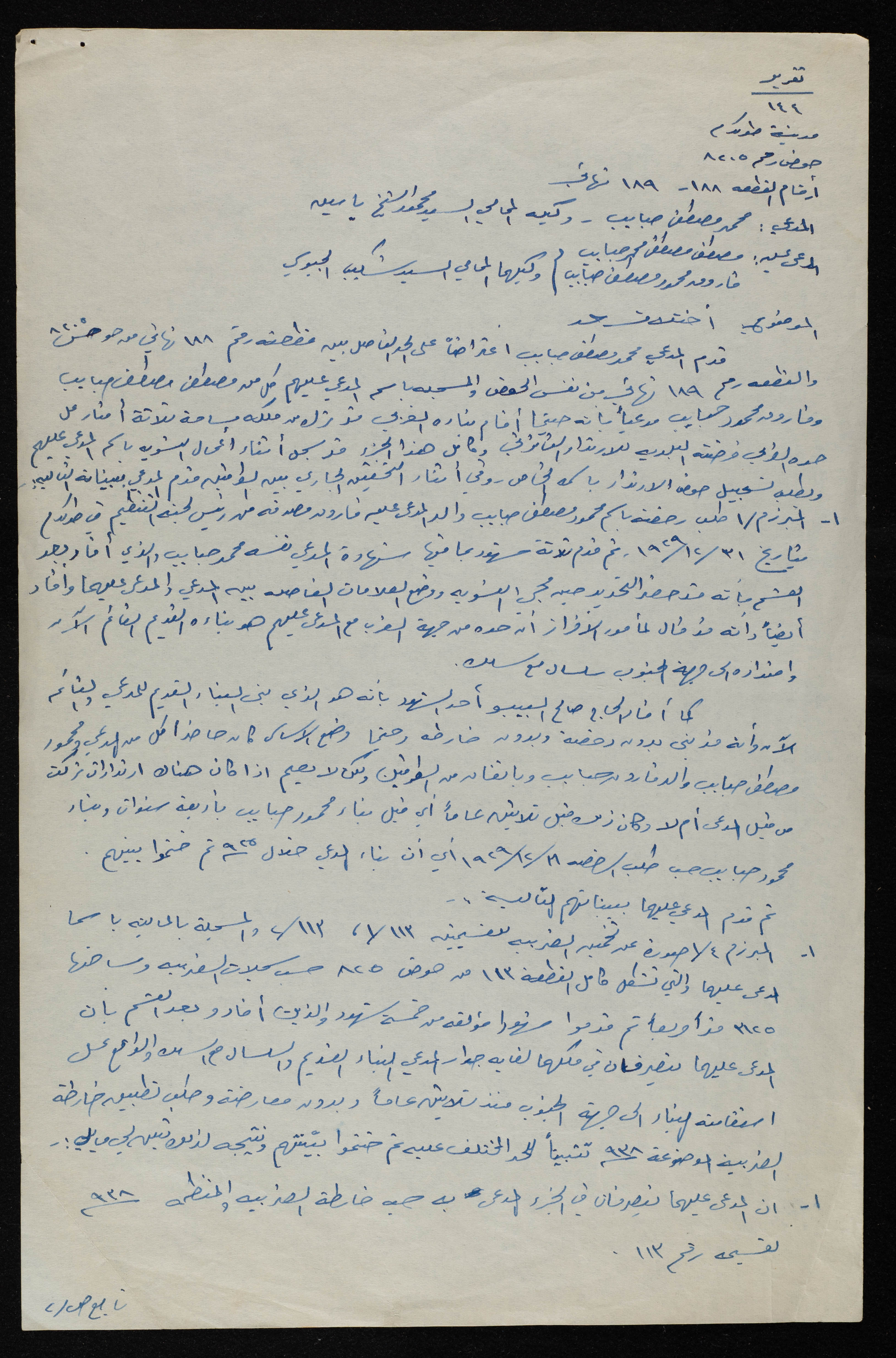 وثيقة مكتوبة باللغة العربية، تتضمن تقرير عن خلاف بين المدعي محمد مصطفى حبايب والمدعي عليه مصطفى مصطفى محمد حبايب من مدينة طولكرم