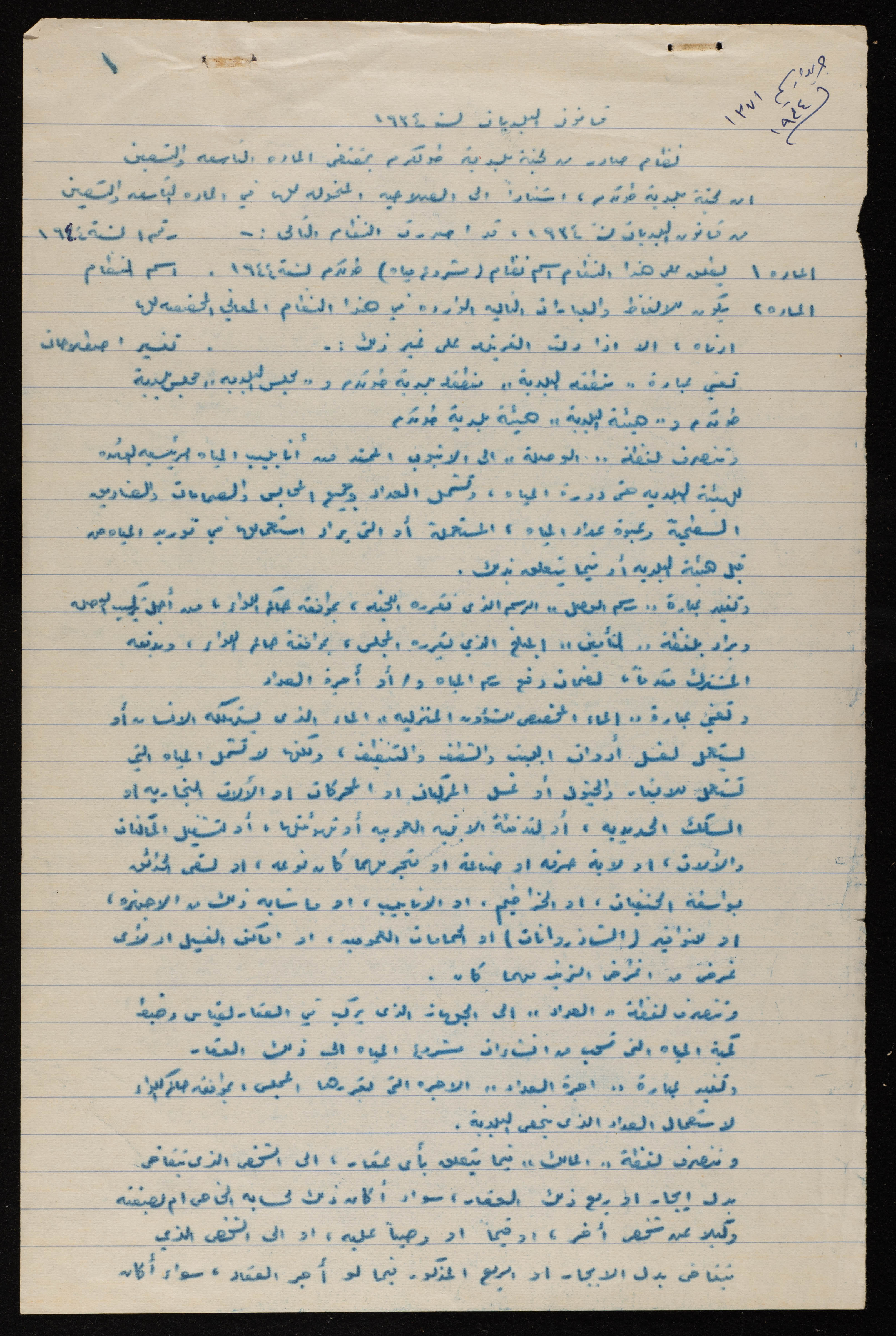 نموذج طلب لتوريد المياه من قبل بلدية طولكرم عام 1955