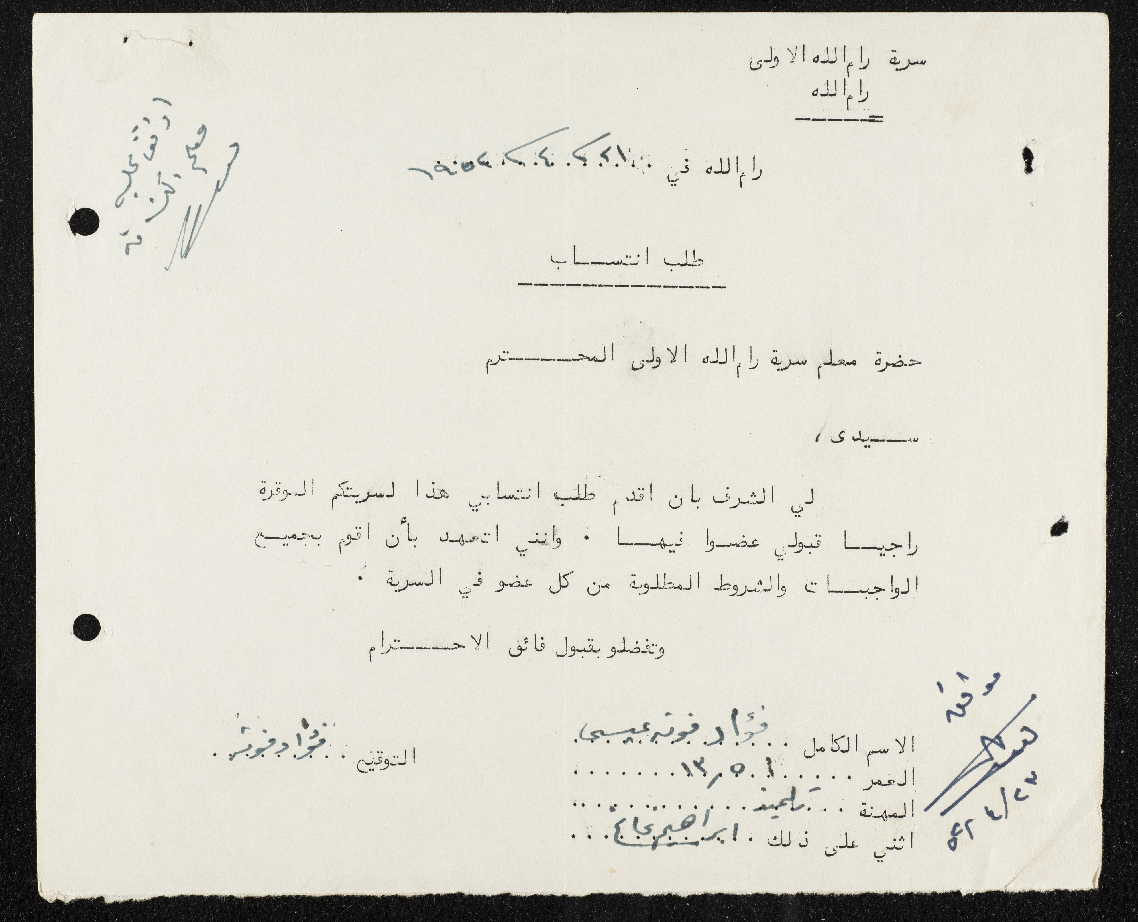 وثيقة مطبوعة باللغة العربية، تتضمن طلب انتساب مقدم من فؤاد عيسى الى سرية رام الله ليصبح عضوا فيها ويتعهد في القيام بجميع الاعمال والواجبات والشروط المطلوبة عام 1952