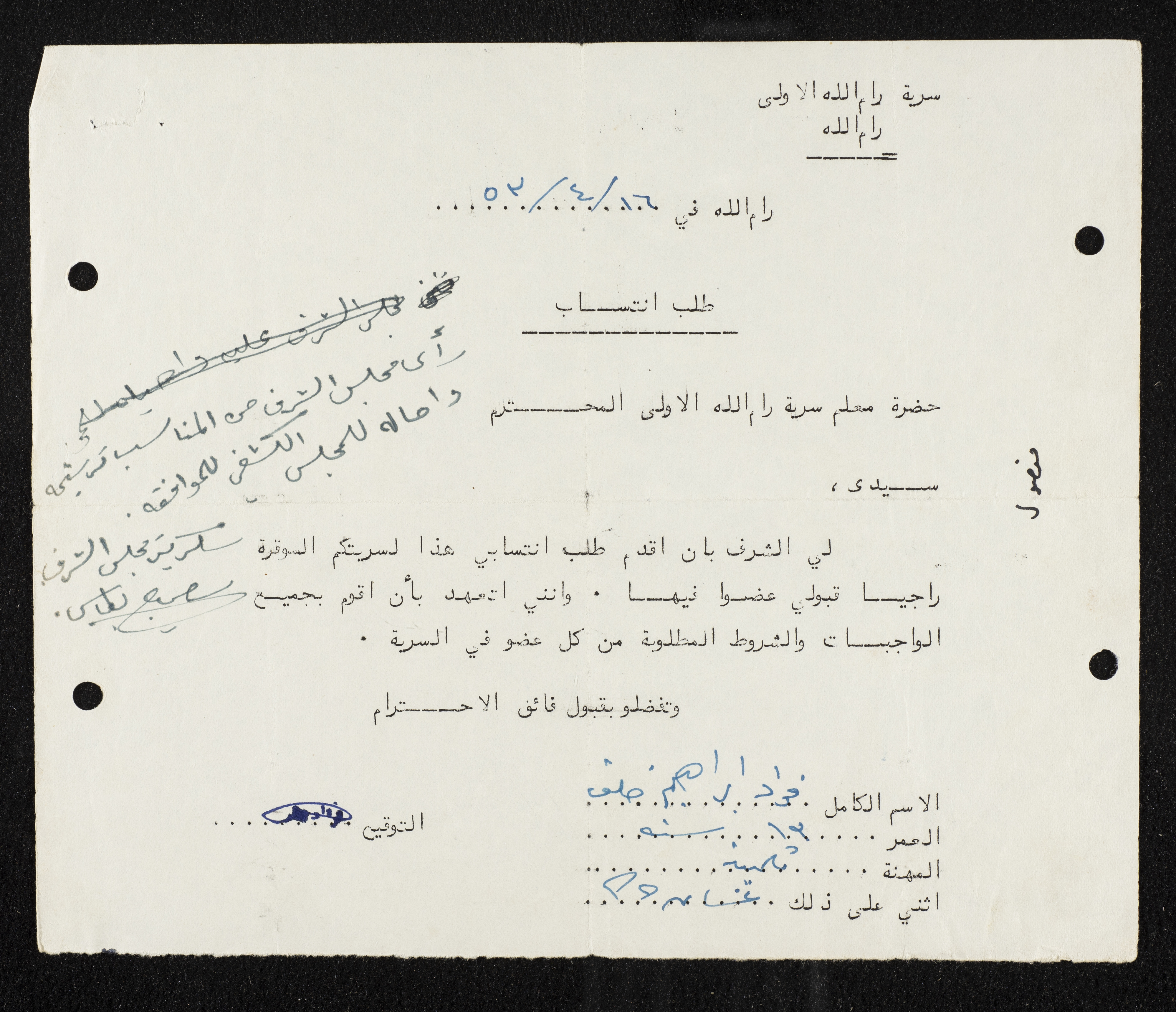طلب انتساب الى سرية رام الله الاولى عام 1953