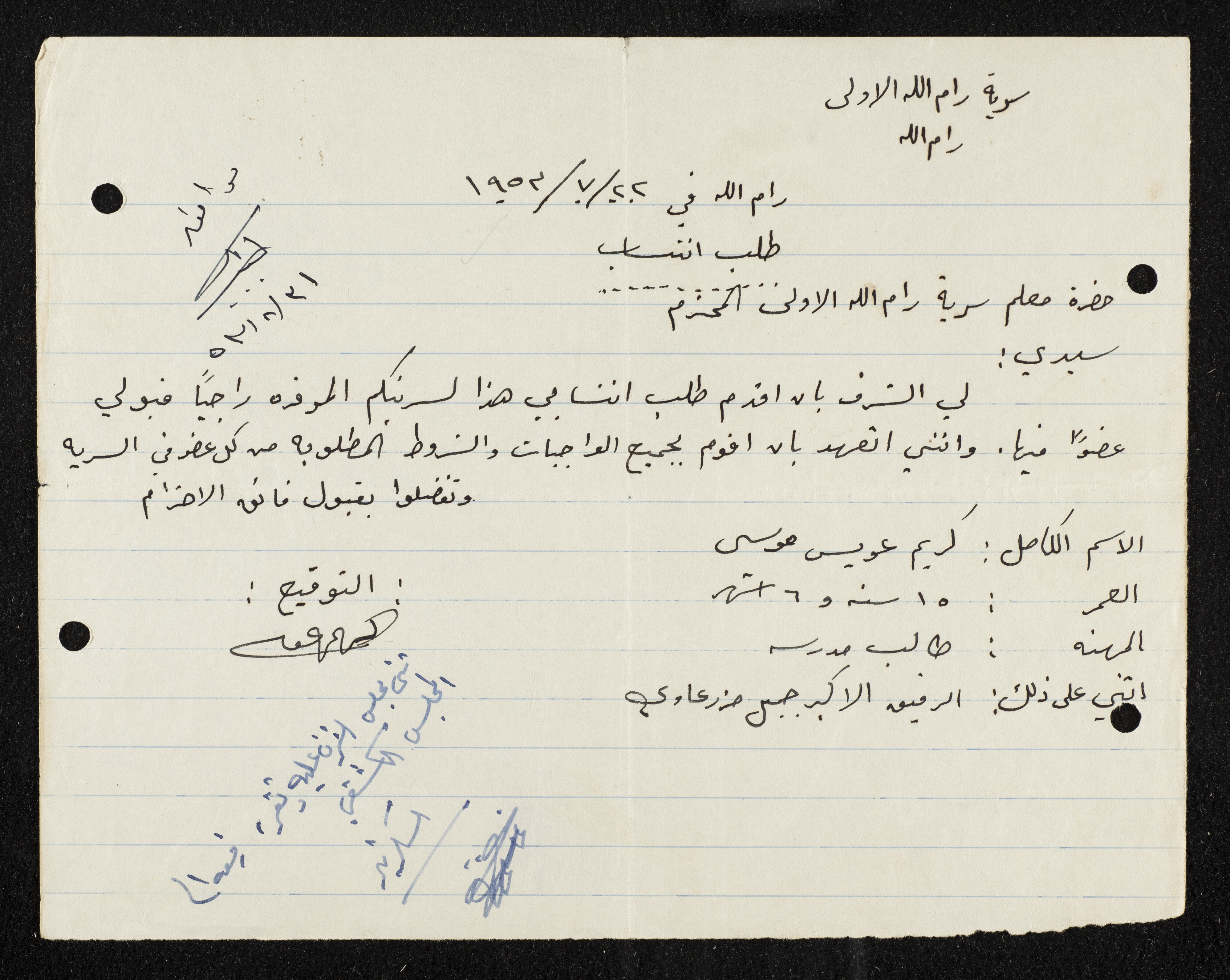 طلب انتساب الى سرية رام الله الاولى عام 1953