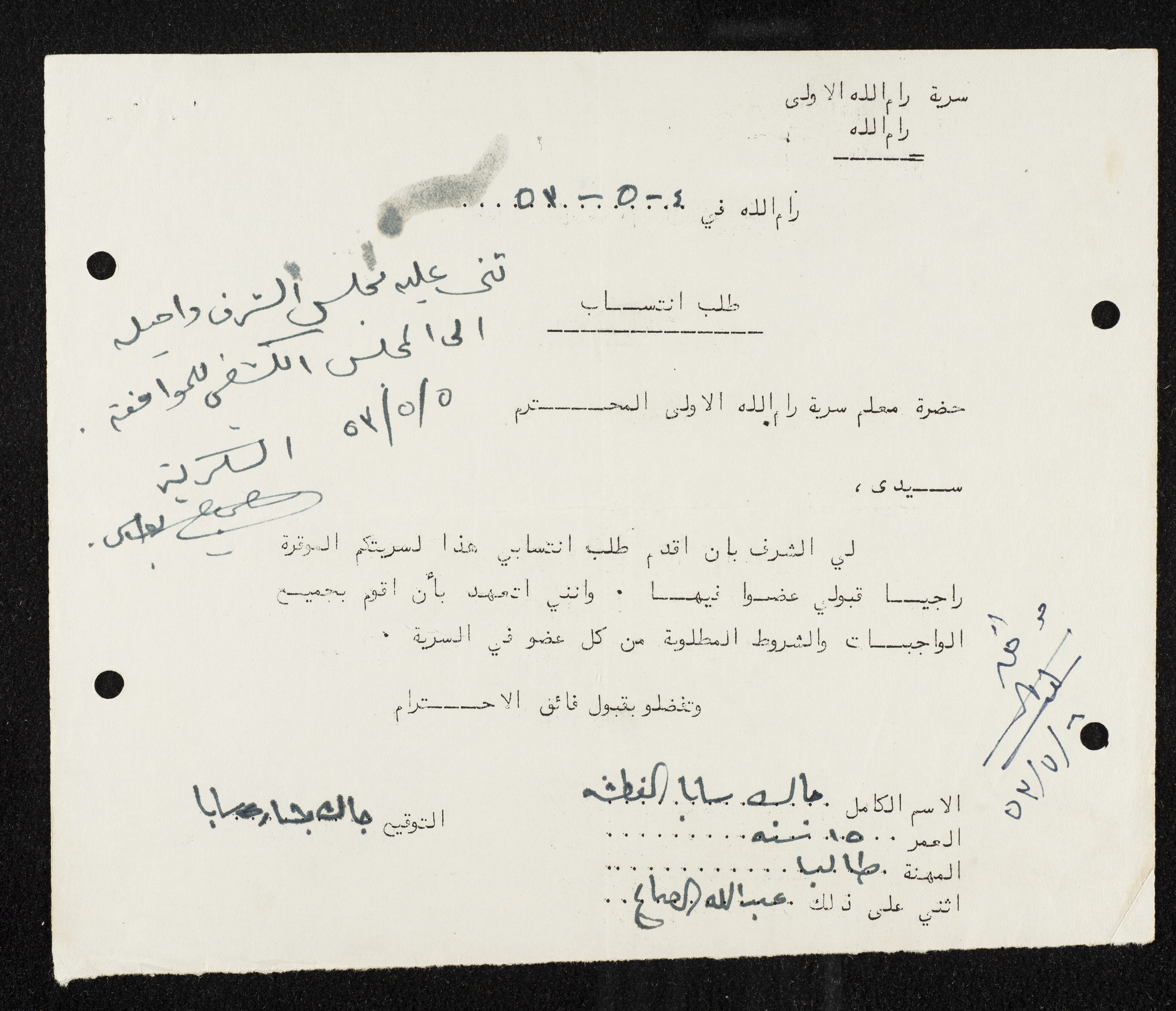 طلب انتساب الى سرية رام الله الاولى عام 1953