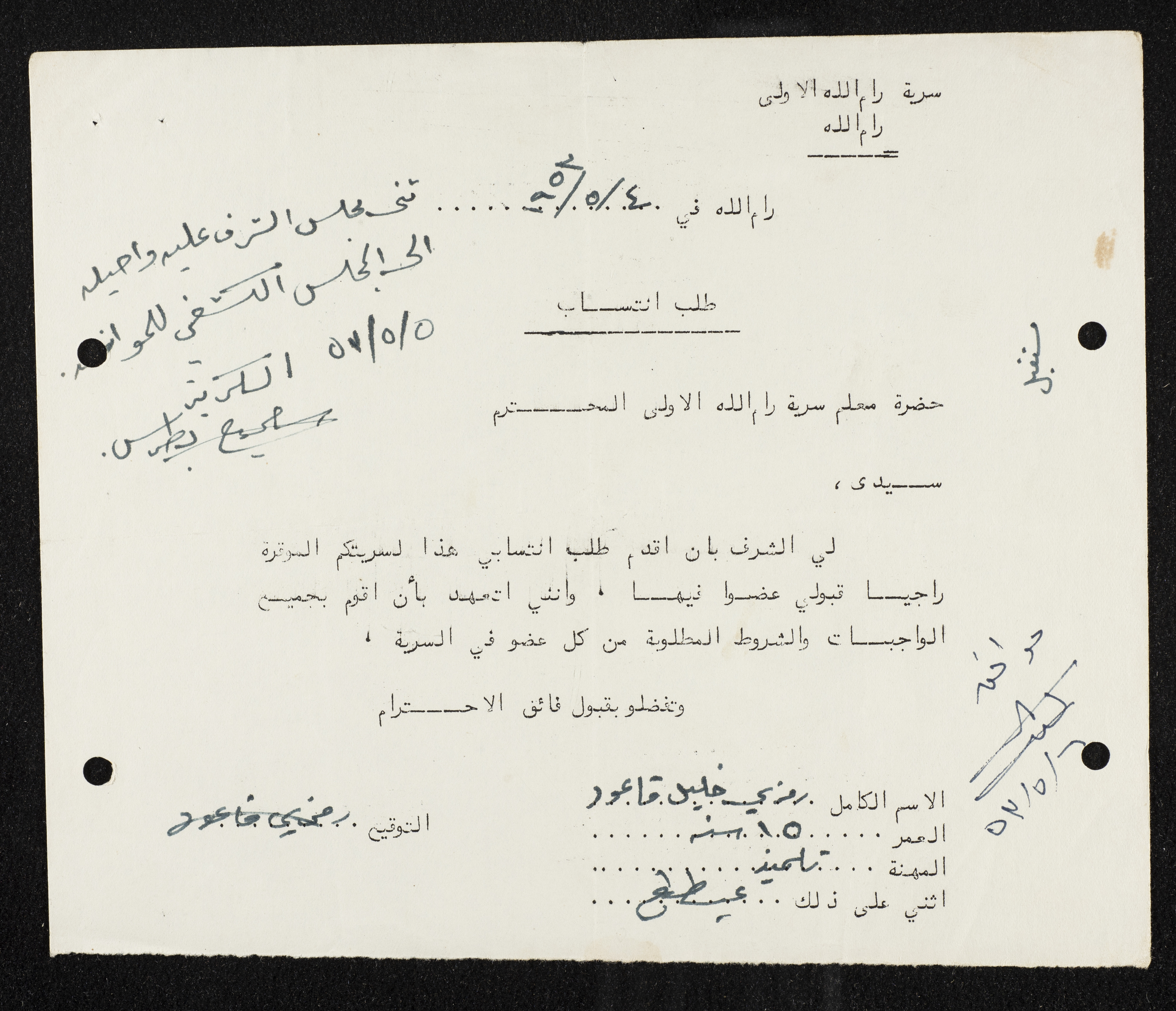 طلب انتساب الى سرية رام الله الاولى عام 1953