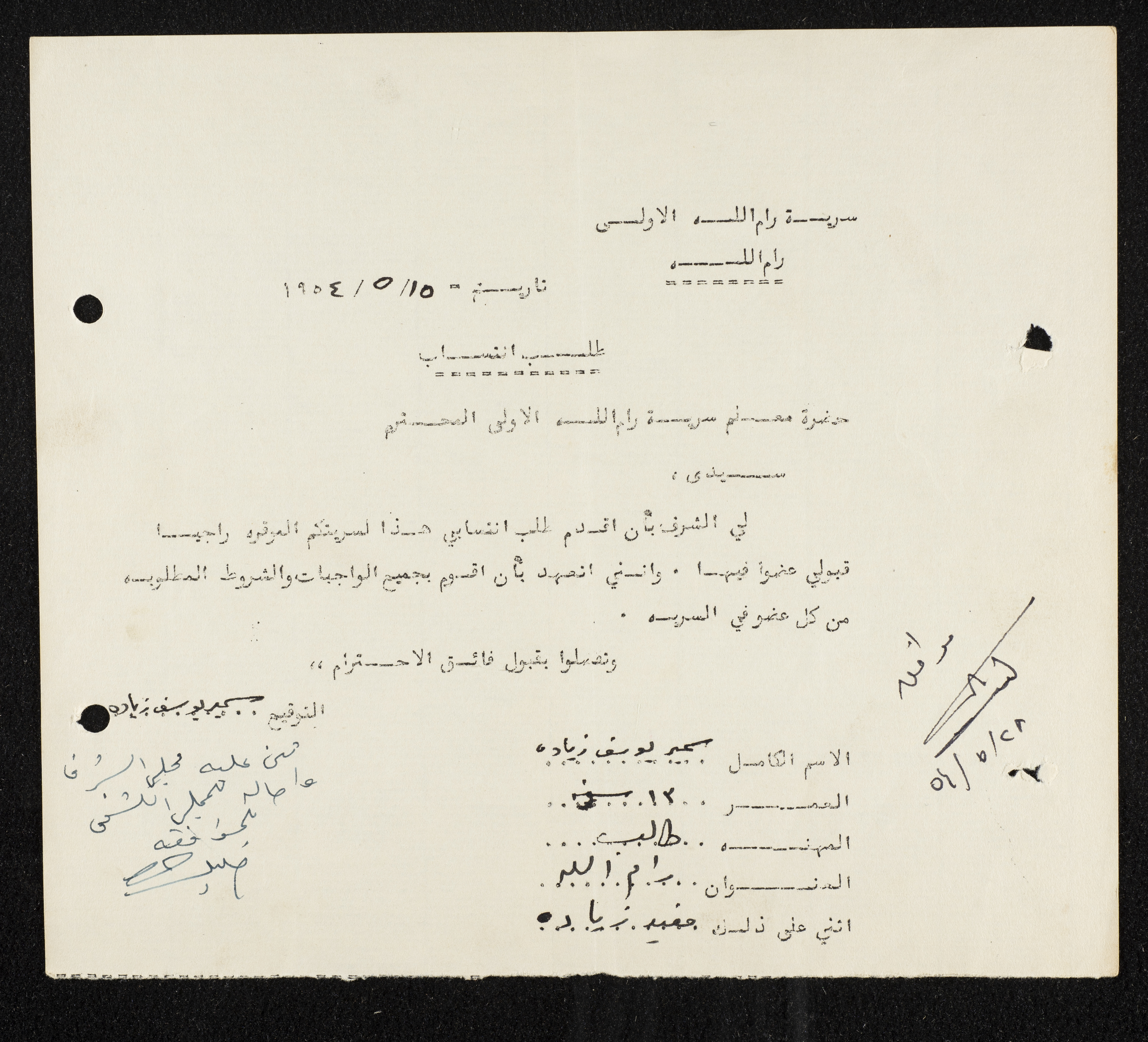 وثيقة مطبوعة باللغة العربية، تتضمن طلب انتساب مقدم من سمير يوسف زيادة الى سرية رام الله ليصبح عضوا فيها ويتعهد في القيام بجميع الاعمال والواجبات والشروط المطلوبة عام 1954