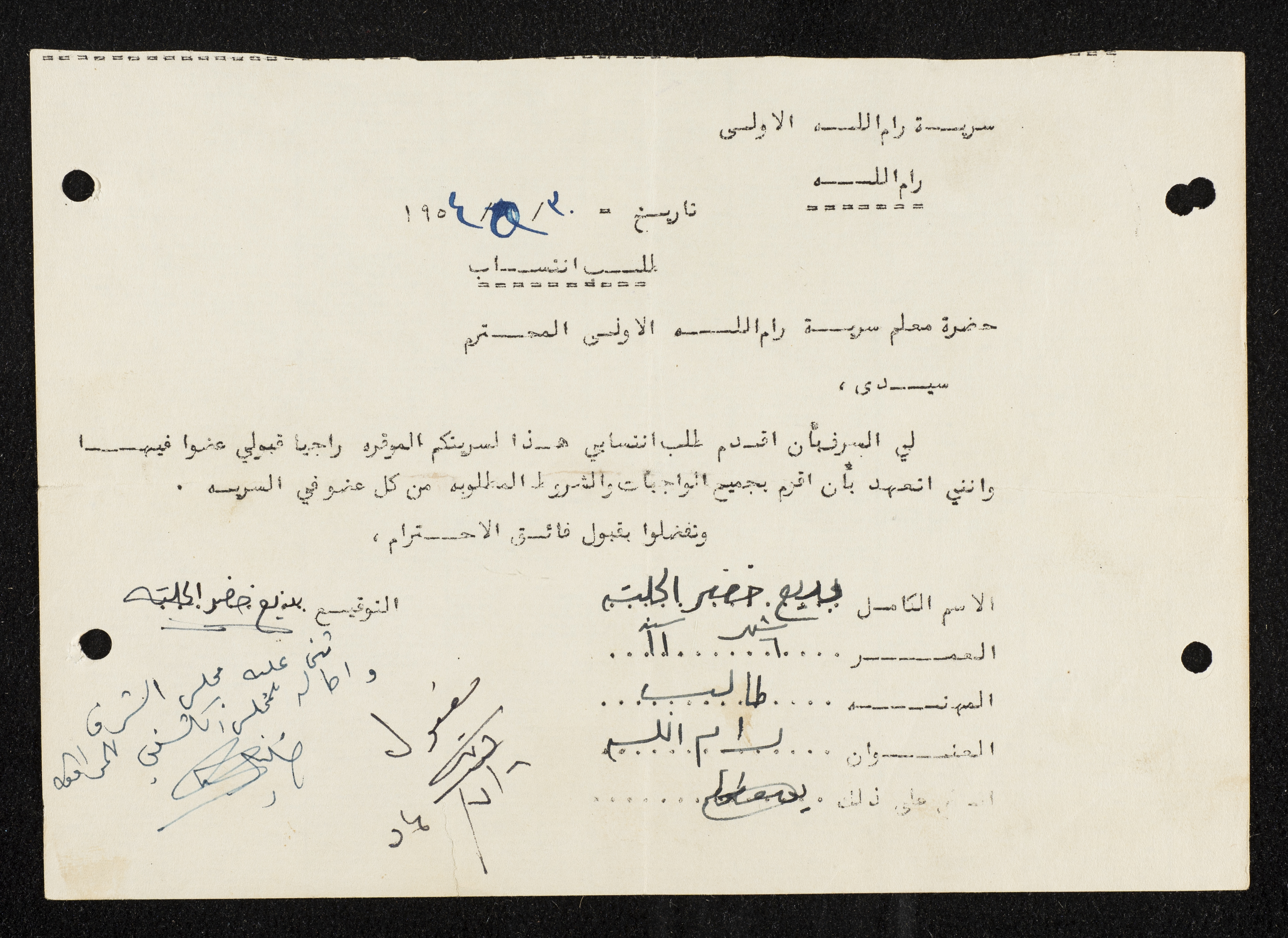 طلب انتساب الى سرية رام الله الاولى عام 1954