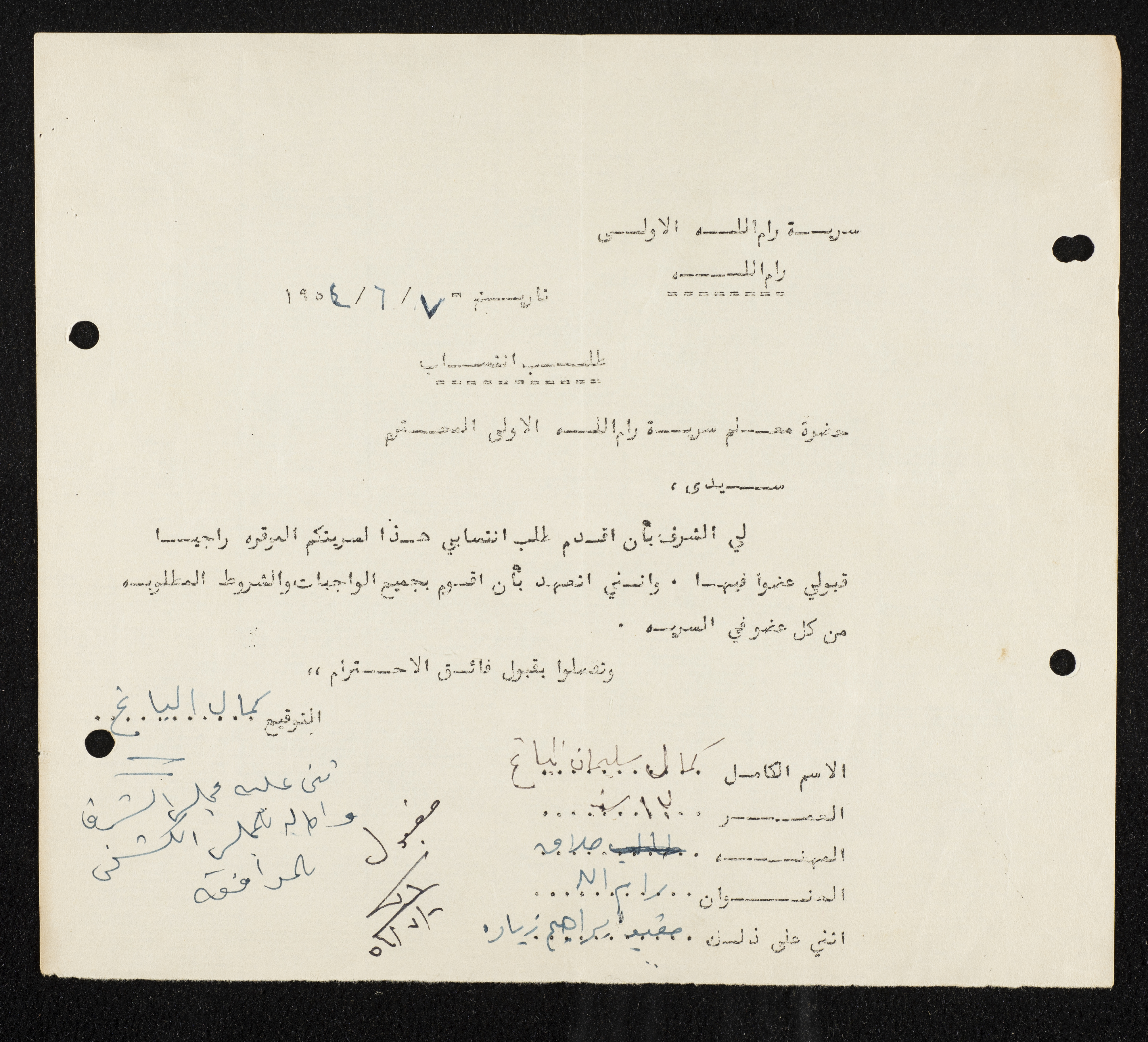 طلب انتساب الى سرية رام الله الاولى عام 1954