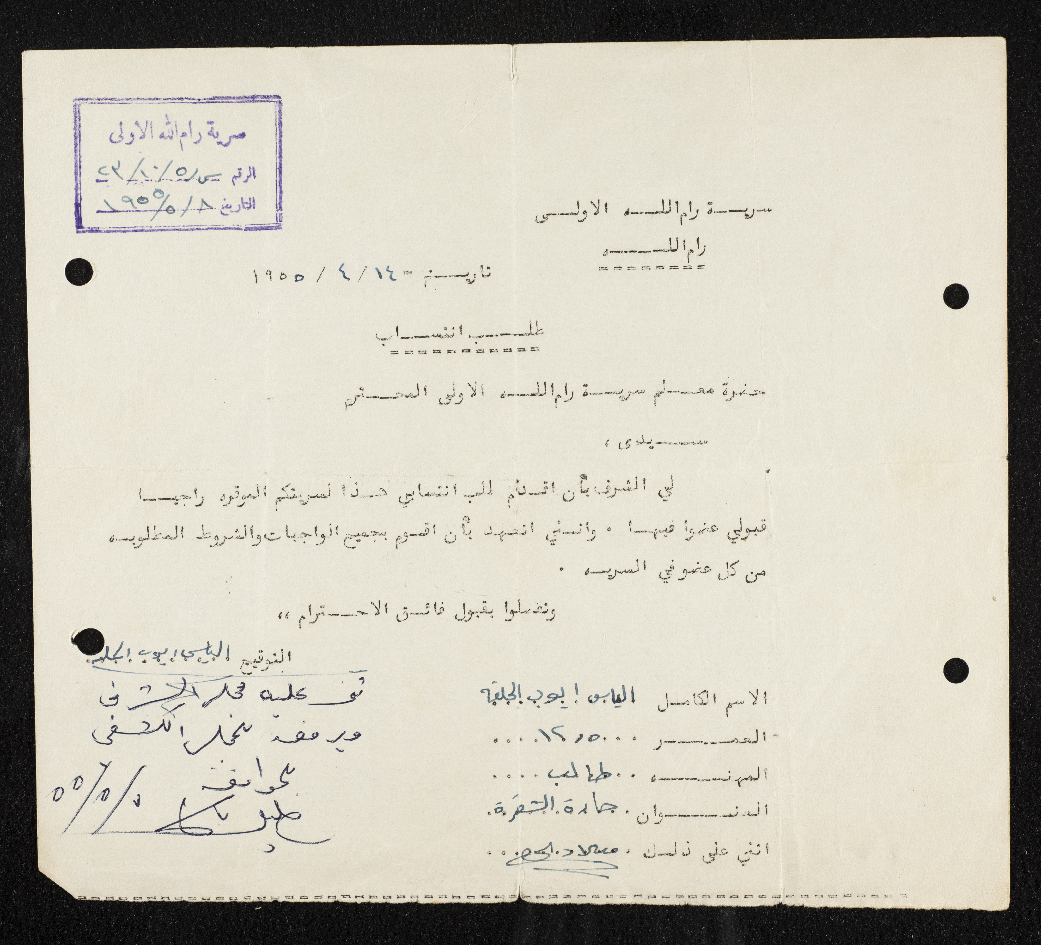 طلب انتساب الى سرية رام الله الاولى عام 1955