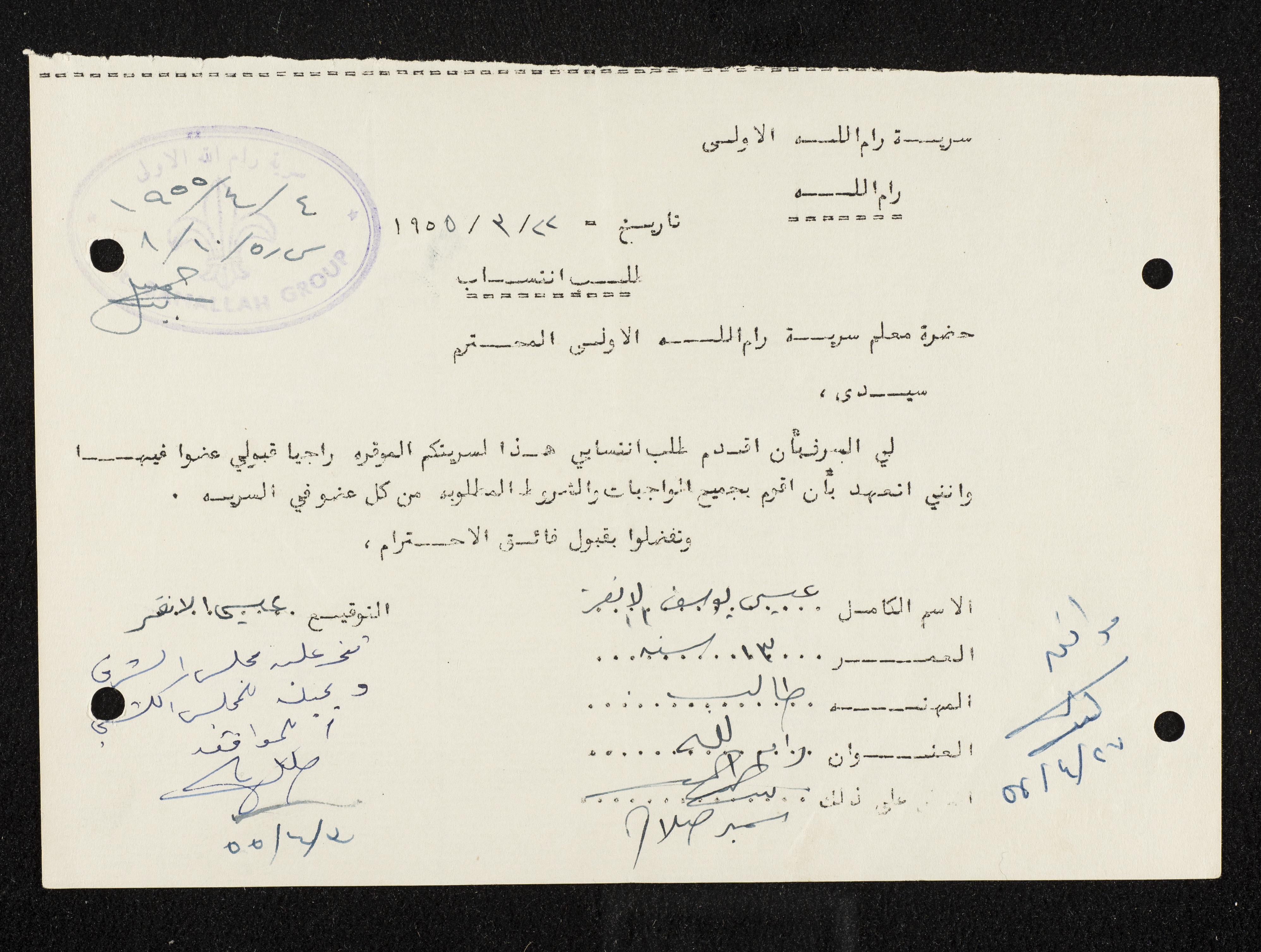 طلب انتساب الى سرية رام الله الاولى عام 1955